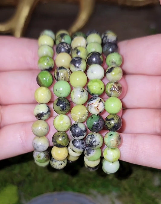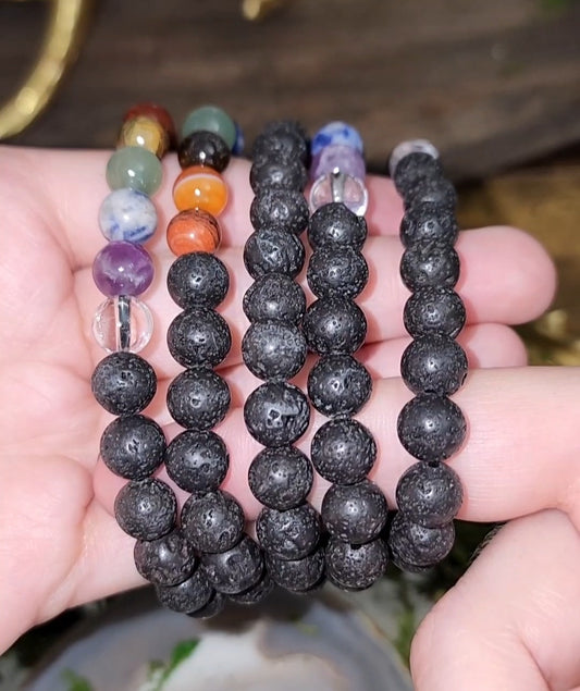 Gemstone and crystal stretch bracelets in many shapes, sizes, and materials. The stones are strung on elastic cords and feature no metal.