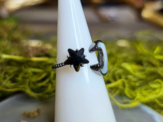 White Shell Moon and Black Spinel Star Ring