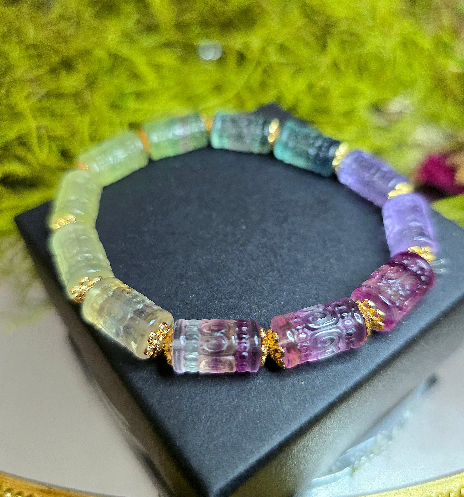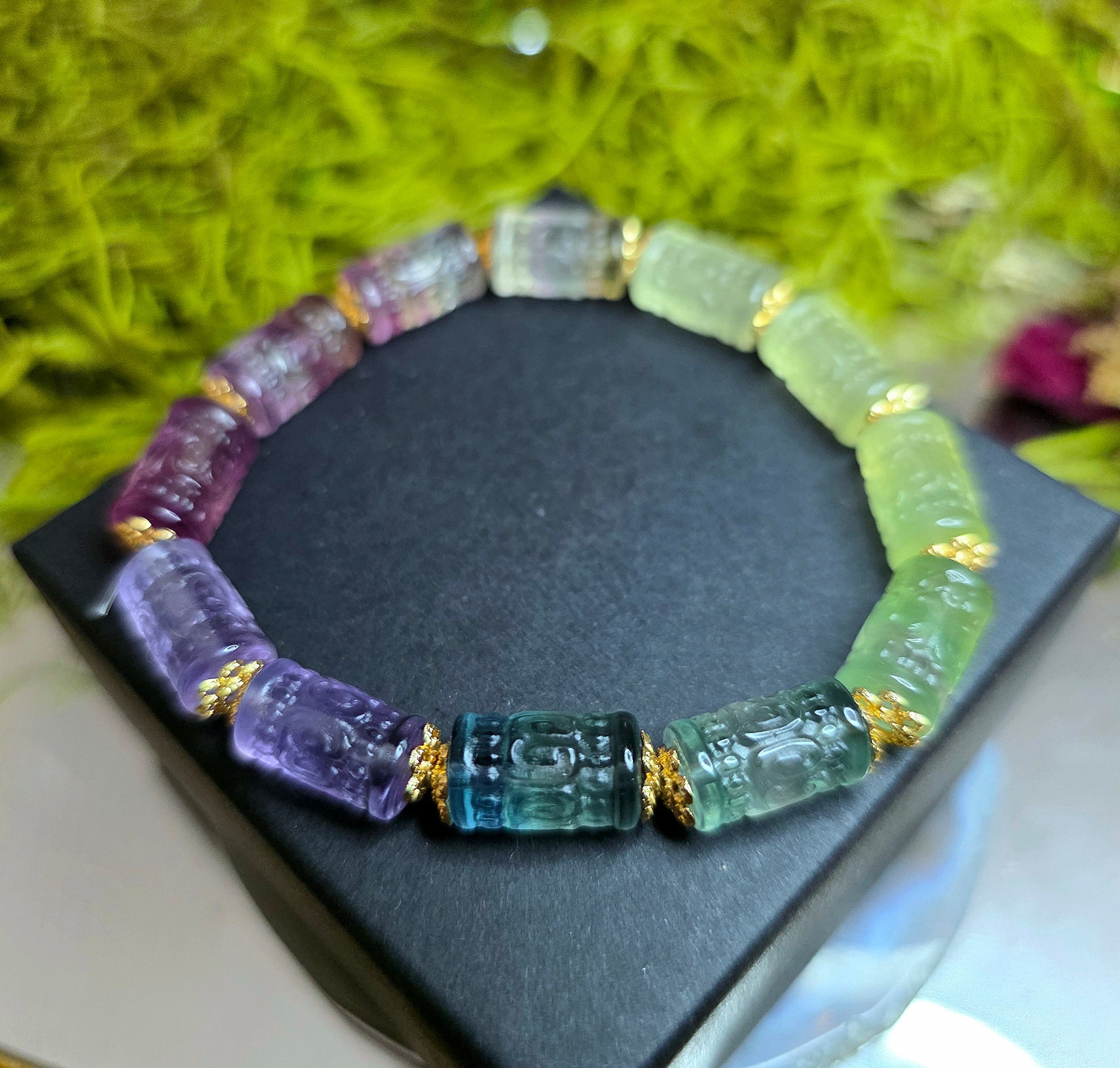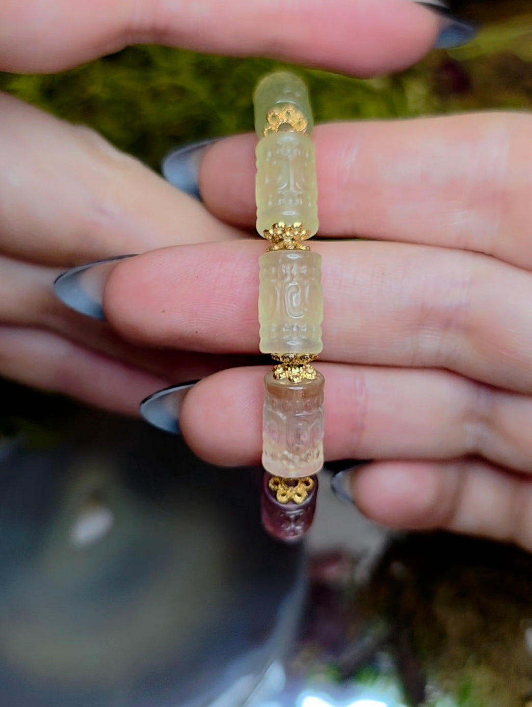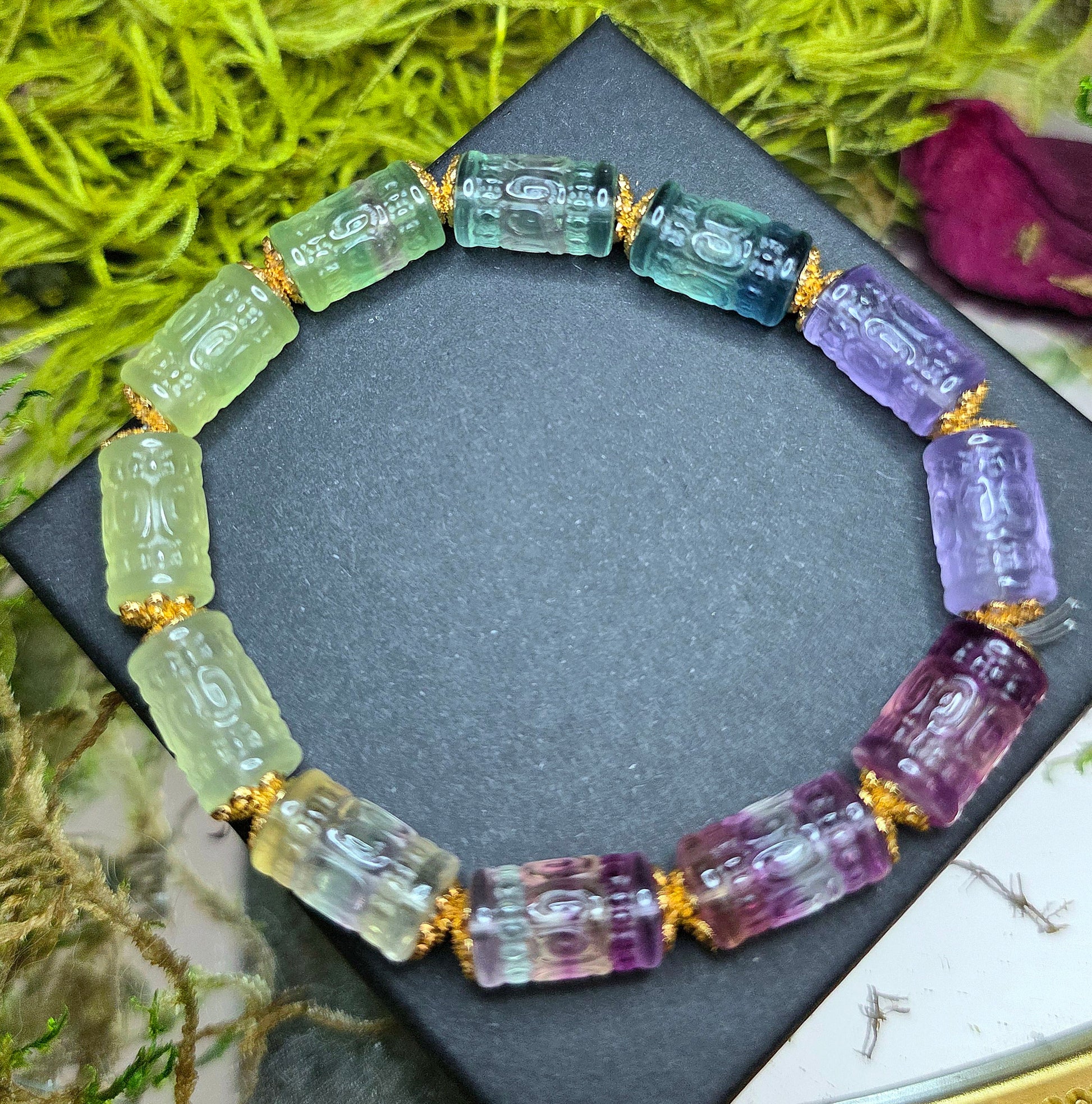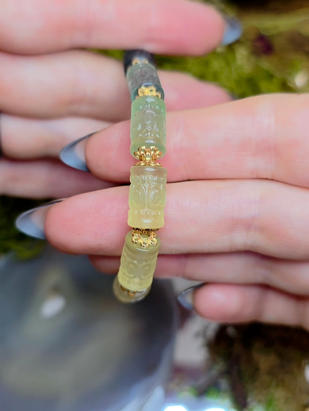 Each stone is approximately 13x7mm, carved, and is strung on an elastic cord, making it suitable for wrists of all sizes. This bracelet also features gold plated alloy spacers.