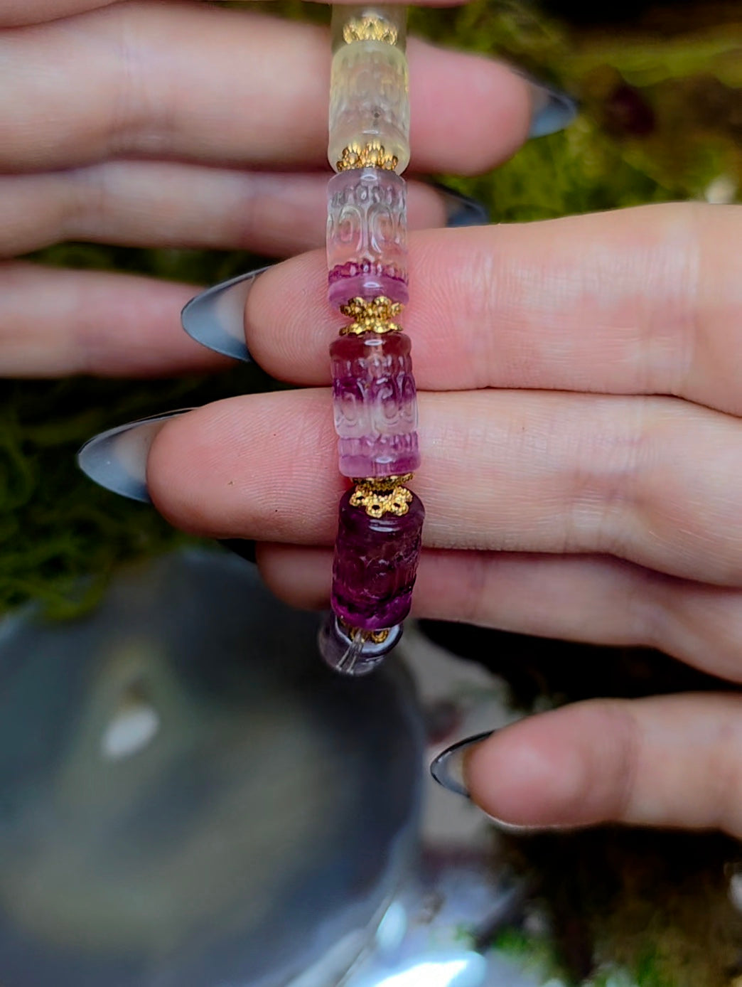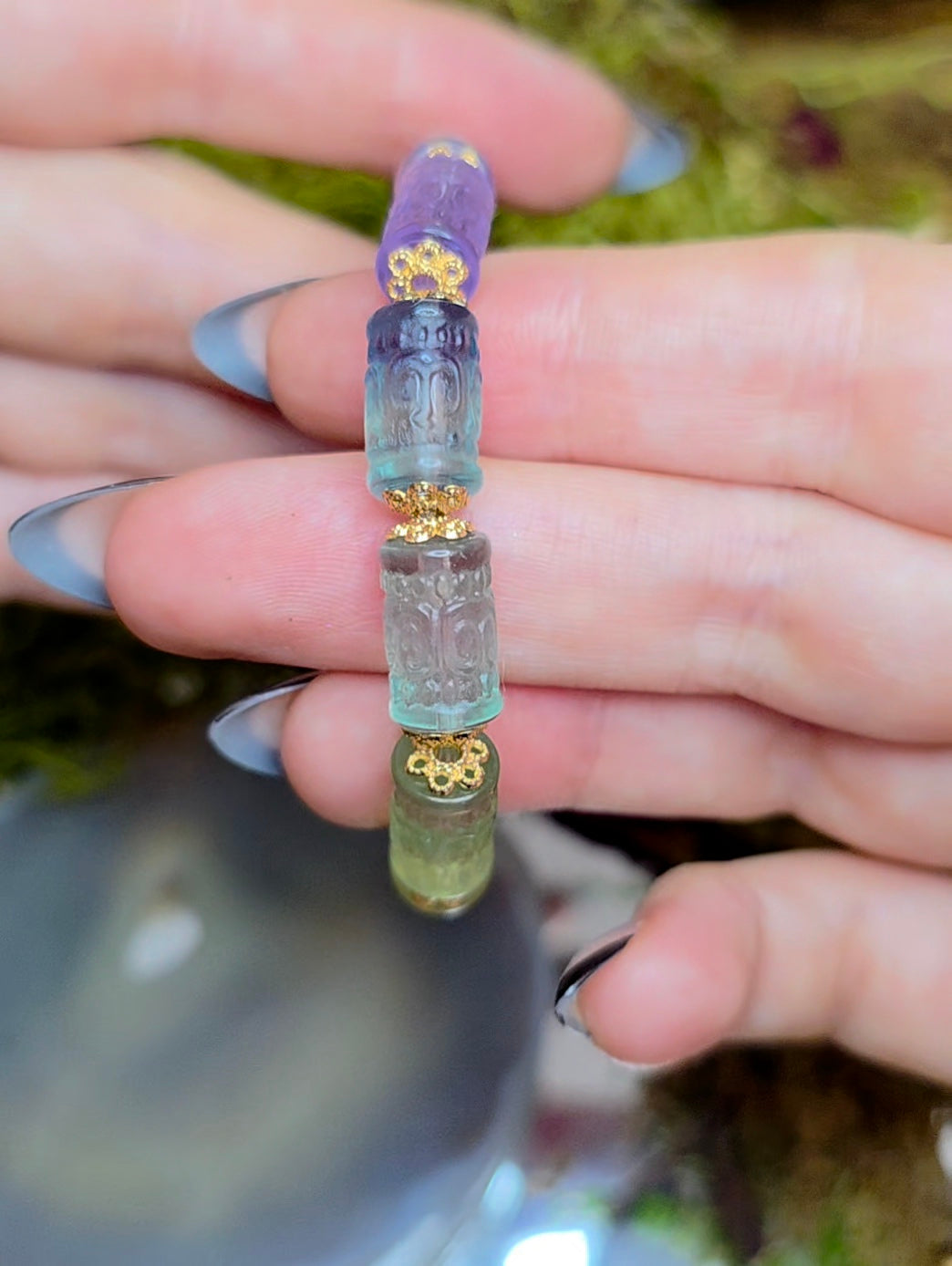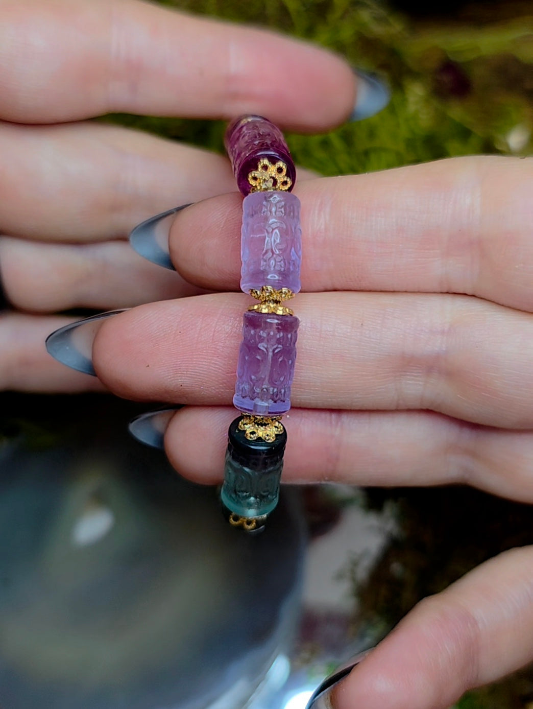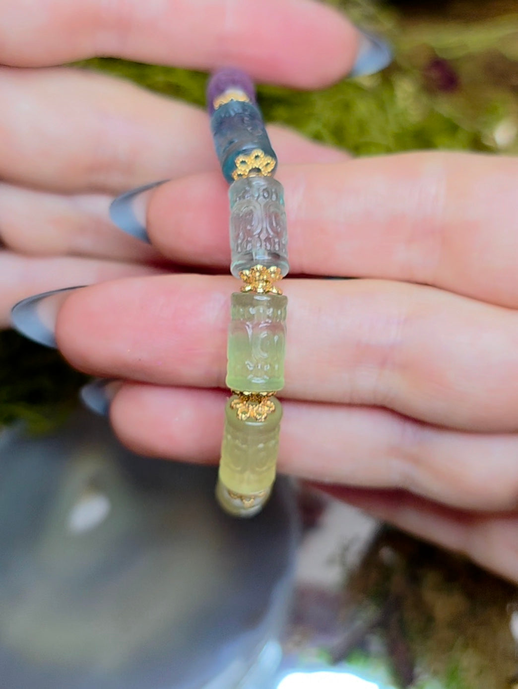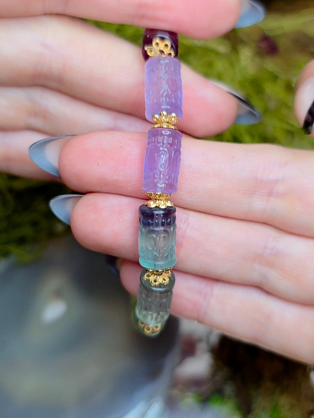 Each stone is approximately 13x7mm, carved, and is strung on an elastic cord, making it suitable for wrists of all sizes. This bracelet also features gold plated alloy spacers.