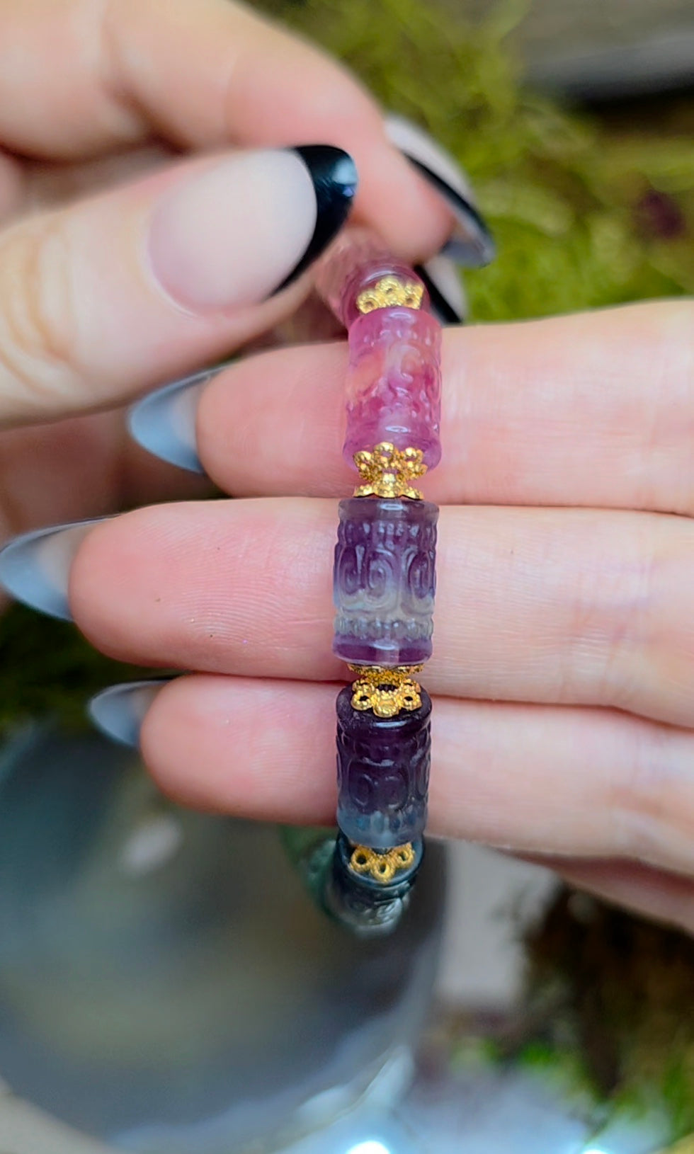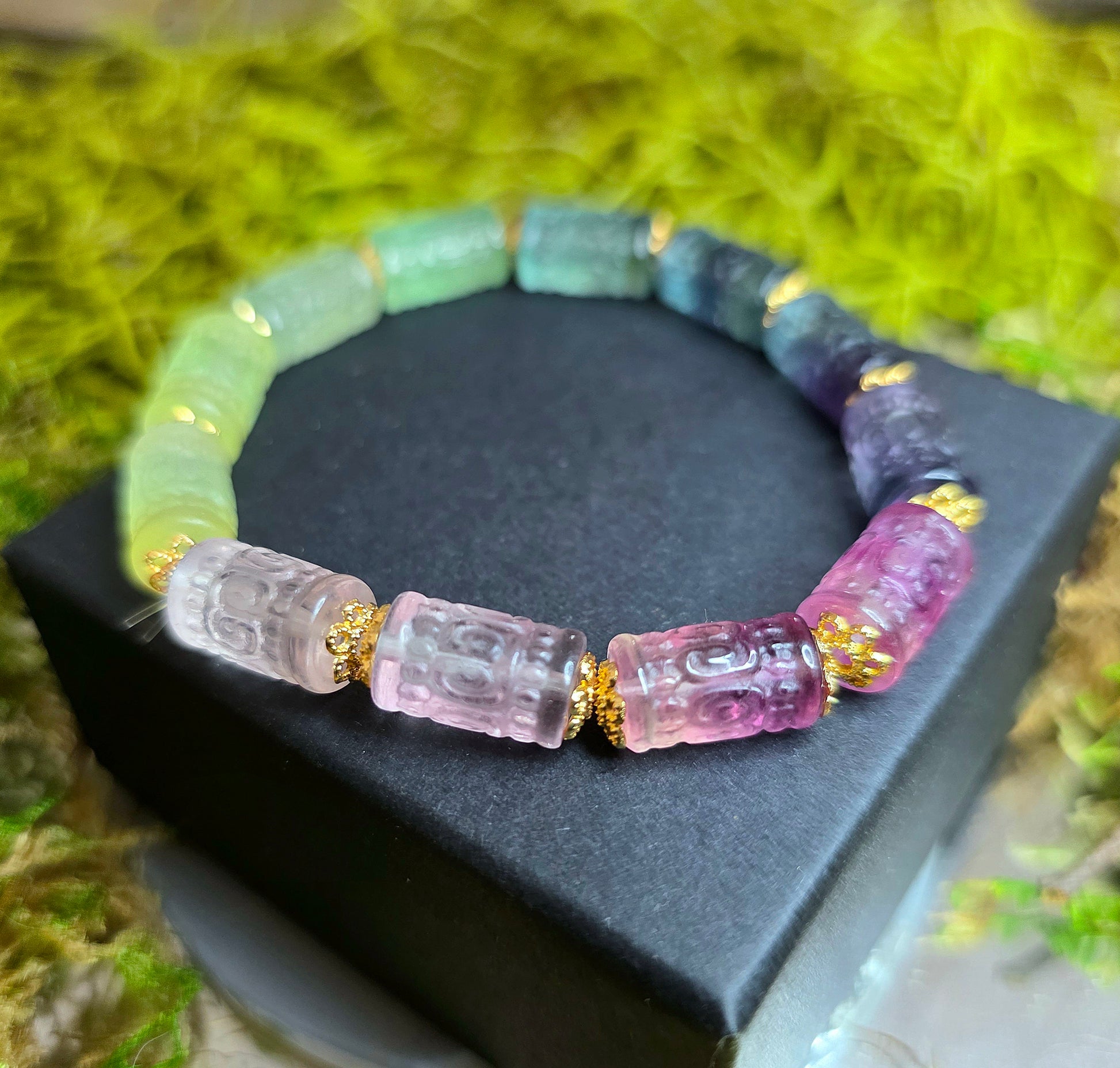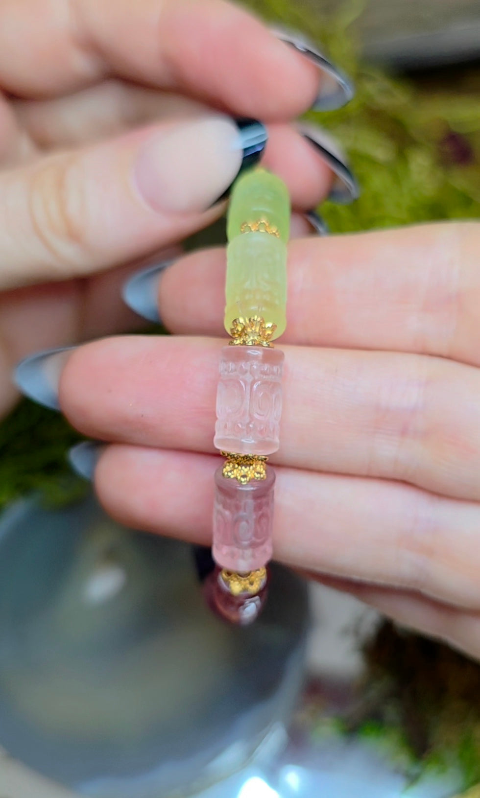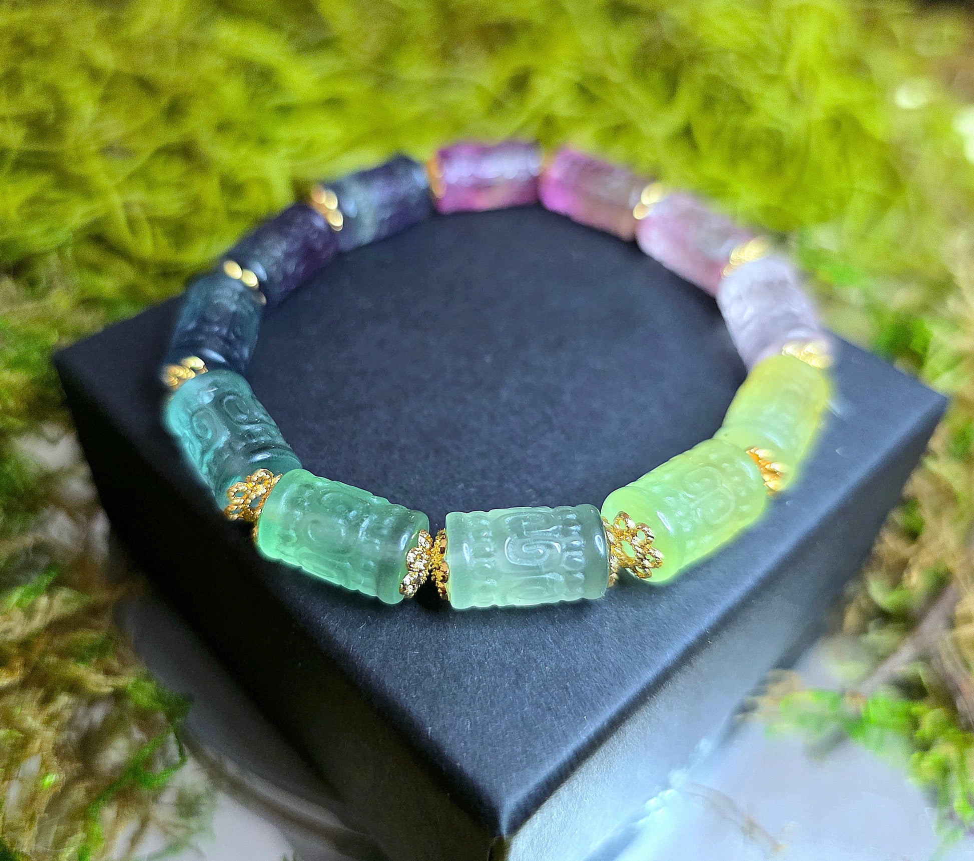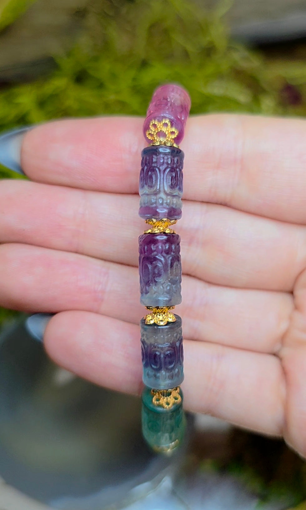 Each stone is approximately 13x7mm, carved, and is strung on an elastic cord, making it suitable for wrists of all sizes. This bracelet also features gold plated alloy spacers.