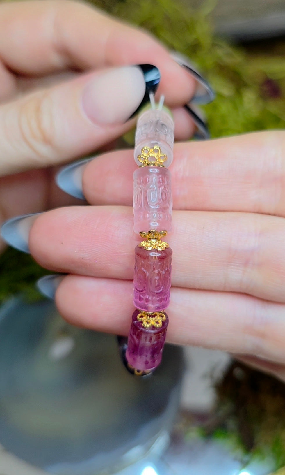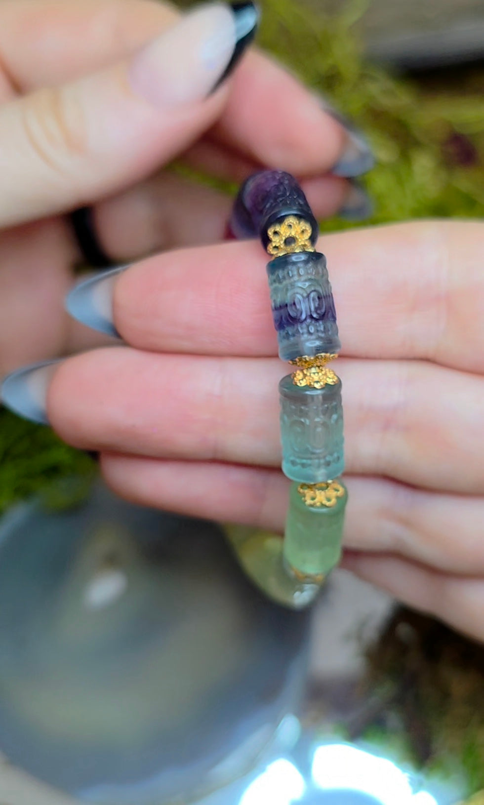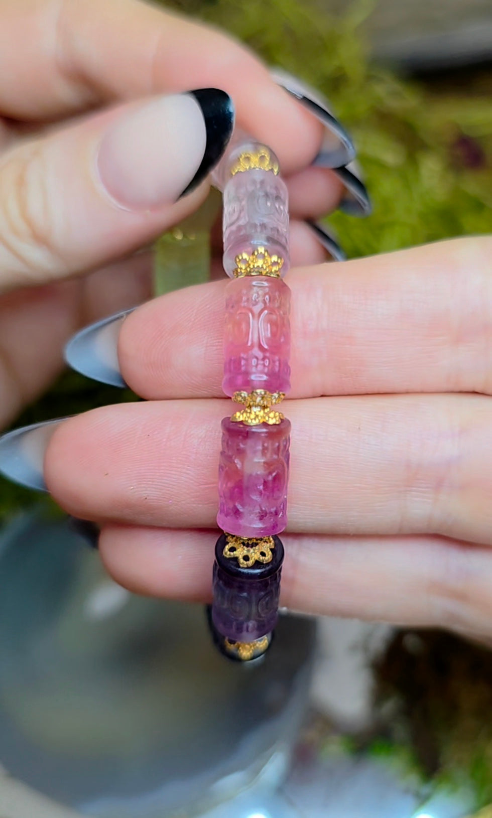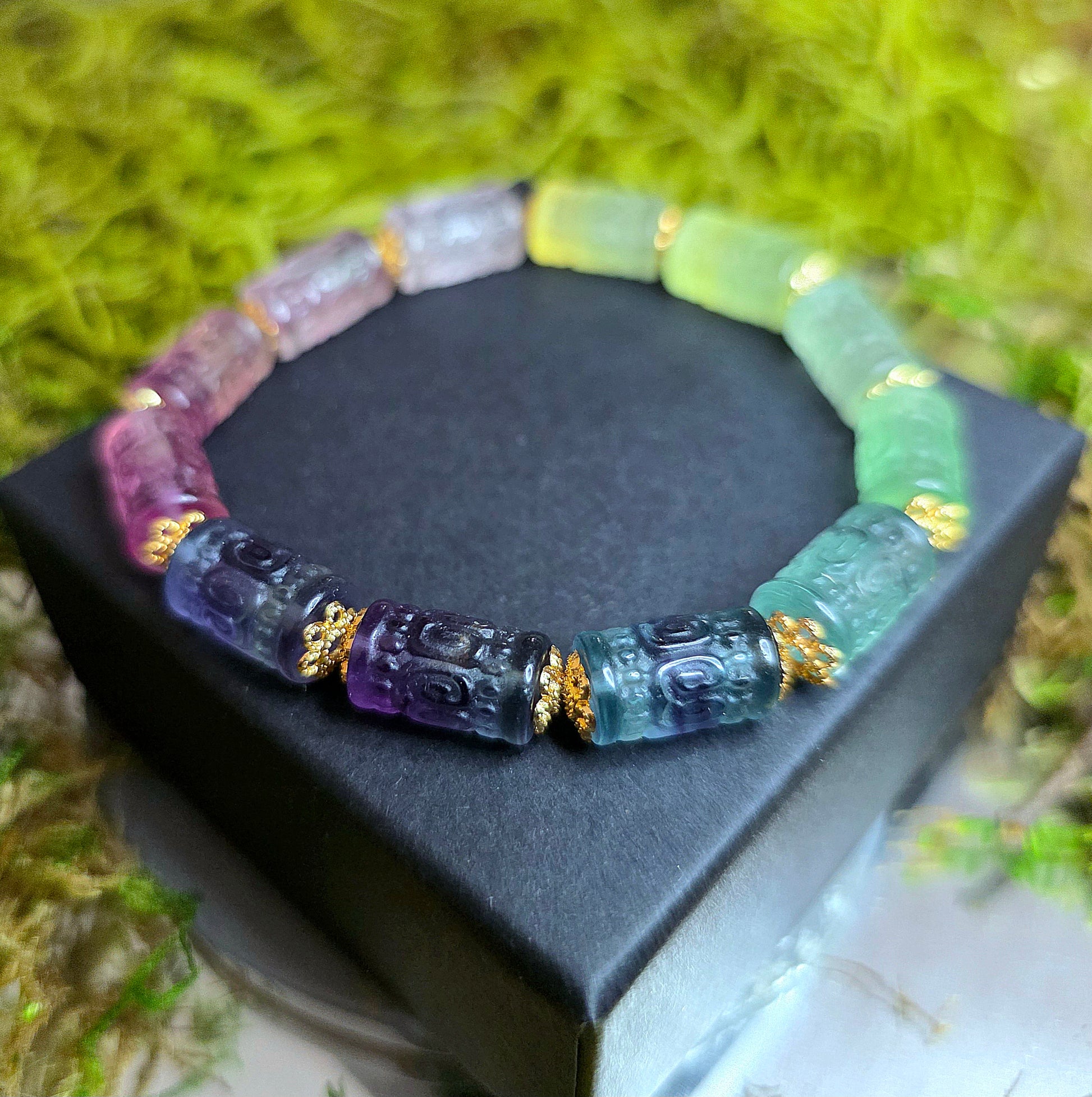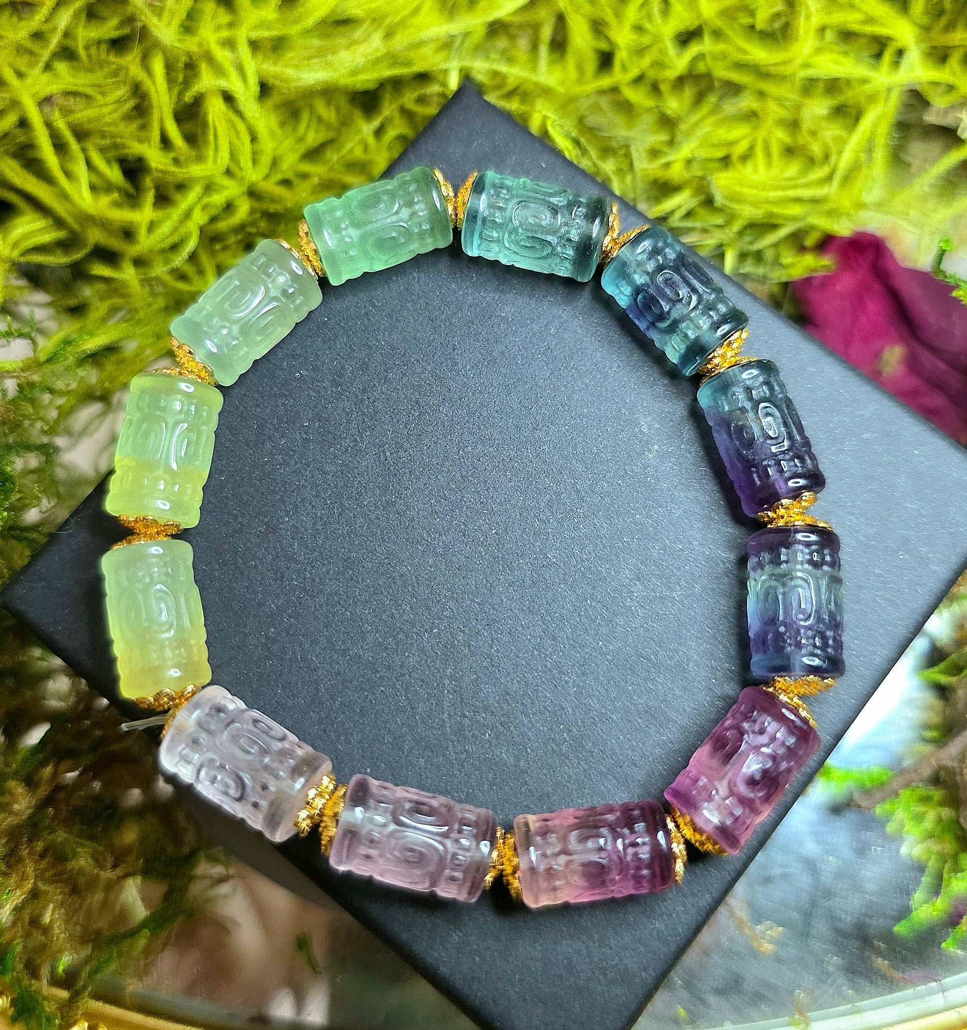 Each stone is approximately 13x7mm, carved, and is strung on an elastic cord, making it suitable for wrists of all sizes. This bracelet also features gold plated alloy spacers.