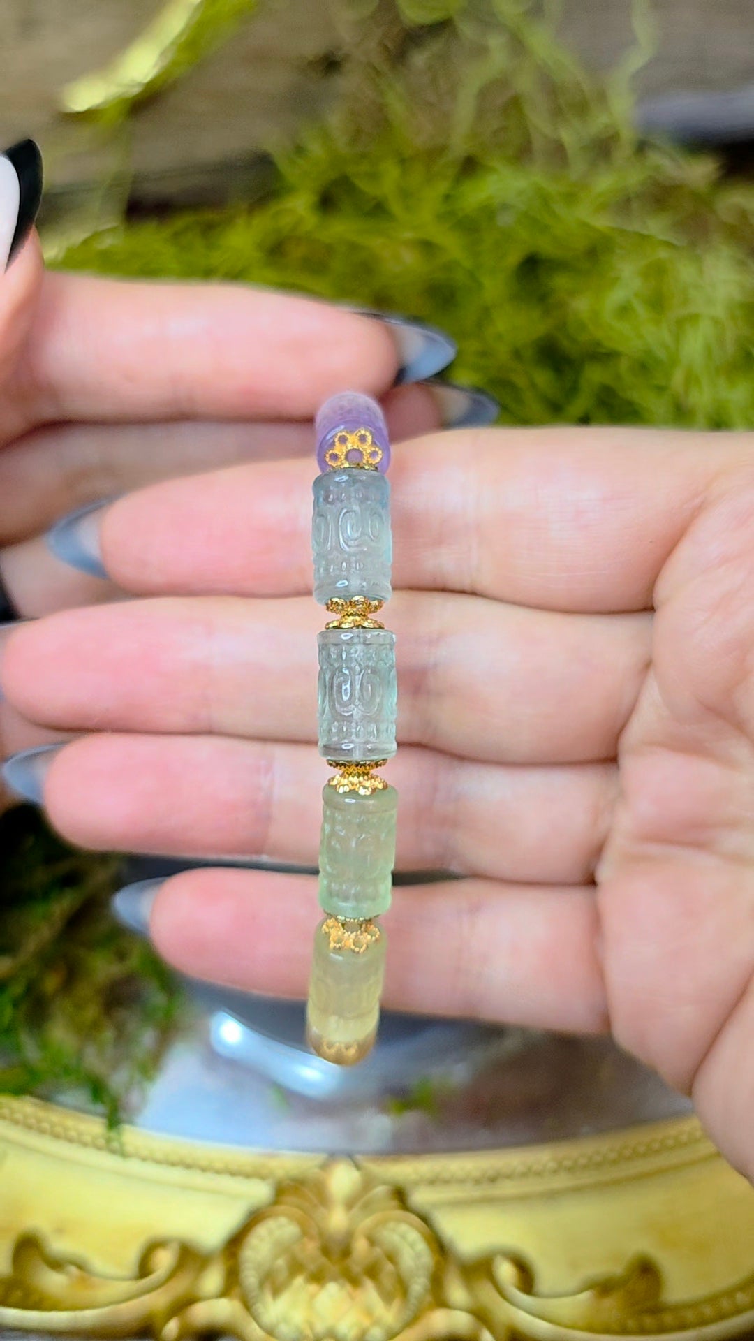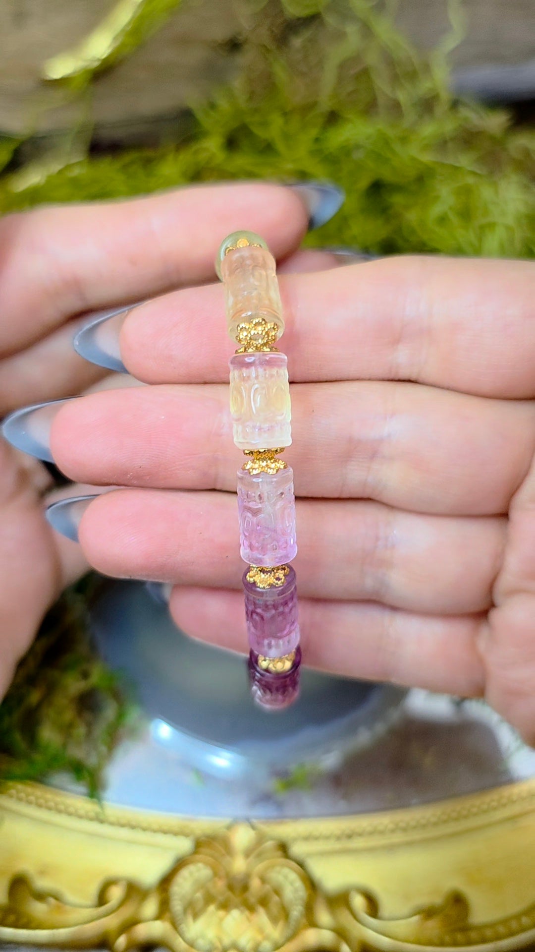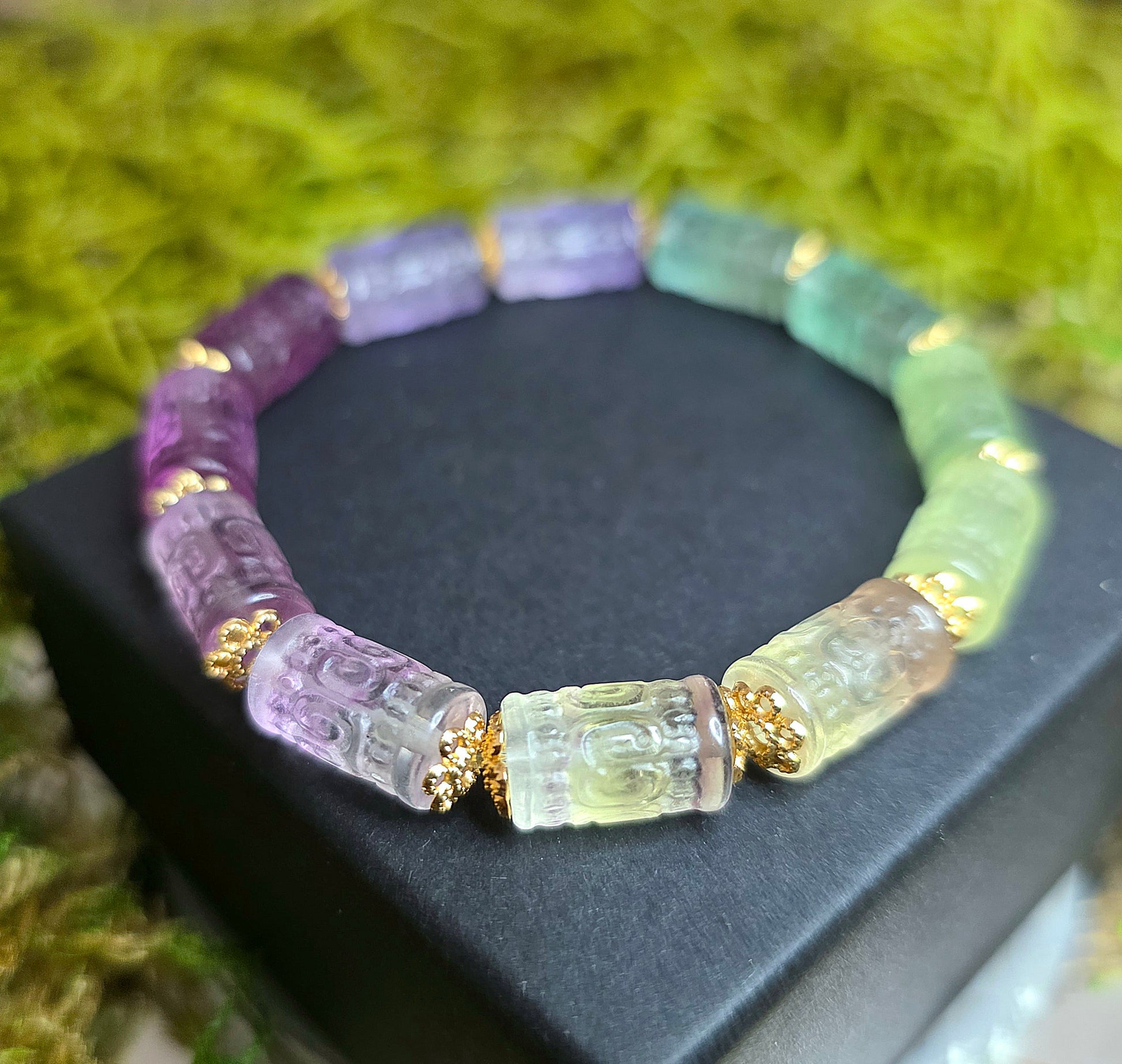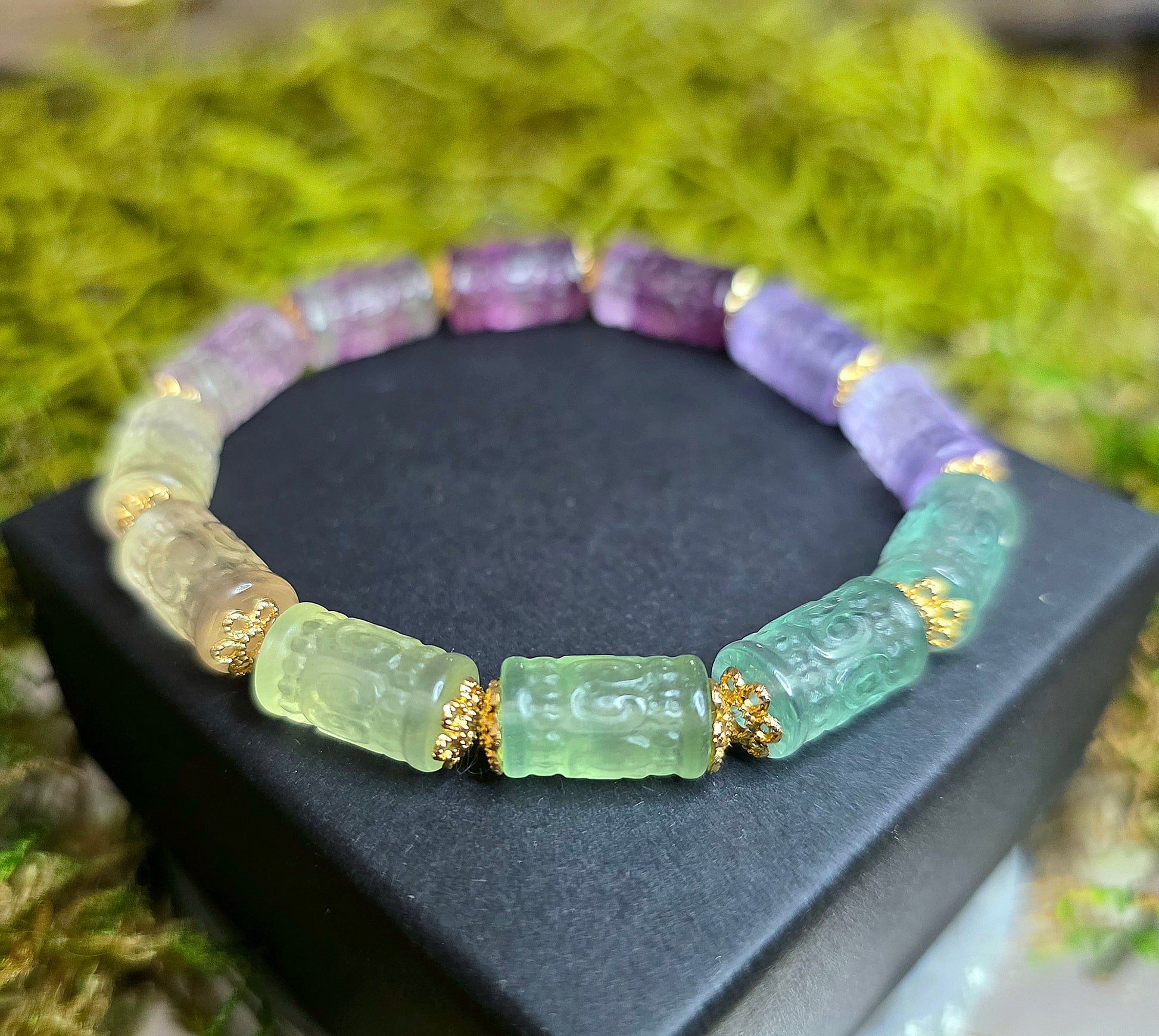 Each stone is approximately 13x7mm, carved, and is strung on an elastic cord, making it suitable for wrists of all sizes. This bracelet also features gold plated alloy spacers.