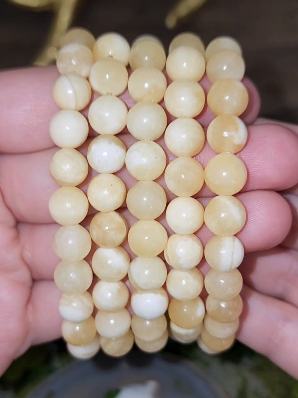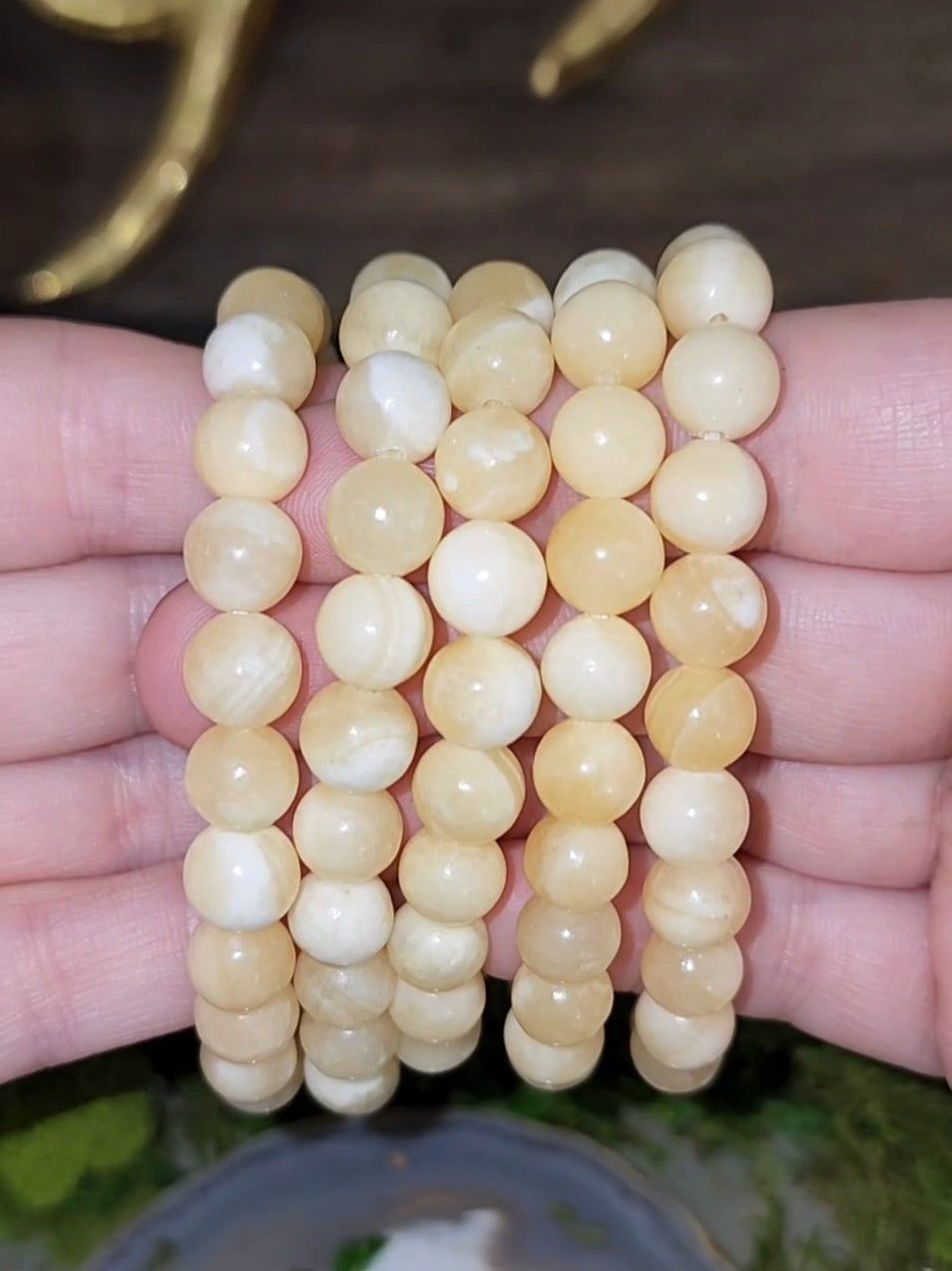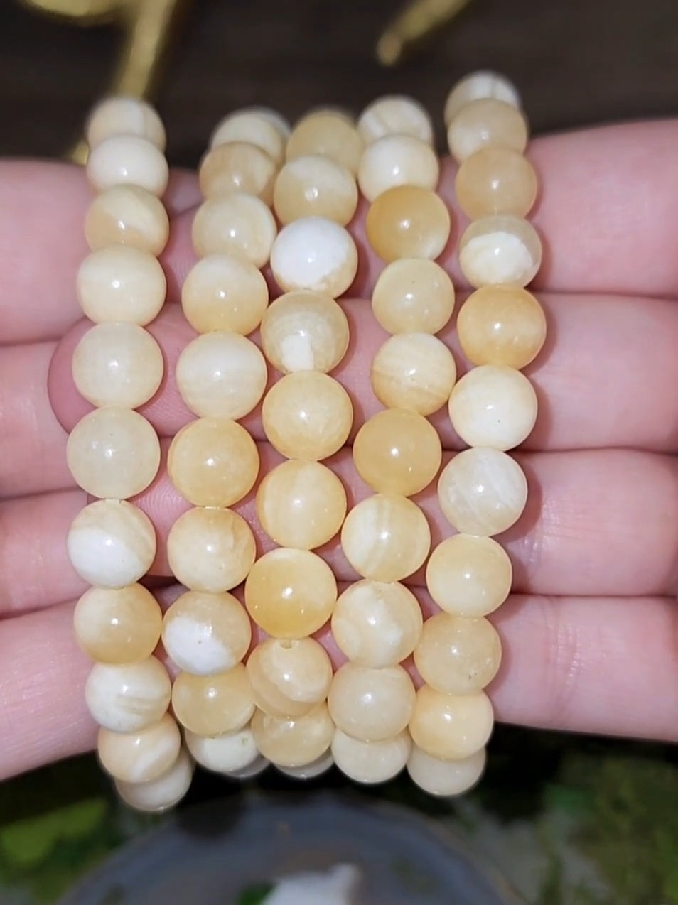 Orange, yellow, and white calcite. The stones are approximately 8mm and are set onto a stretchy elastic cord.