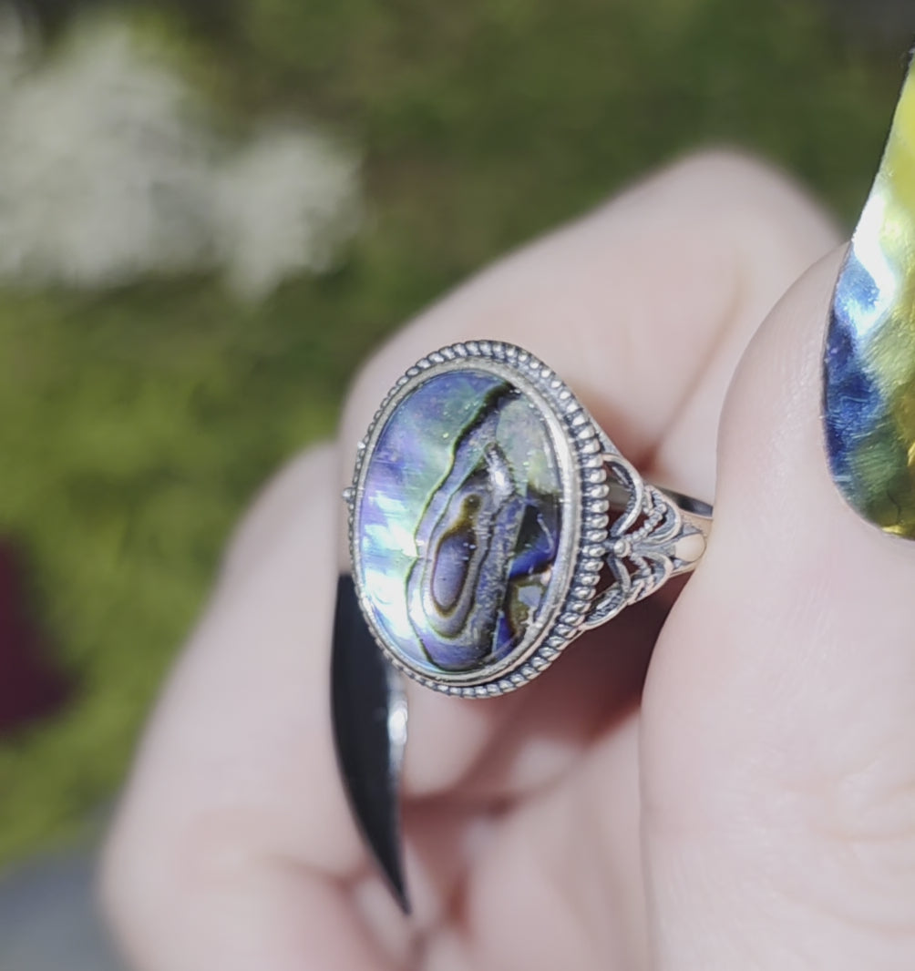 15mm abalone shell that has been set into an adjustable sterling silver ring