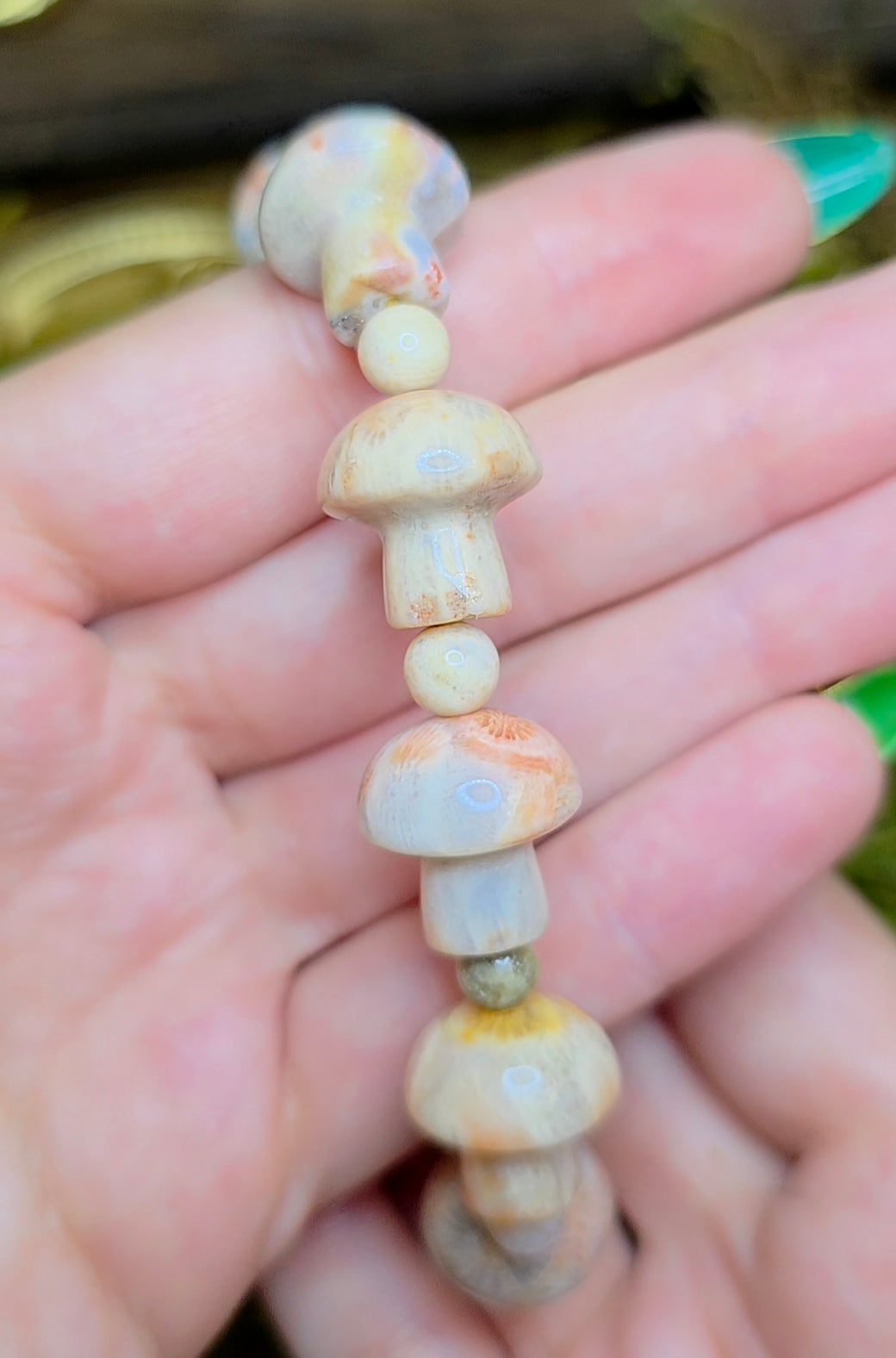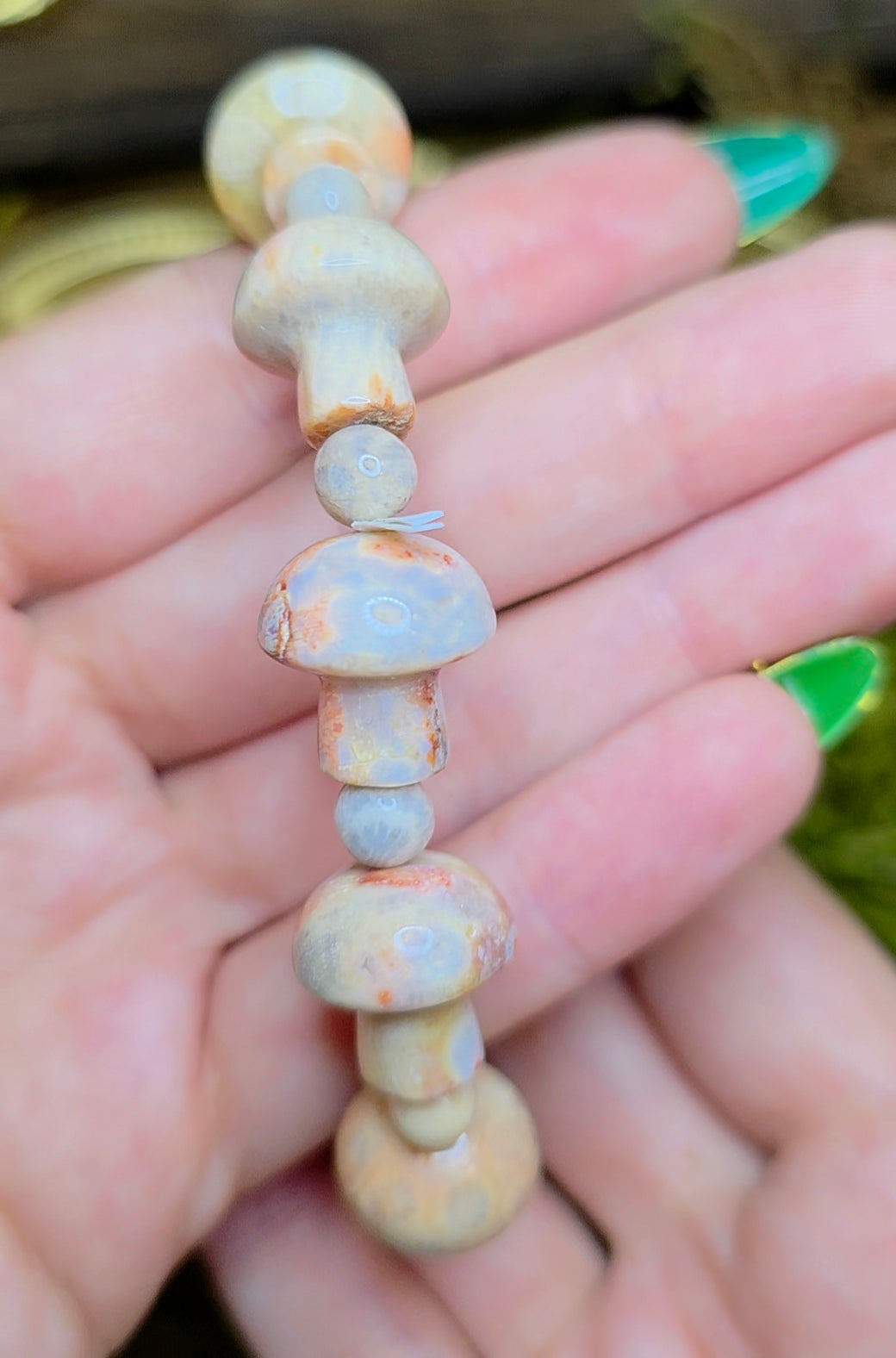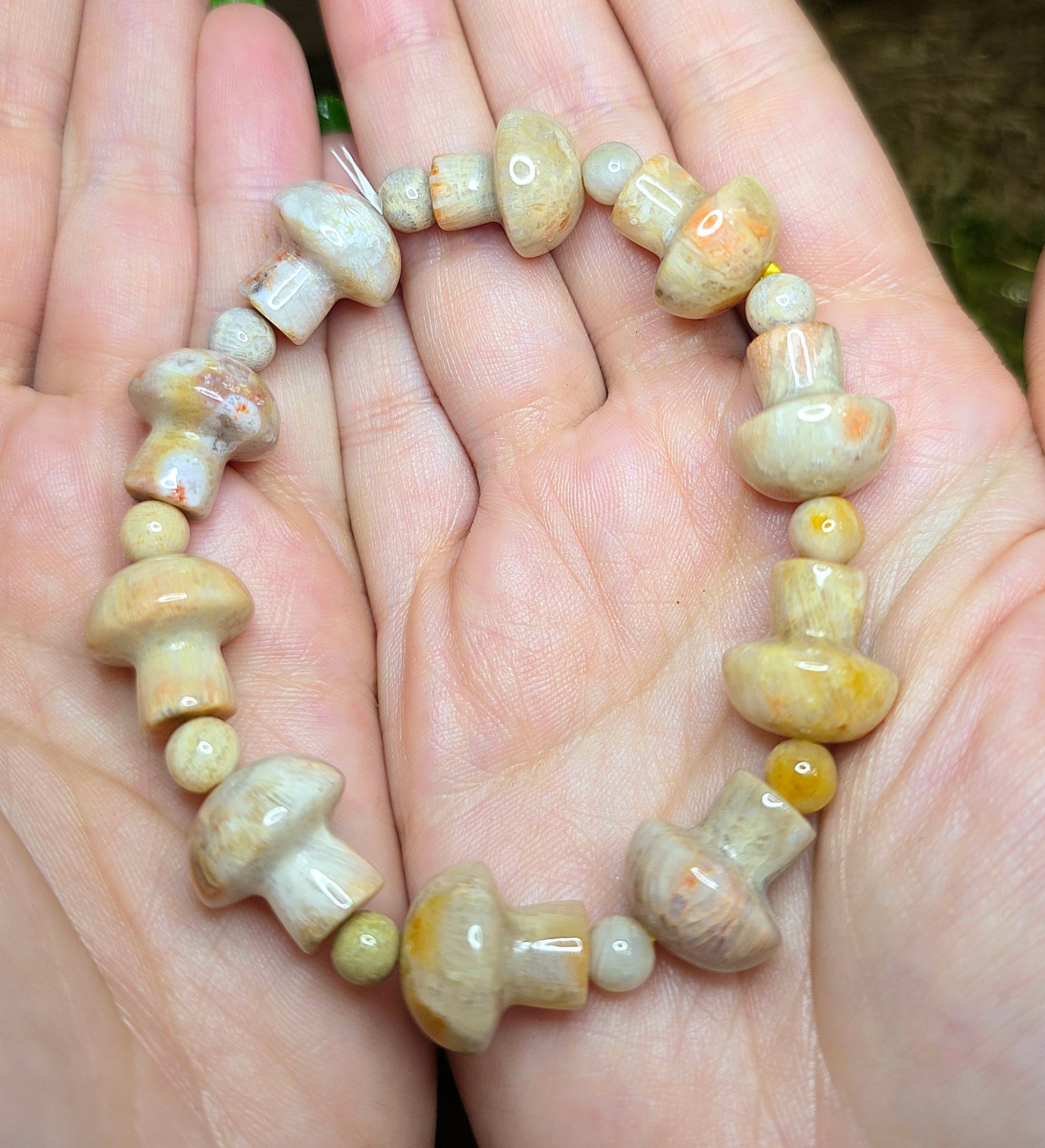 The stones have been carved into mushroom shapes and are approximately 16x8mm and are strung on an elastic cord.