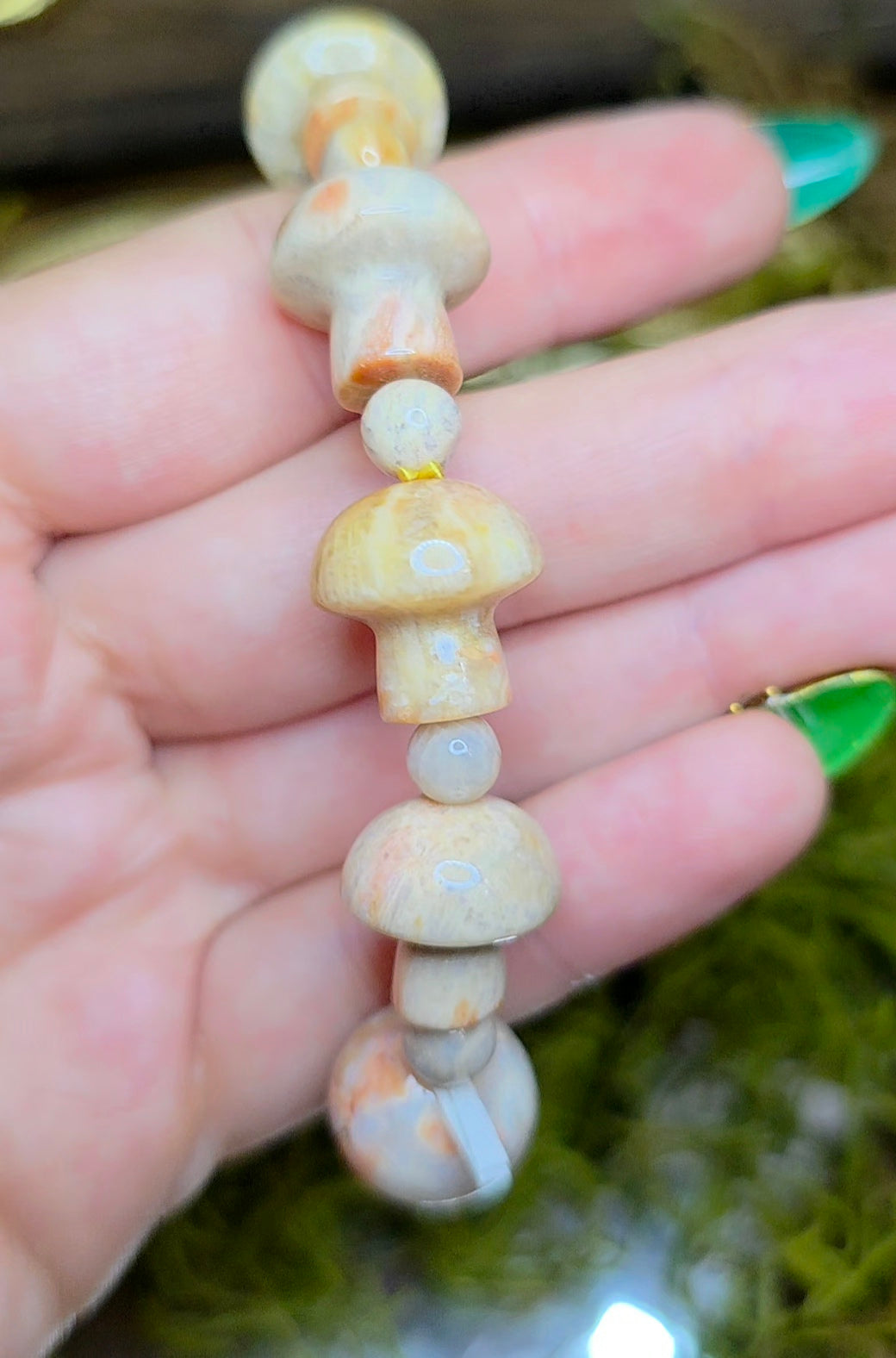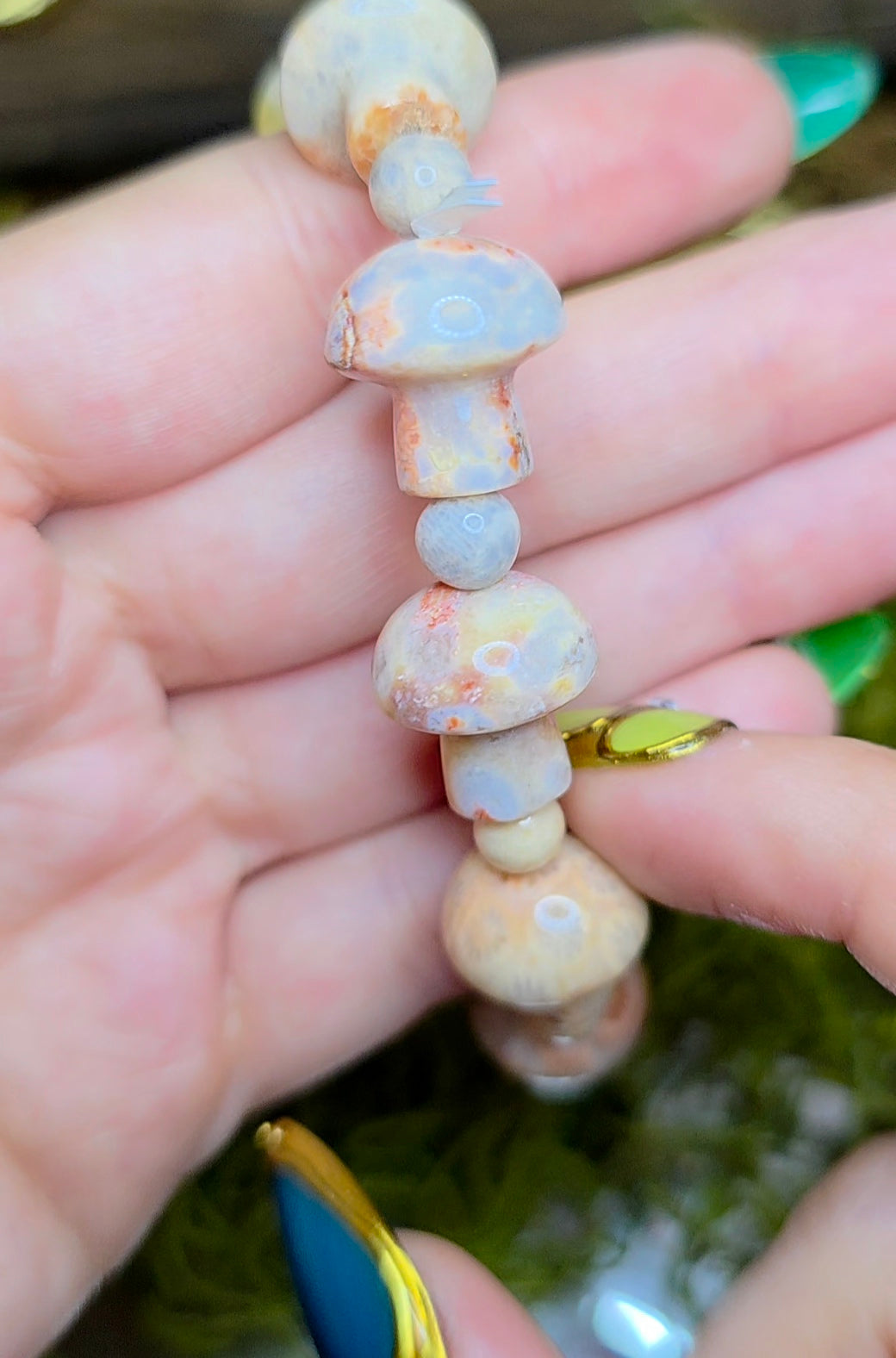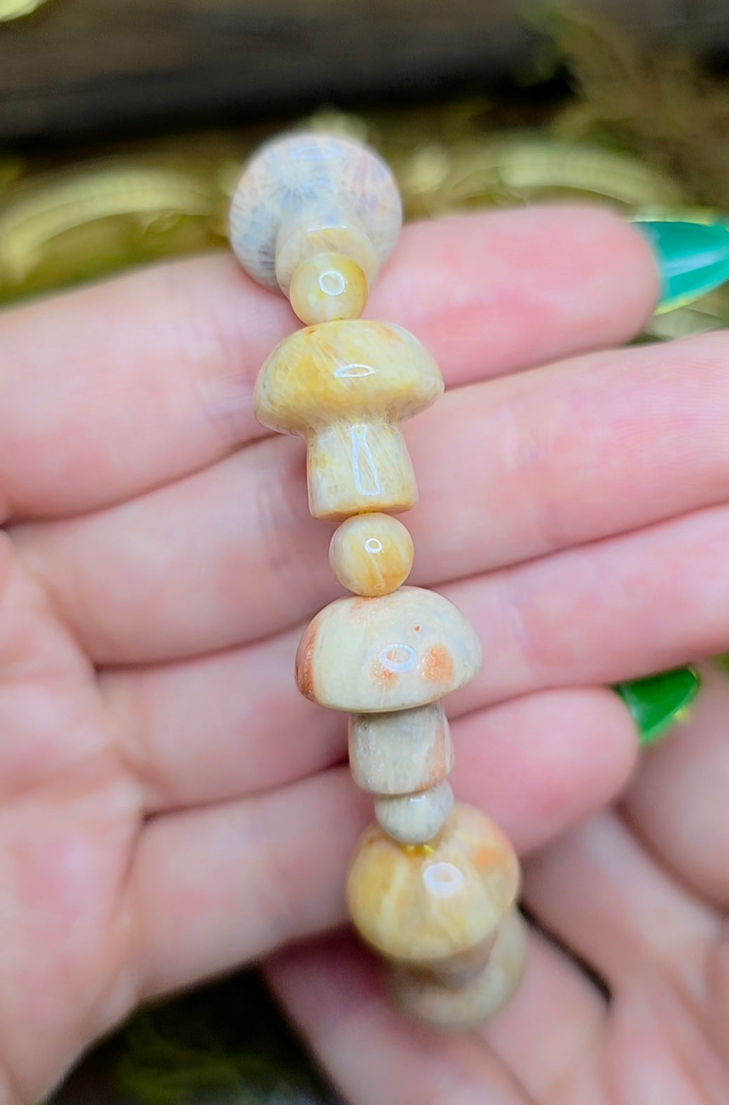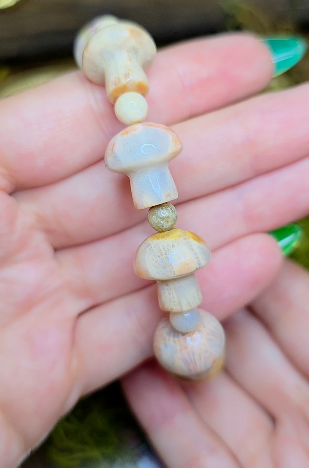 The stones have been carved into mushroom shapes and are approximately 16x8mm and are strung on an elastic cord.