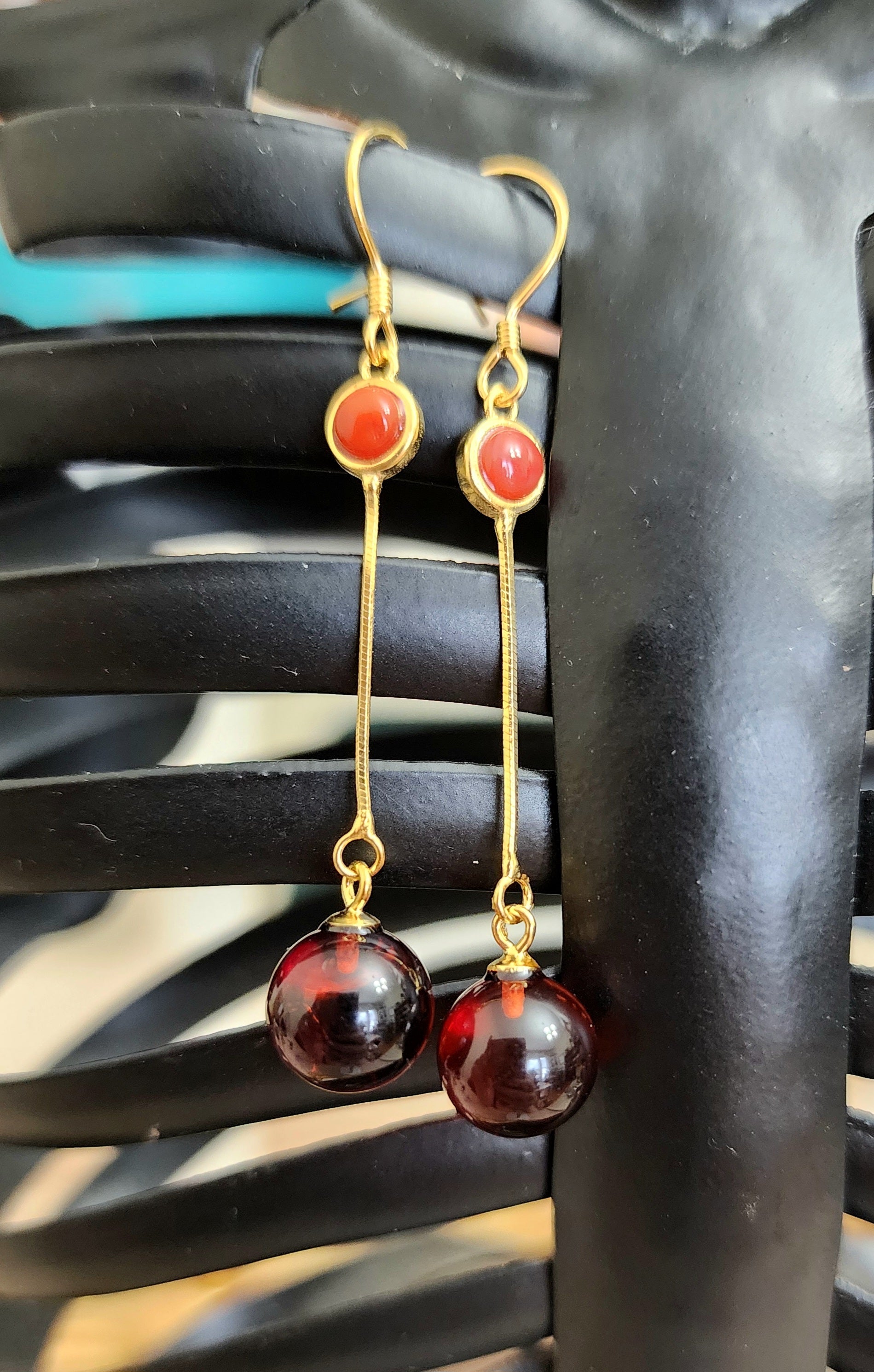 Natural dark amber and Nanhong agate set into gold plated sterling silver earrings. The hooks are also gold plated sterling silver but can be swapped for surgical steel upon request.