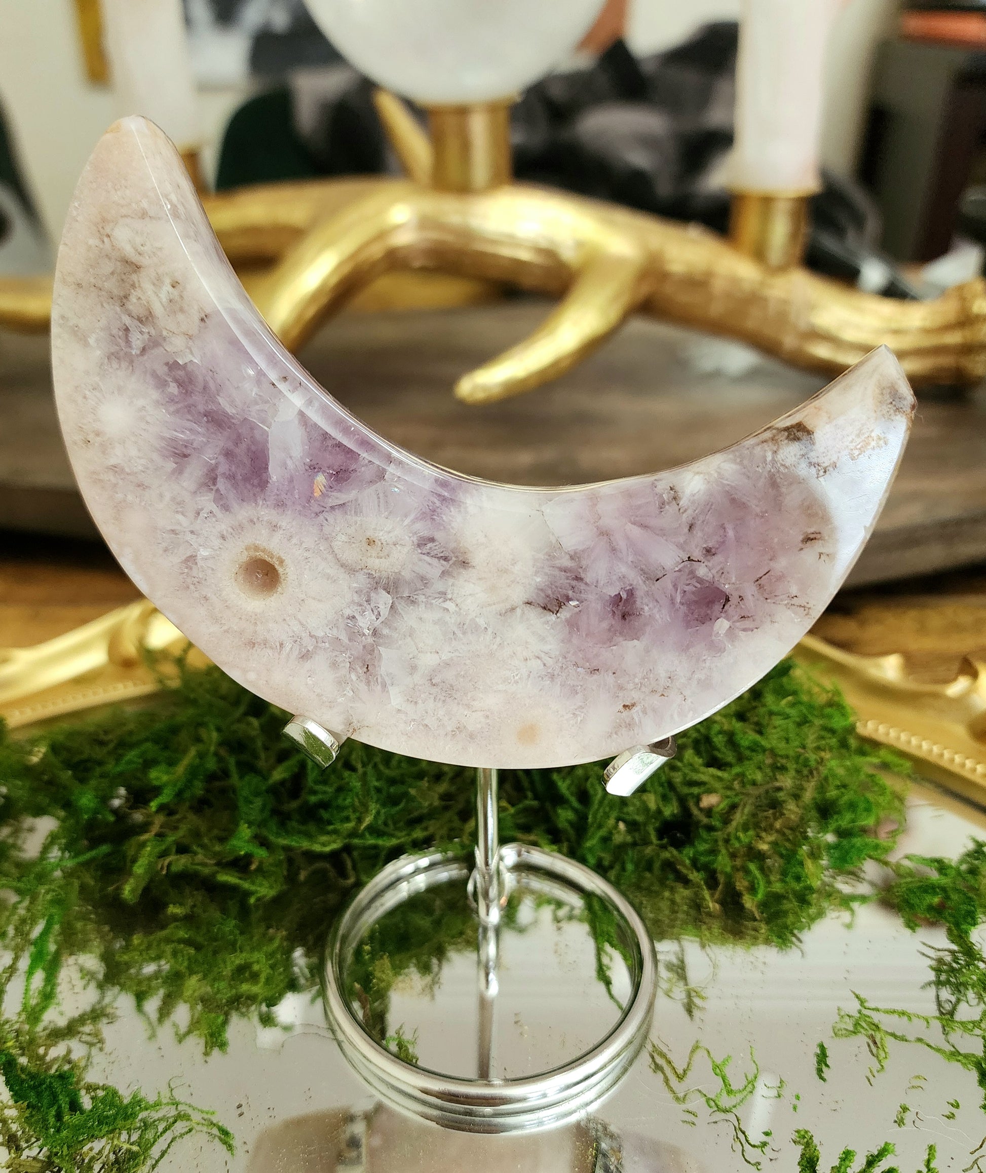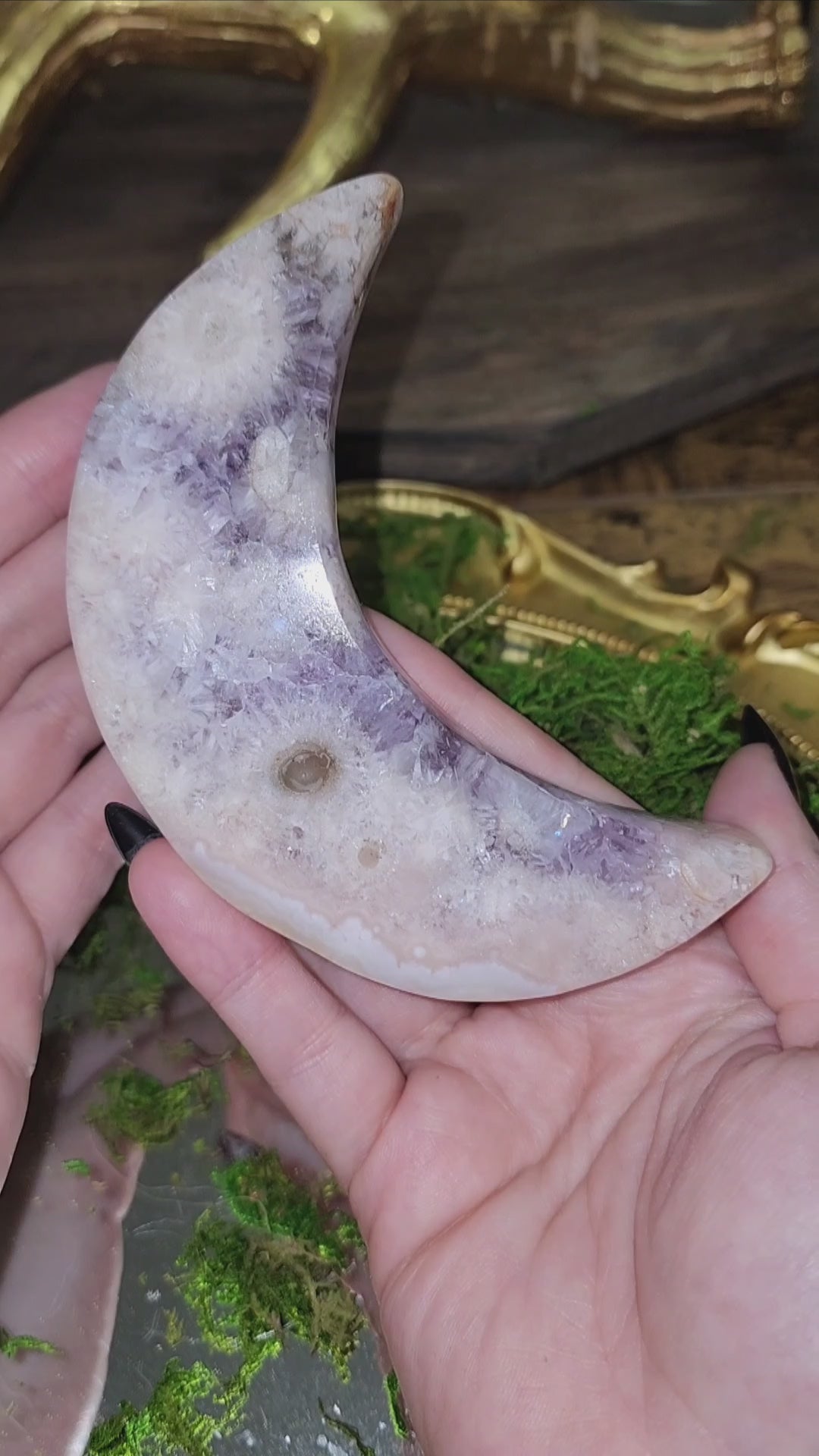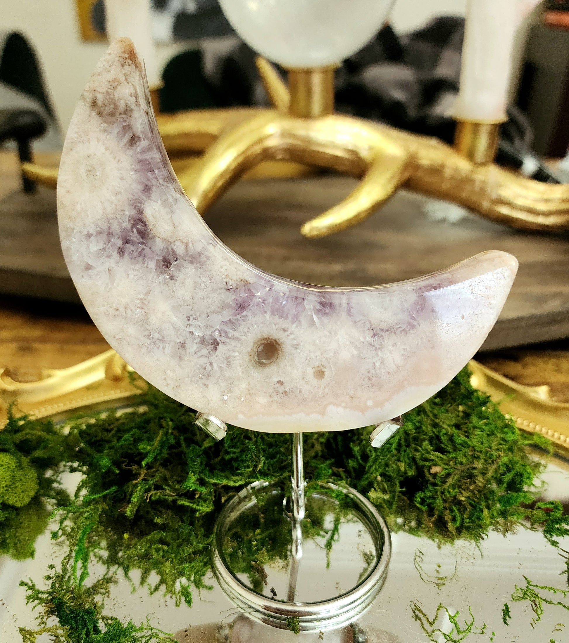 Beautiful pink flower agate and purple amethyst combination stone with many rainbows that has been carved into a crescent moon shape.