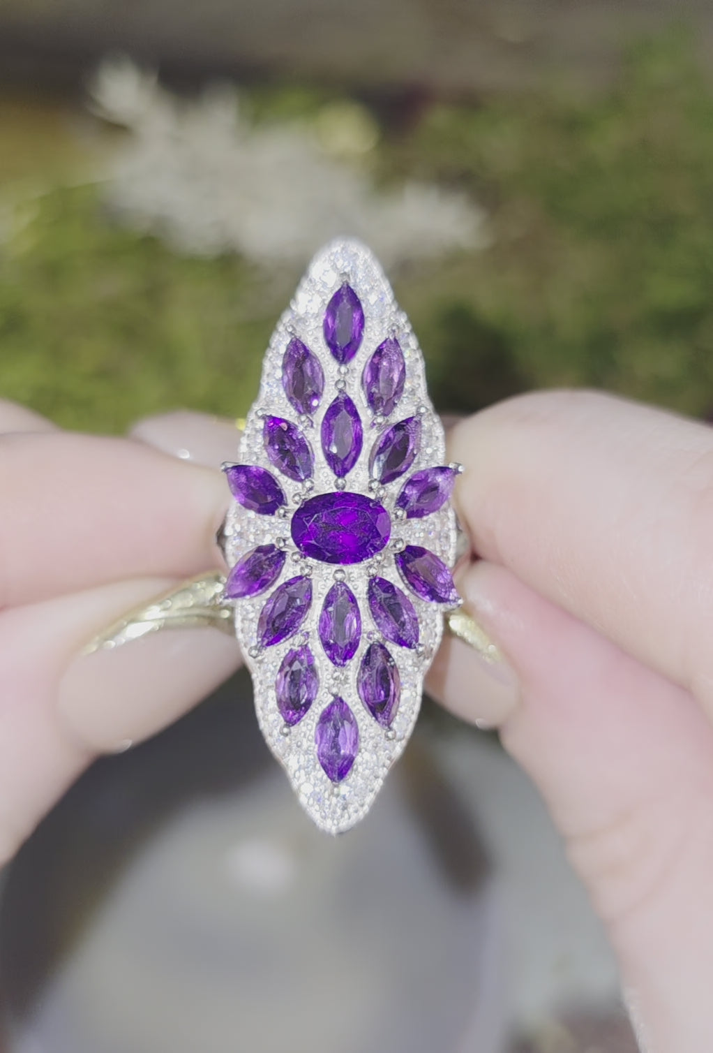 17 faceted amethyst crystals set into an adjustable sterling silver ring with zircon accents. The ring measures 41.5mm/1.6 inches long