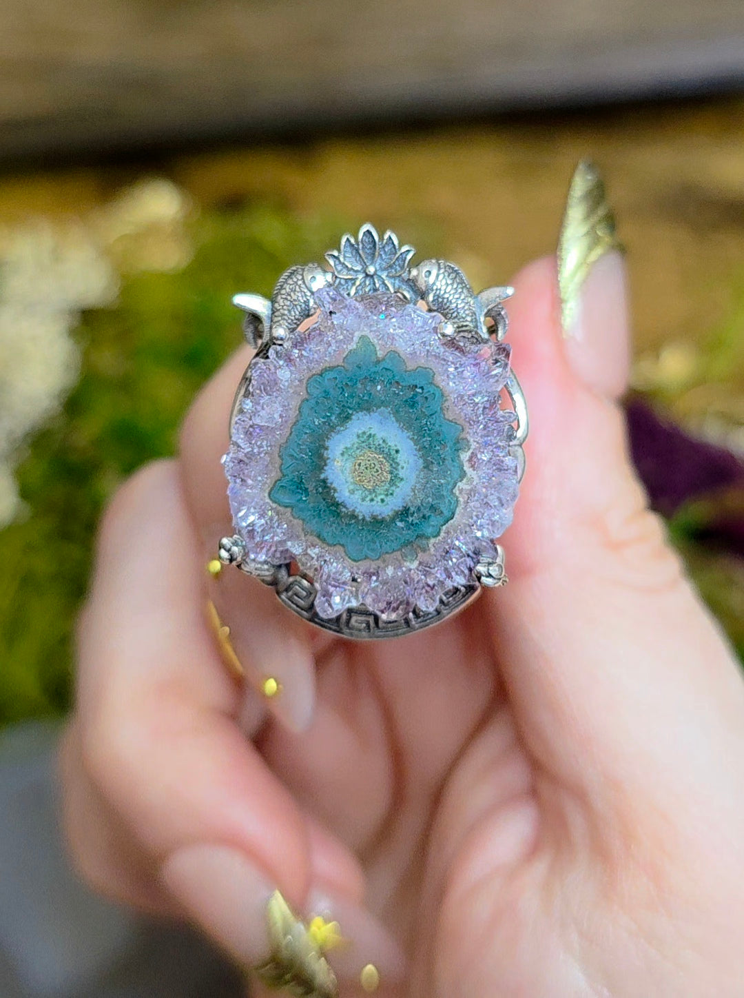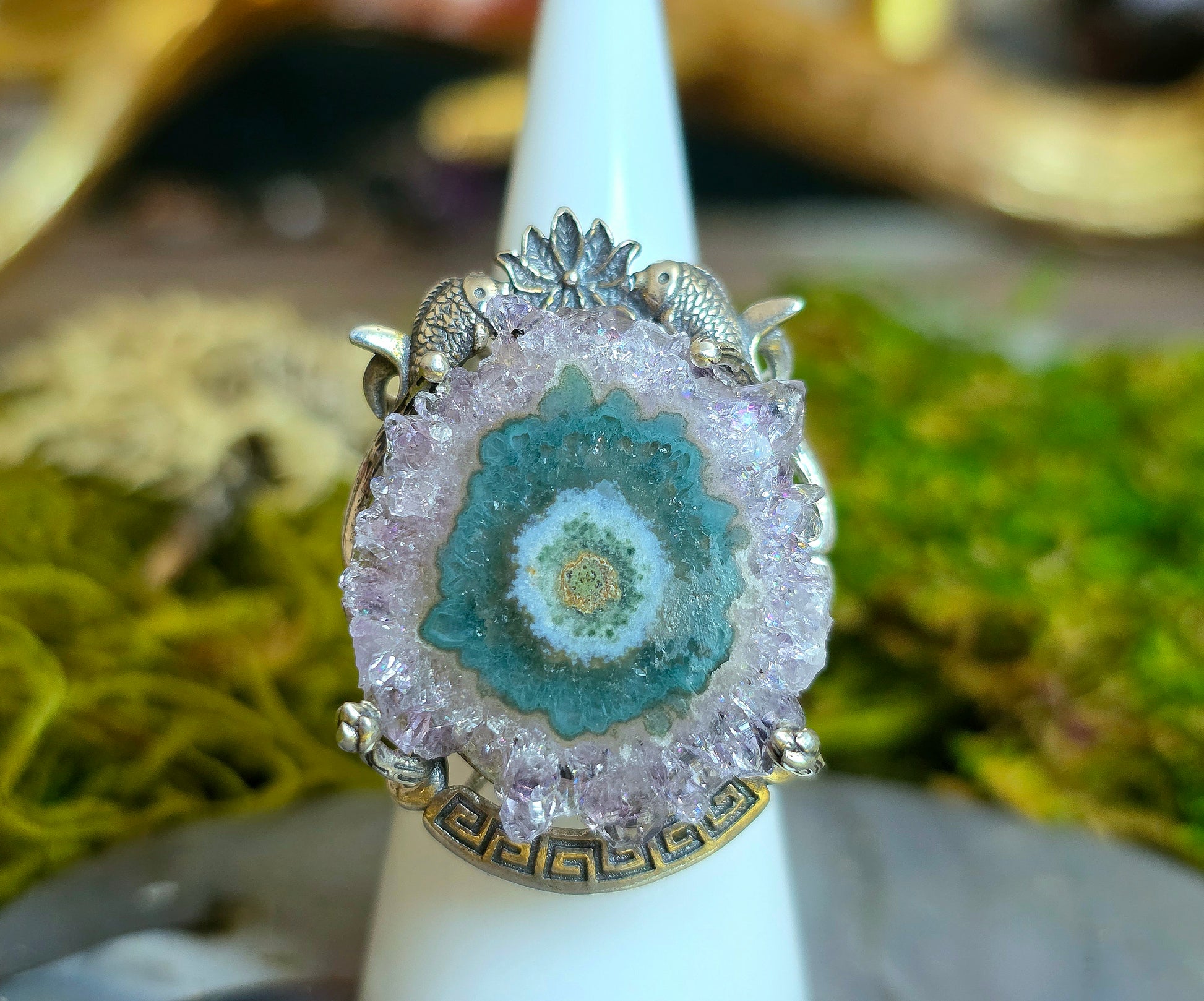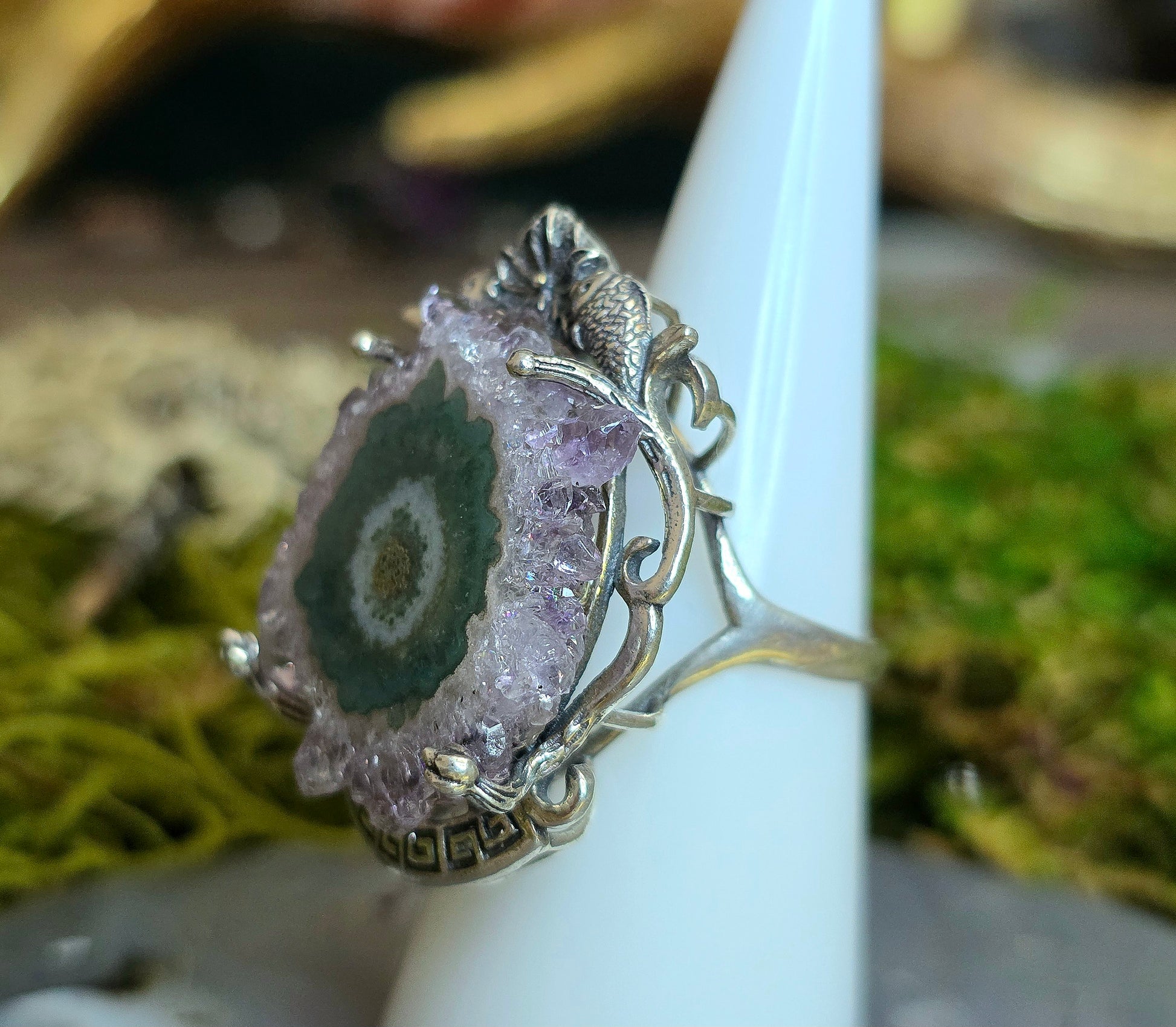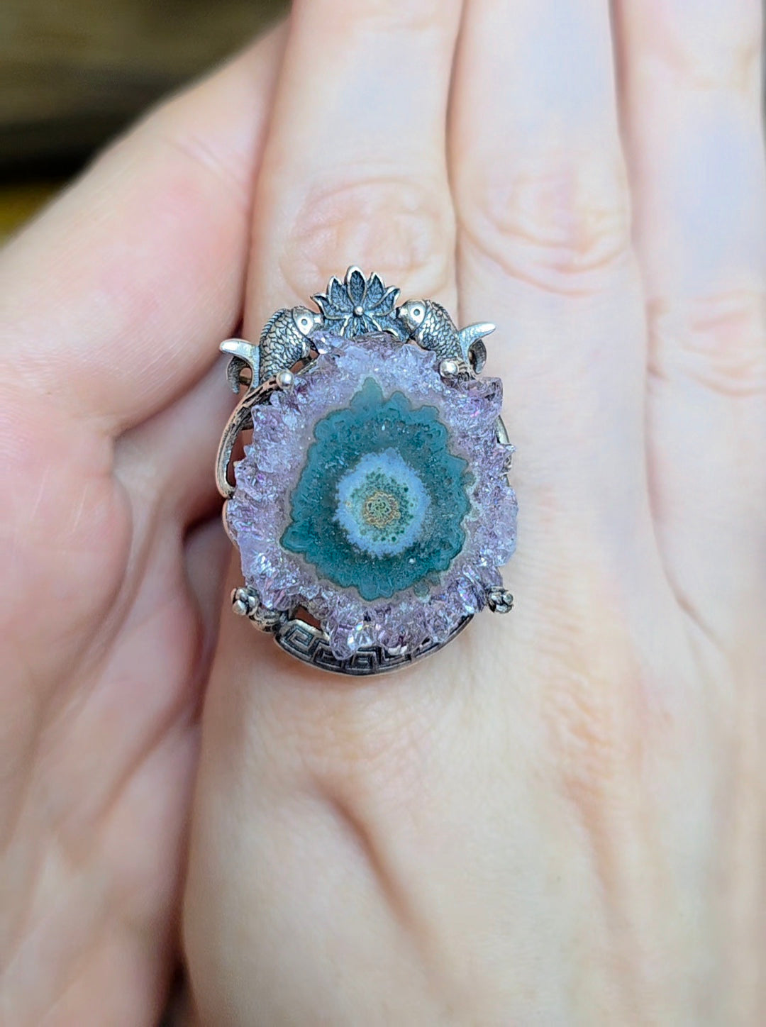This crystal is about 26 mm and is set into a heavy band, adjustable, sterling silver ring with fish details. The ring is adjustable and will best fit sizes 7 - 9
