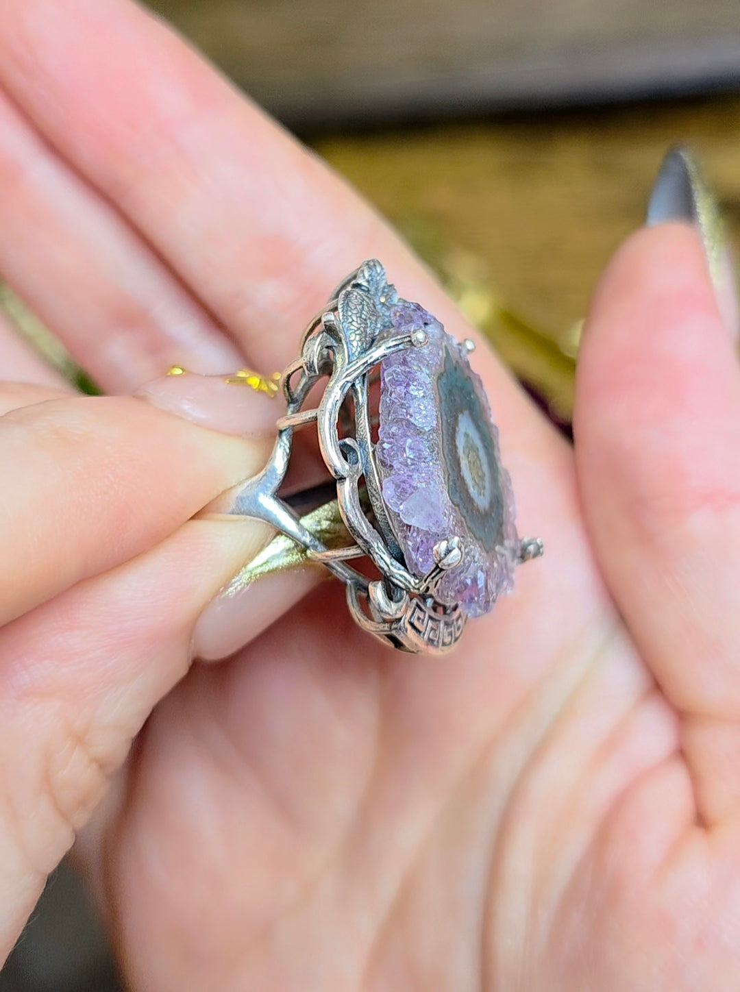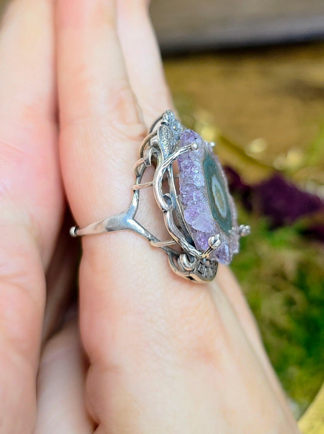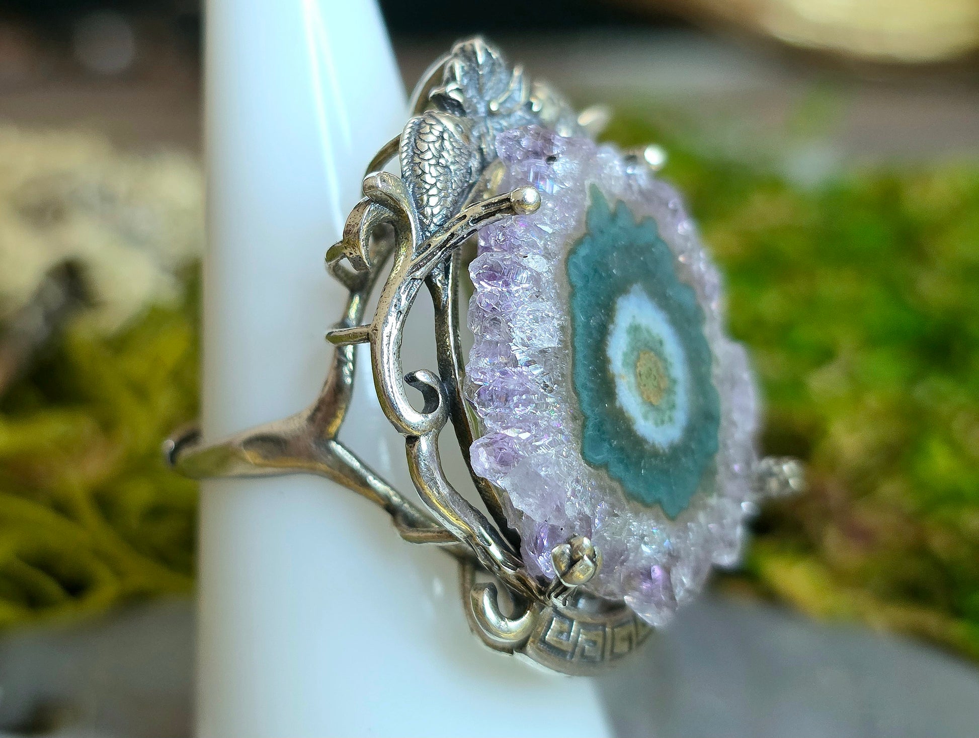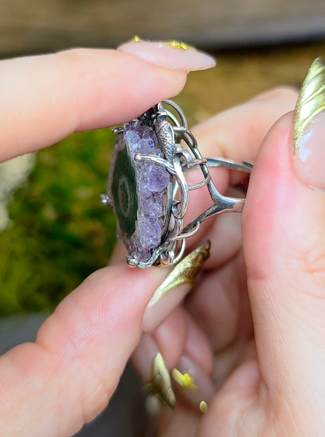 This crystal is about 26 mm and is set into a heavy band, adjustable, sterling silver ring with fish details. The ring is adjustable and will best fit sizes 7 - 9