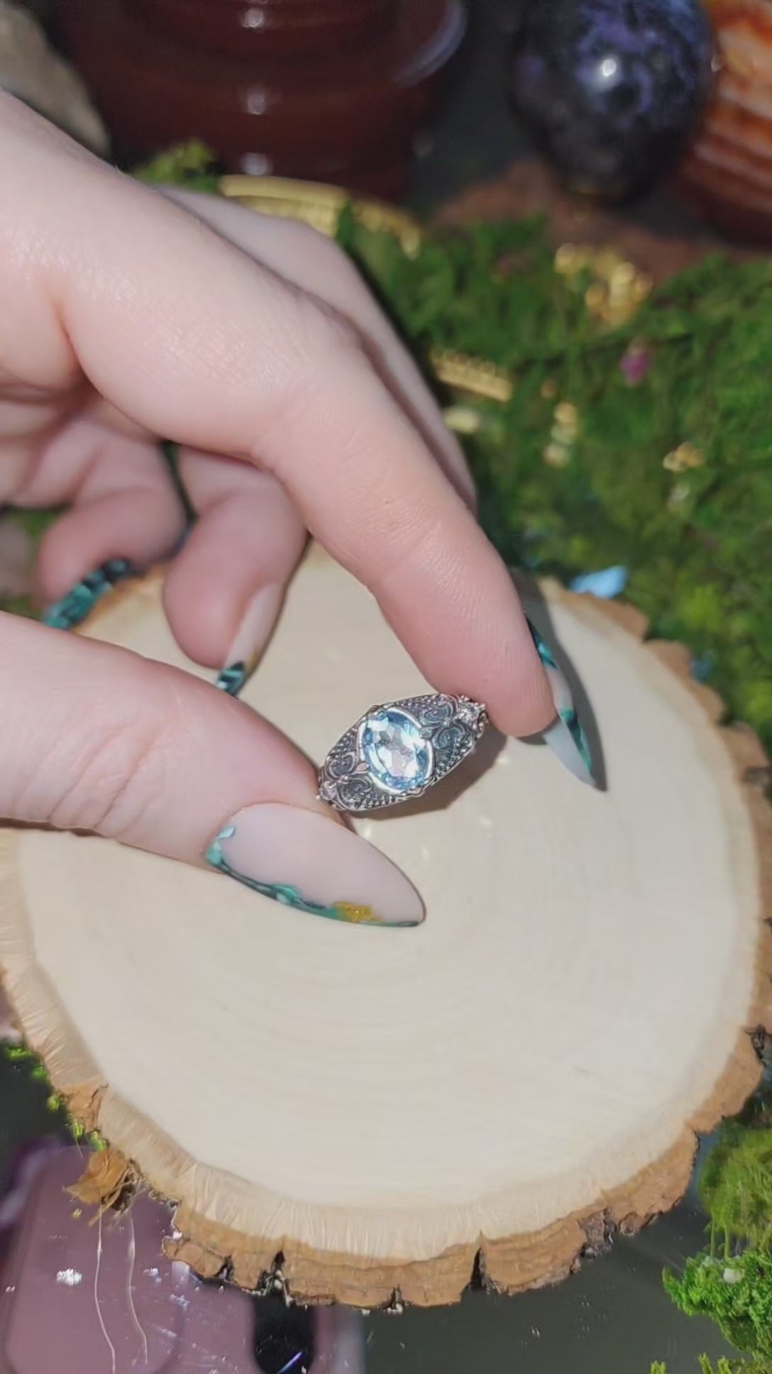 Faceted aquamarine with zircon accents on an adjustable sterling silver ring