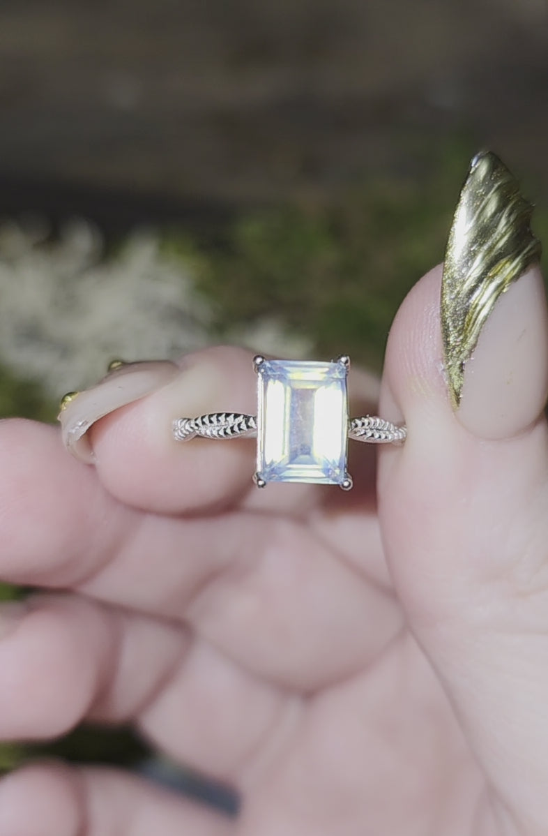 9 x 6mm faceted aquamarine baguette either green flash set on an adjustable sterling silver ring