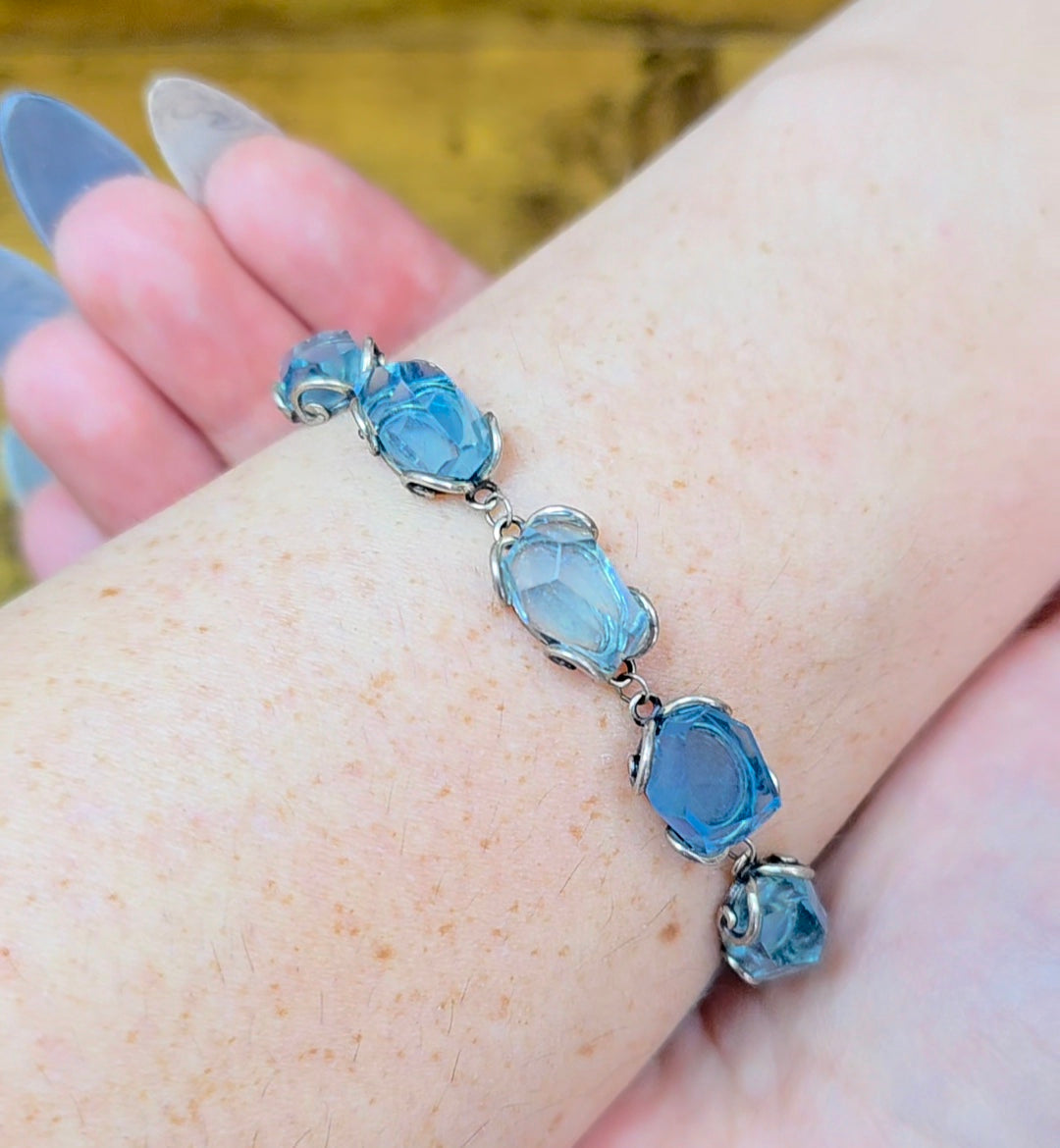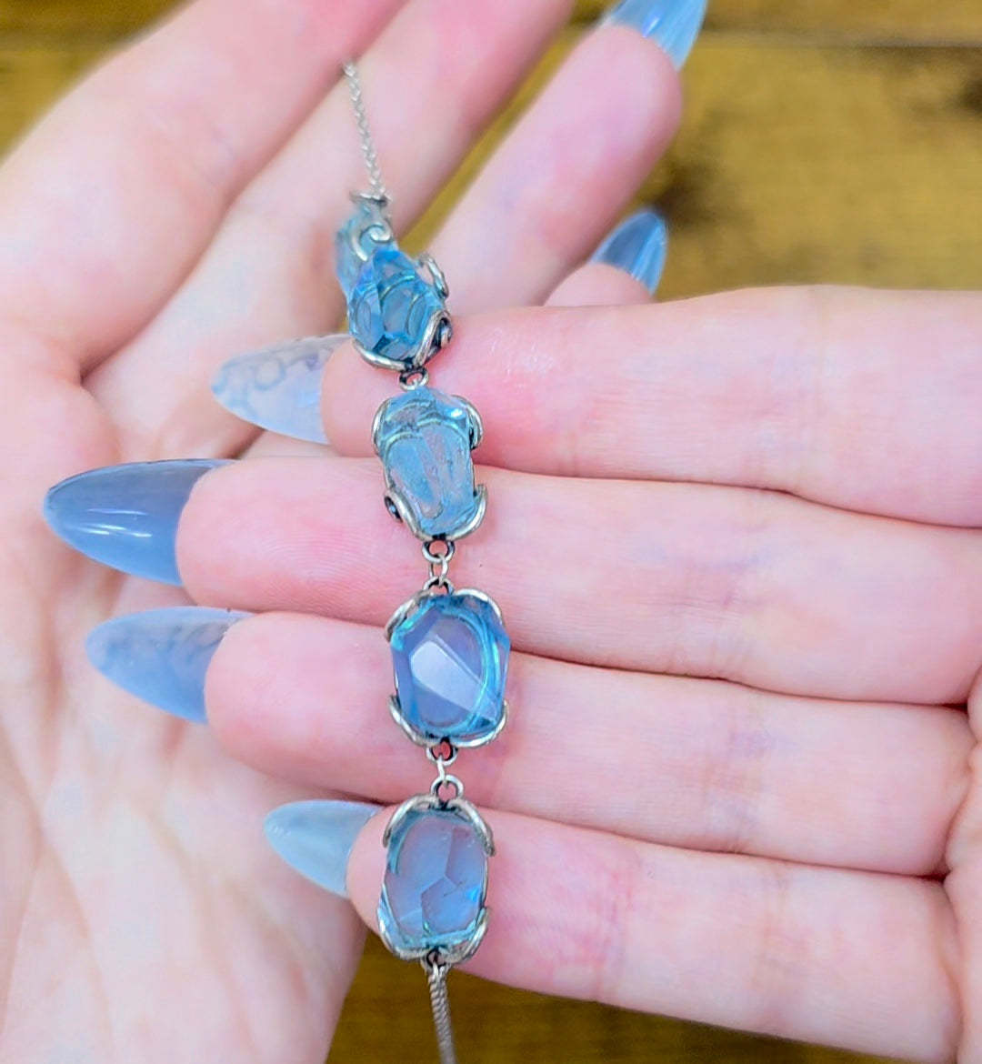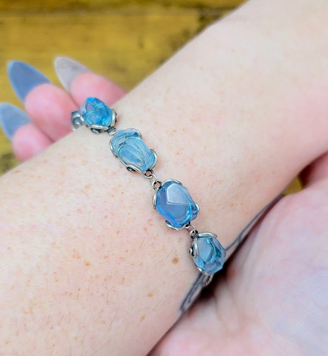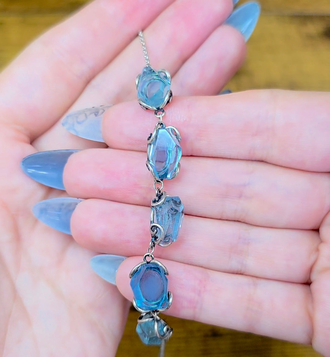 This sterling silver bracelet is adjustable up about 7-8 inches and features five roughly 12x7mm aquamarine freeform crystals.
