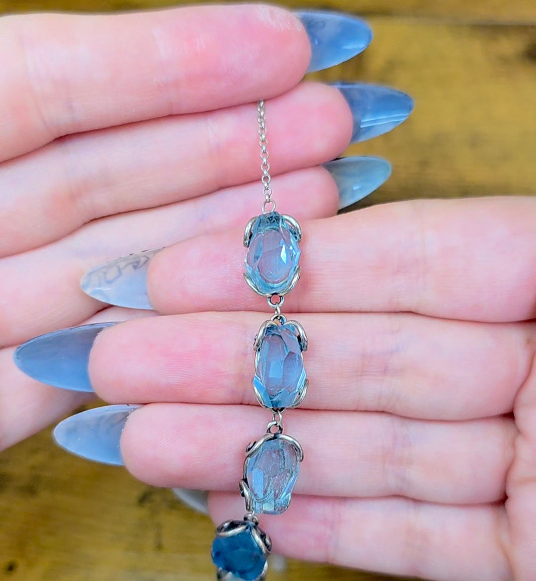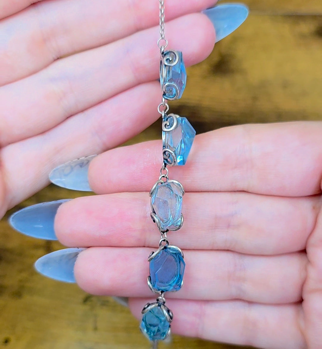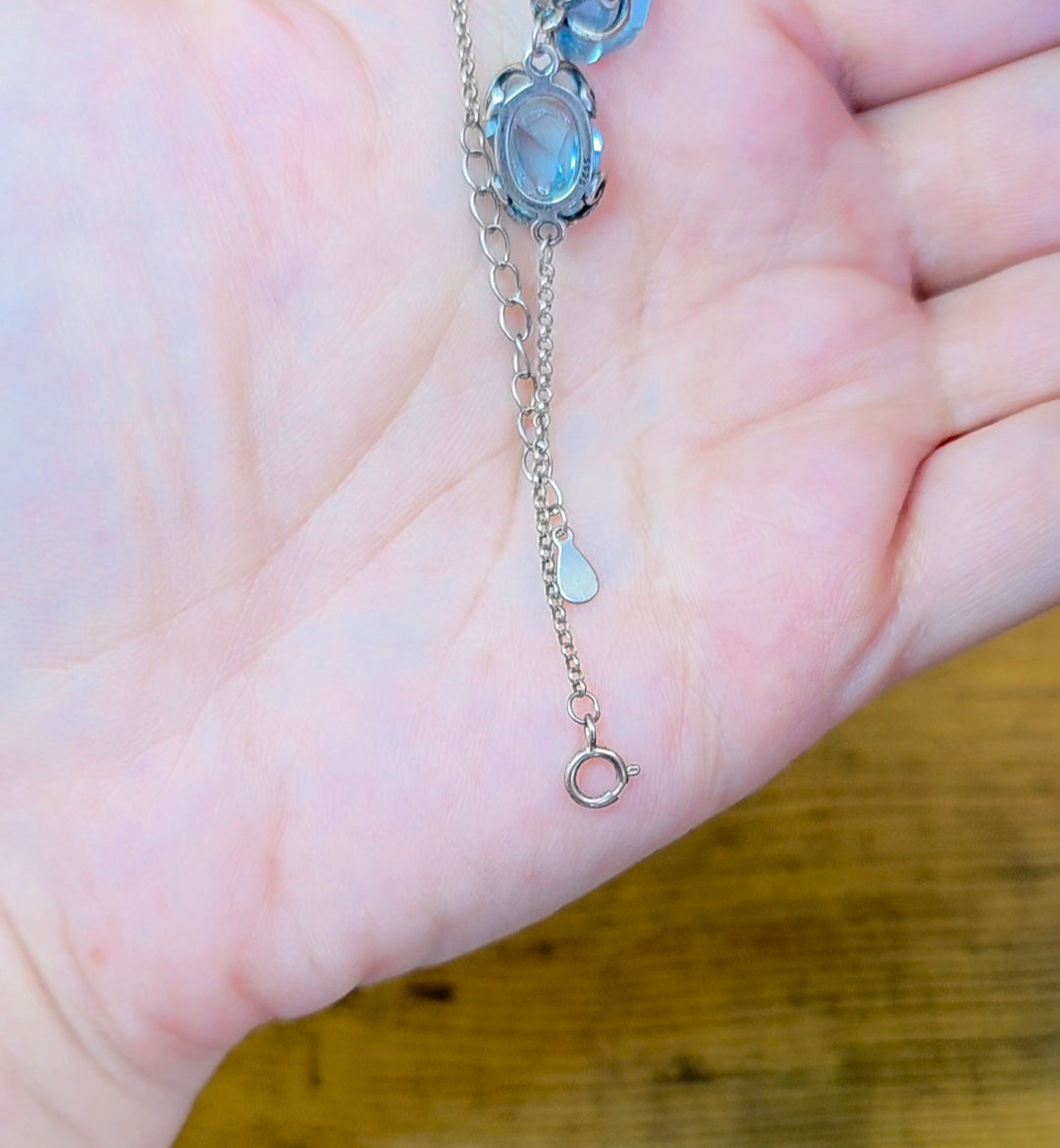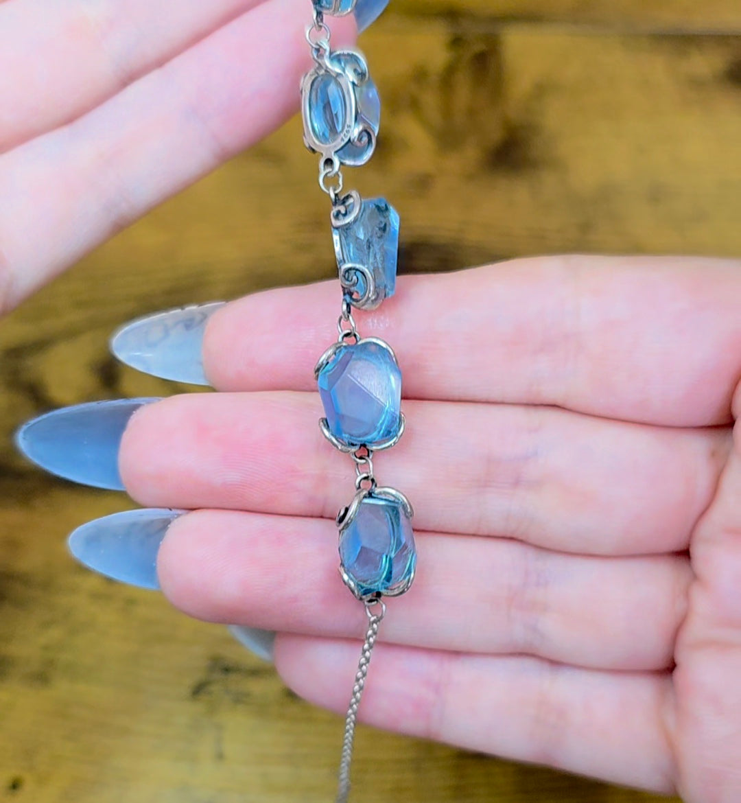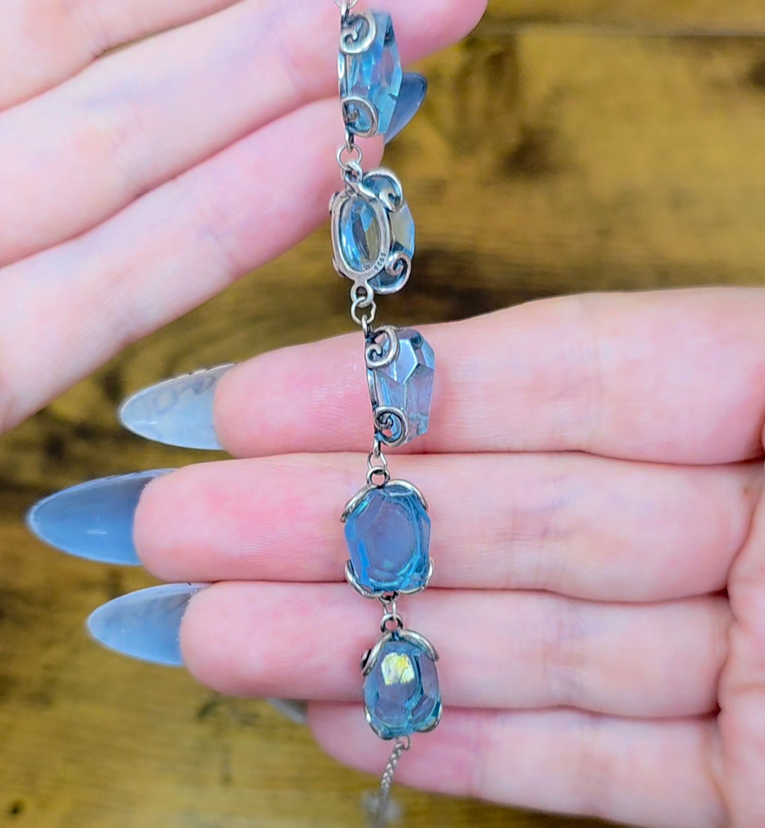 This sterling silver bracelet is adjustable up about 7-8 inches and features five roughly 12x7mm aquamarine freeform crystals.