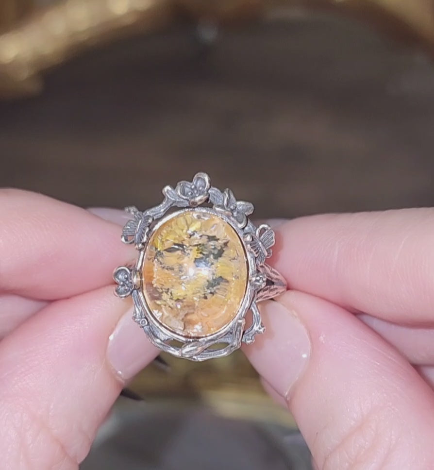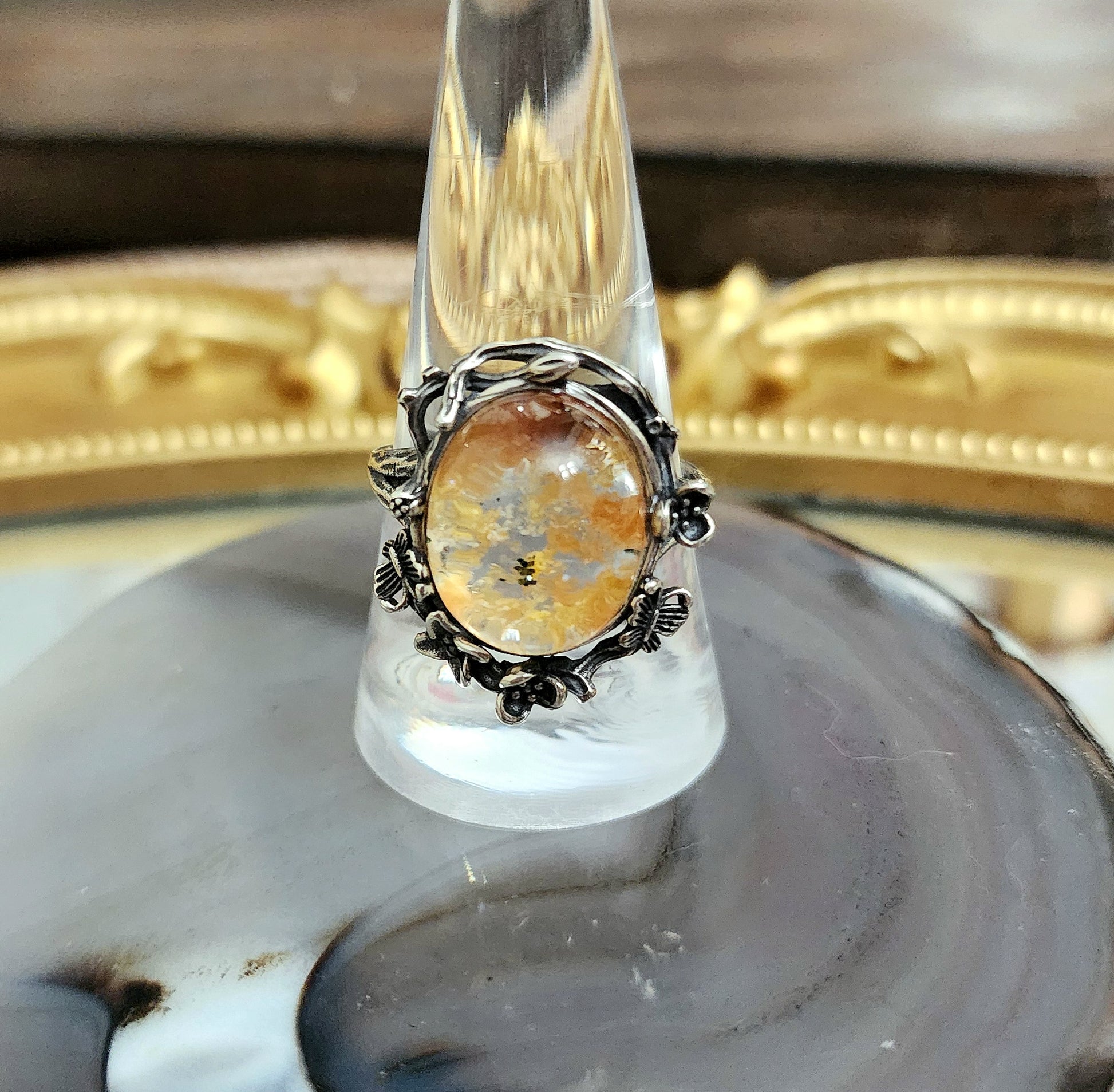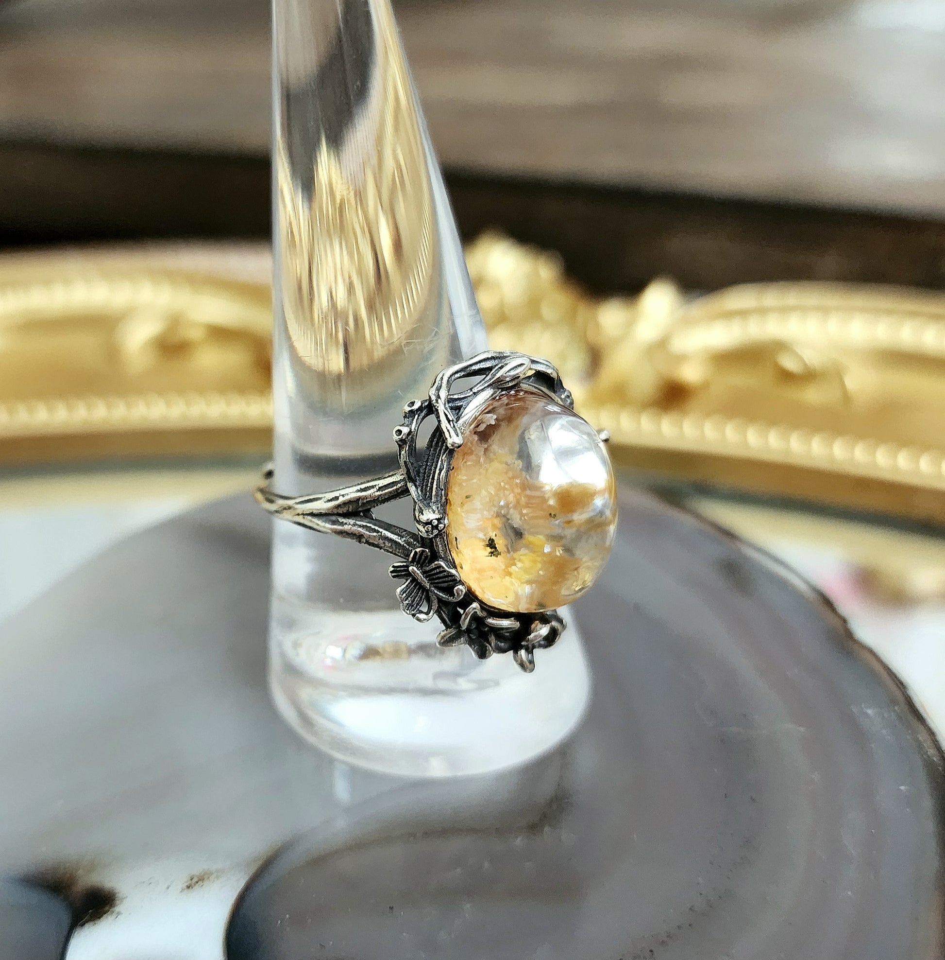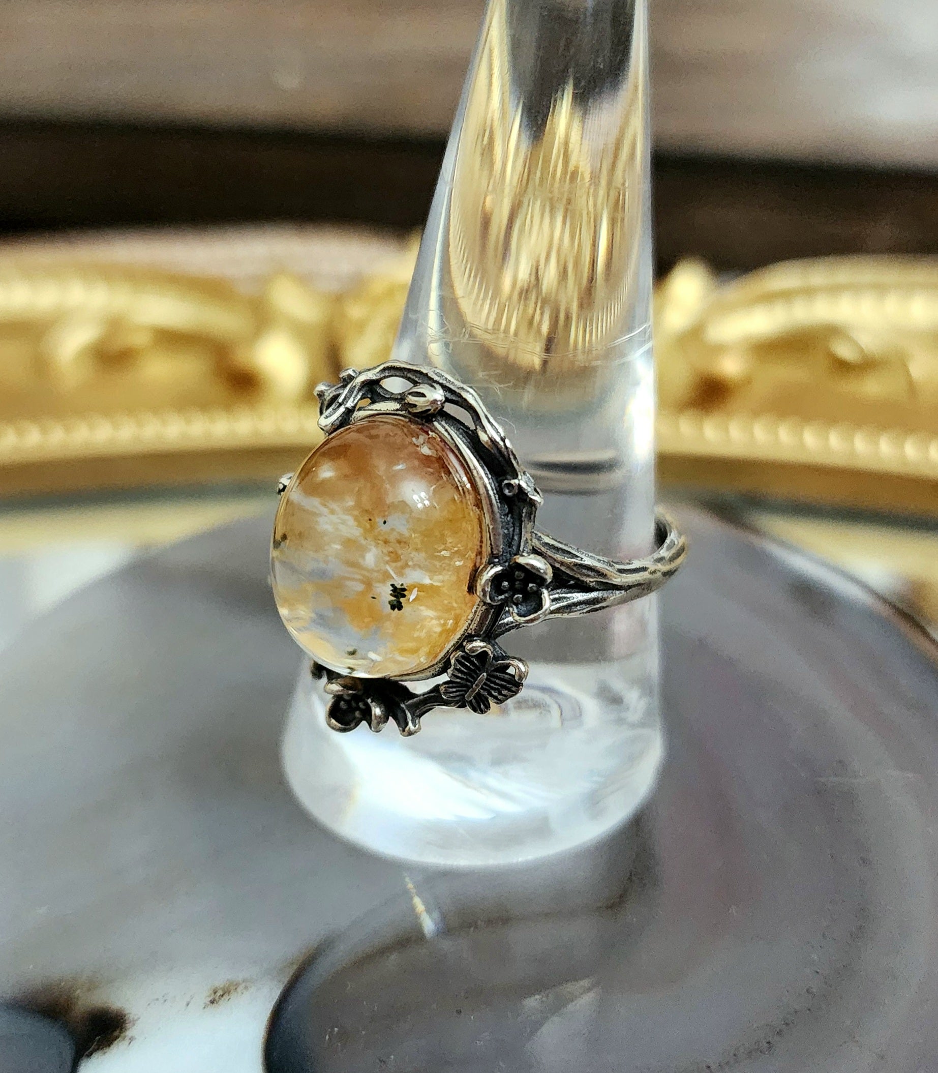 Very clear lodalite (garden quartz) stone set into an adjustable sterling silver band with flower, butterfly, and vine details.