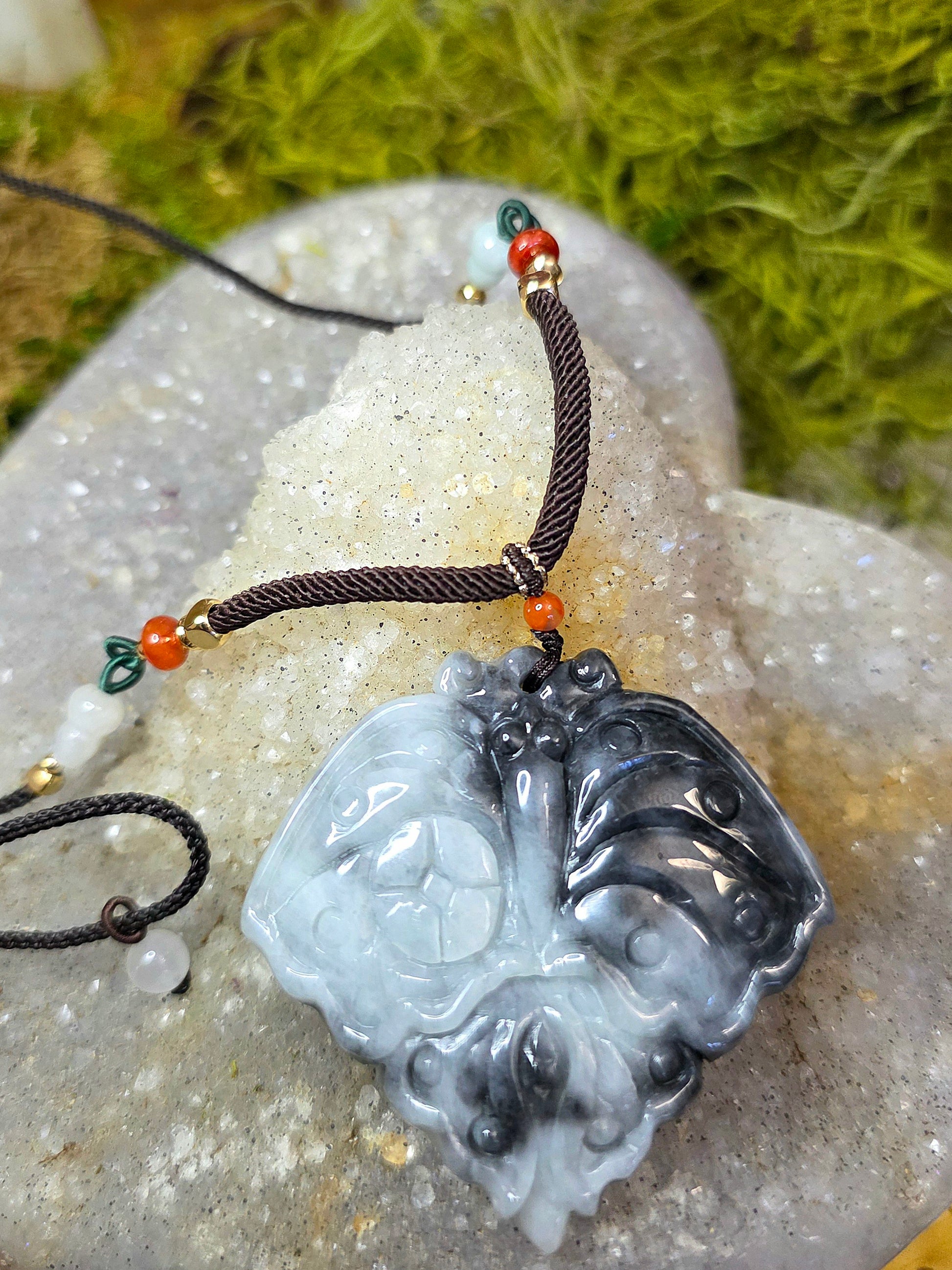 This pendant features black and white jadeite that has been hand carved into the shape of a moth. It is set onto an adjustable 26" nylon cord with jadeite and carnelian accent beads.
