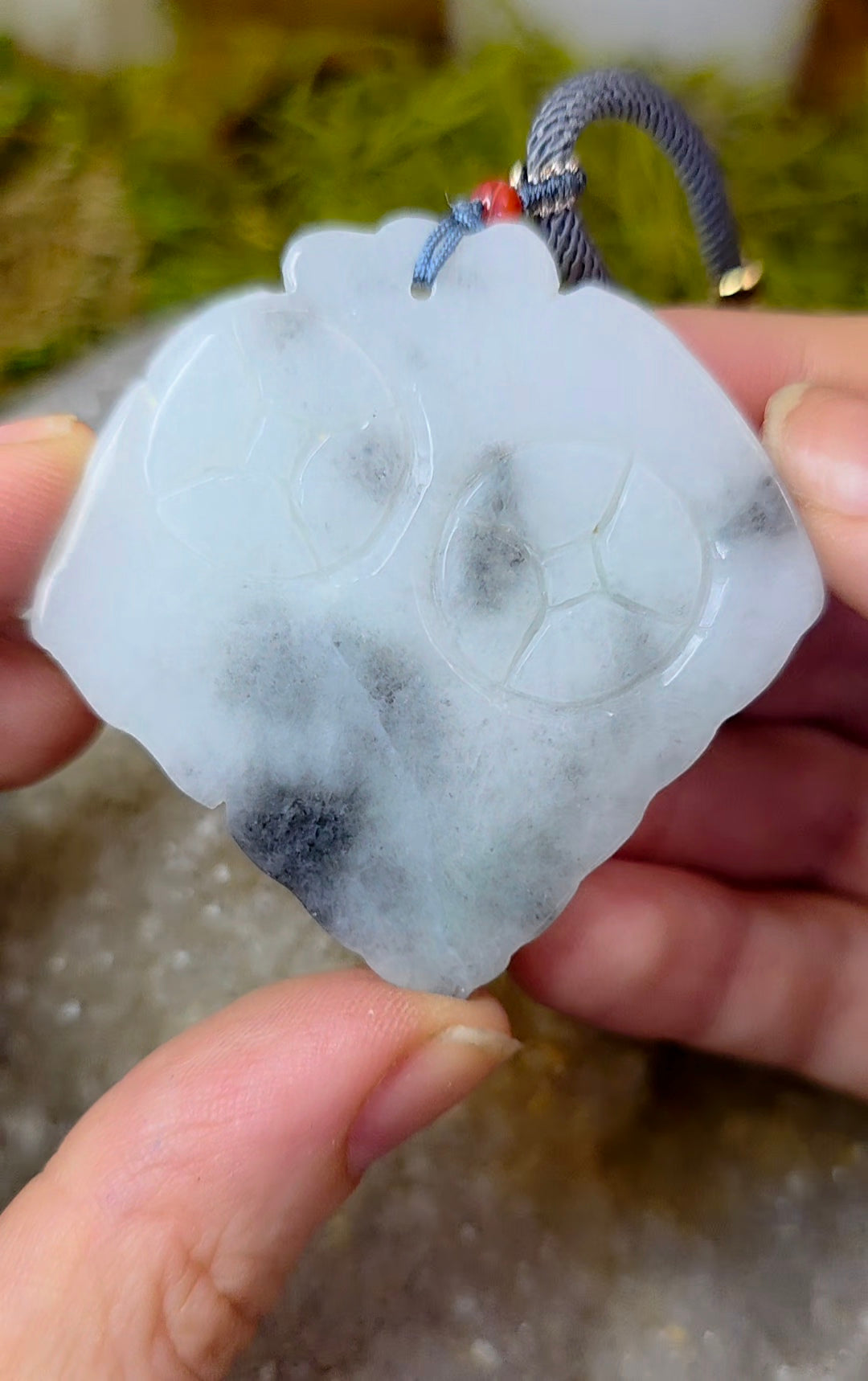This pendant features black and green jadeite that has been hand carved into the shape of a moth. It is set onto an adjustable 26" nylon cord with jadeite and carnelian accent beads.