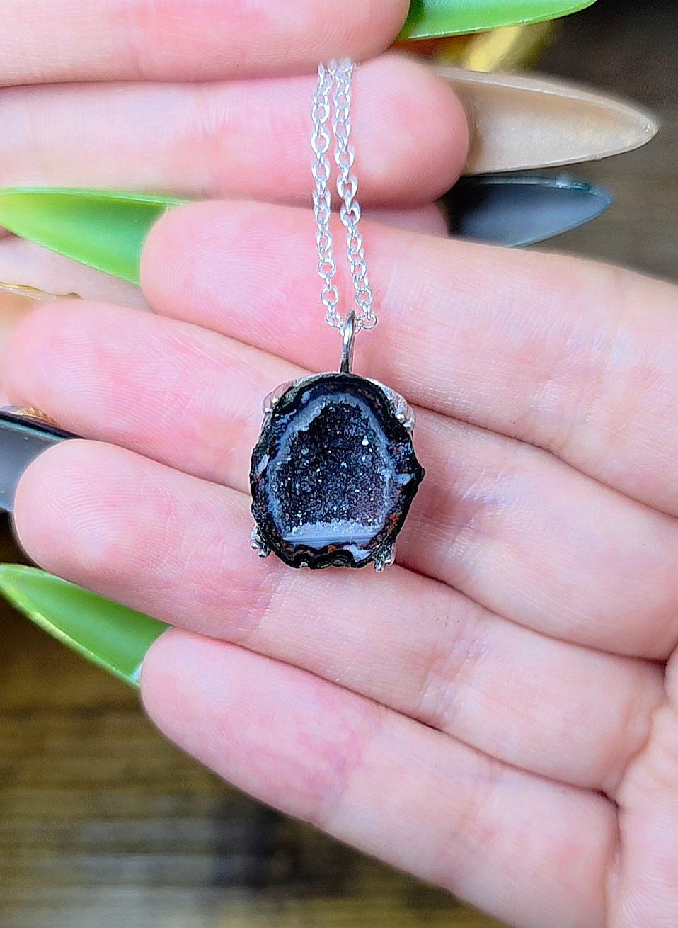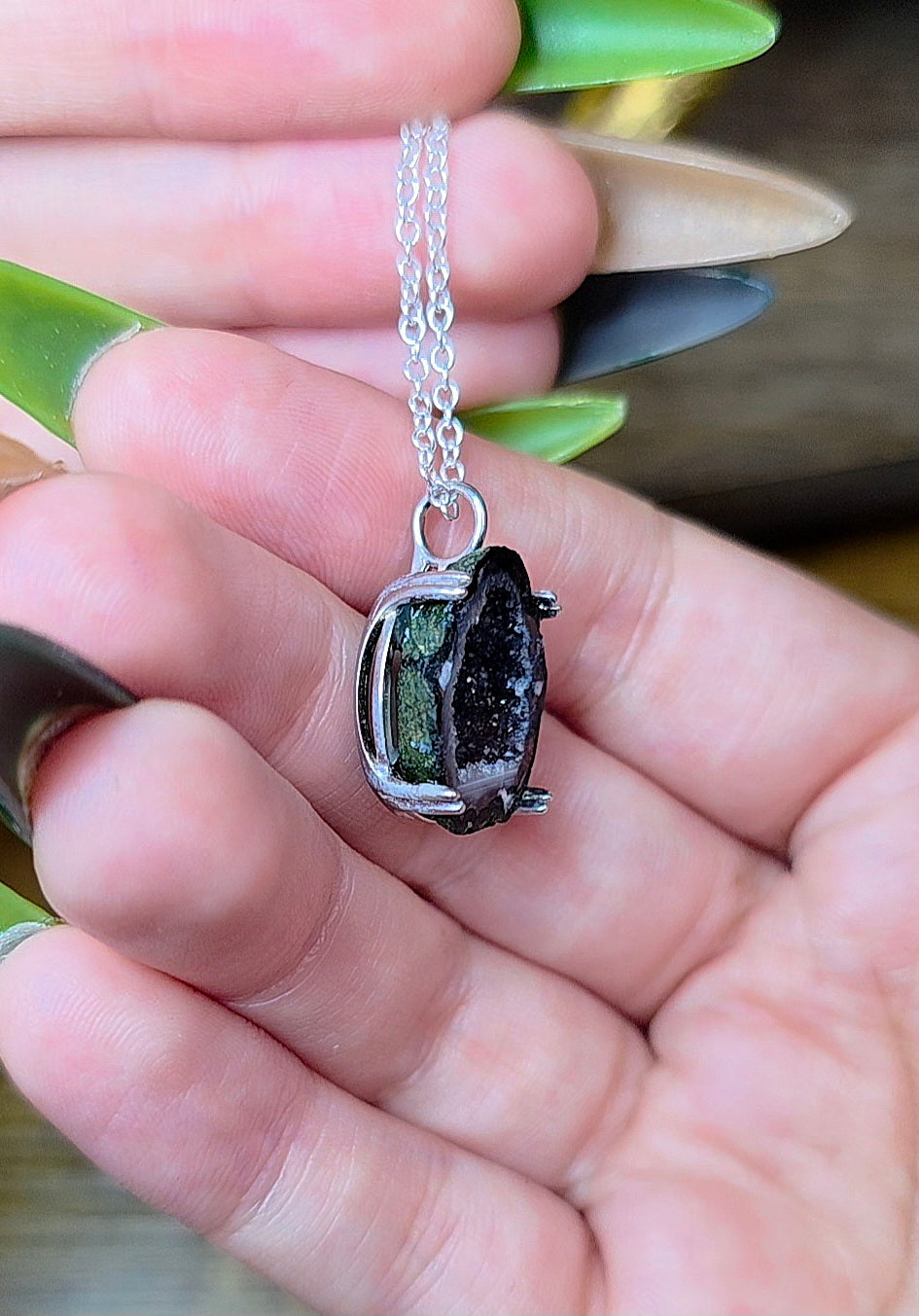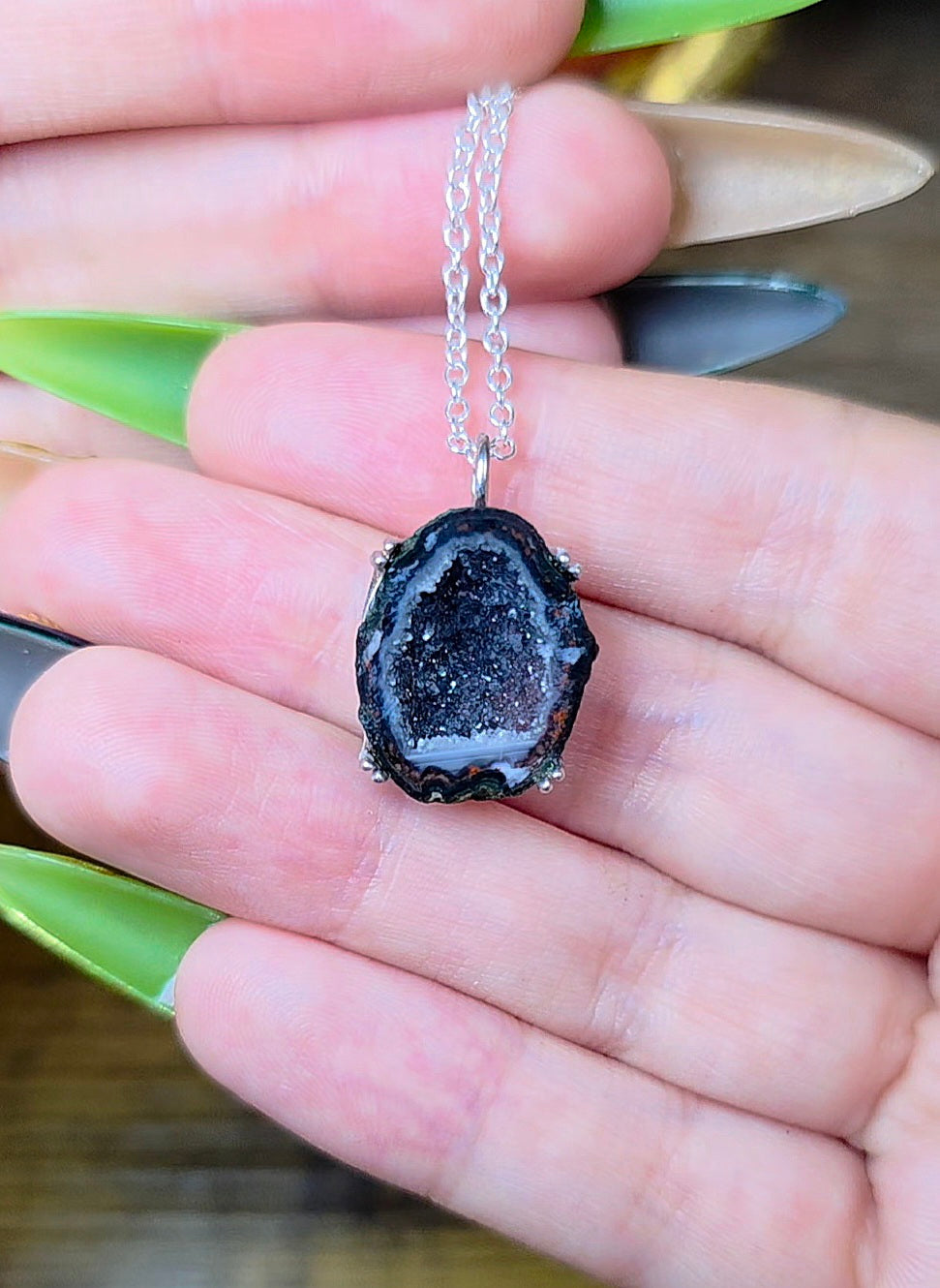 This 18x15mm black geode is set into a simple sterling silver pendant bail and comes with a silver plated base metal chain.