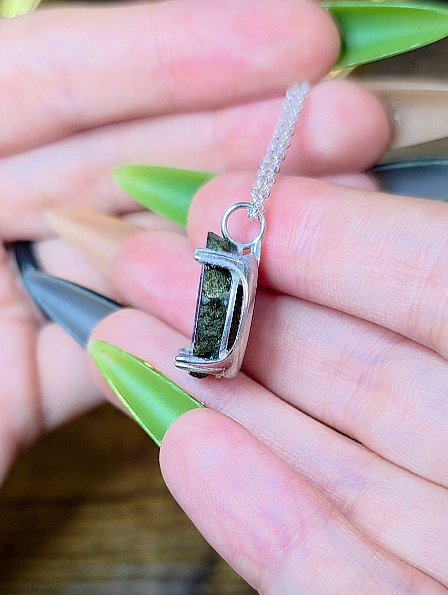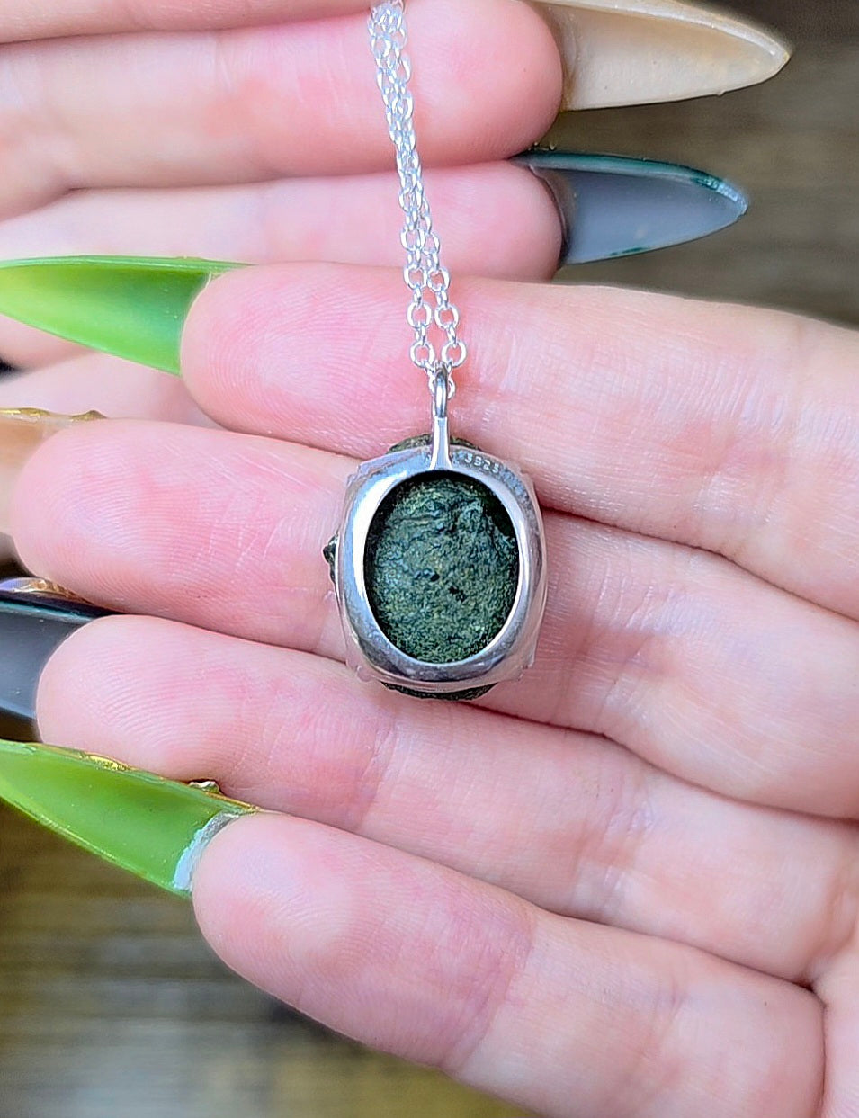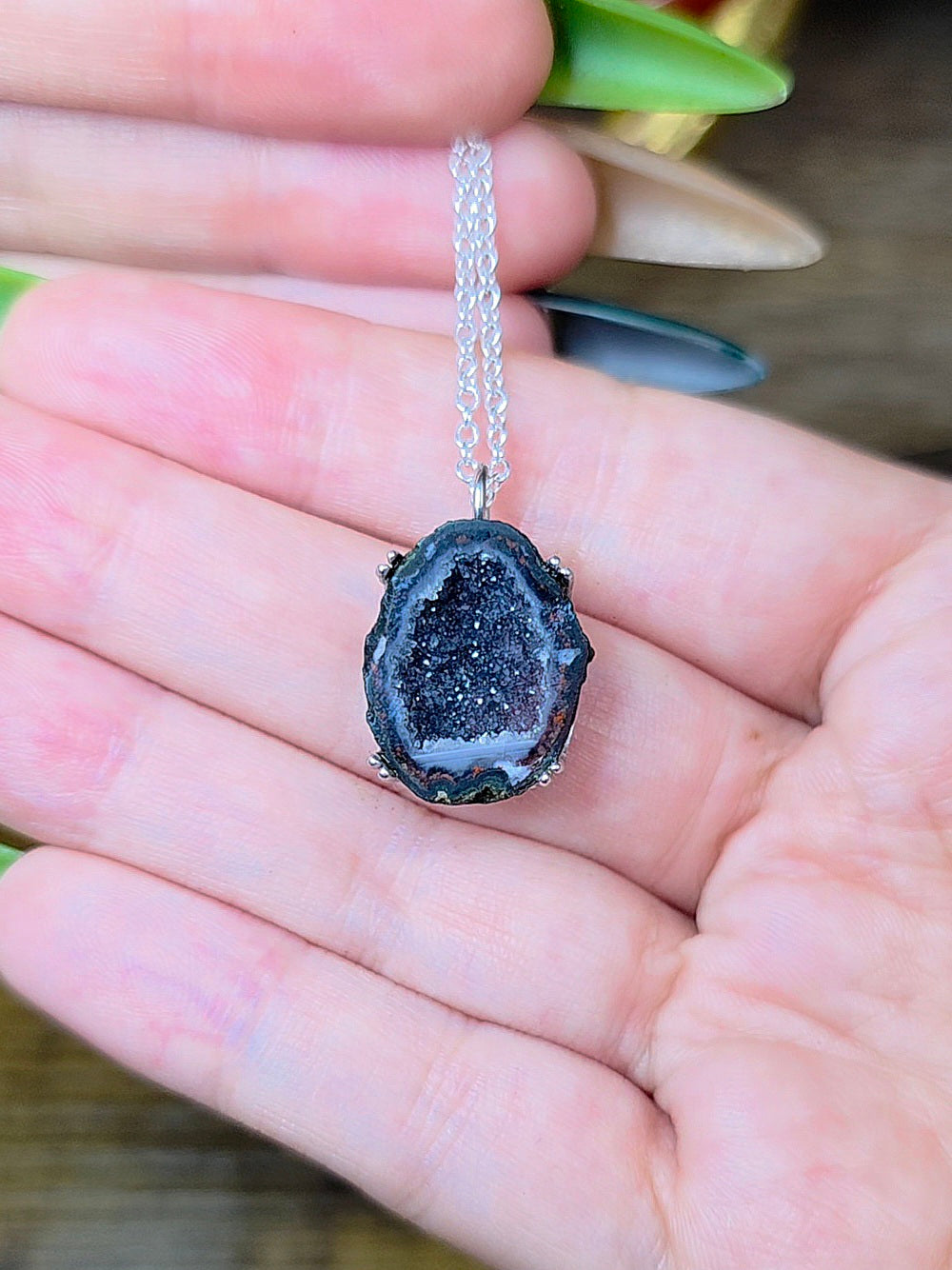 This 18x15mm black geode is set into a simple sterling silver pendant bail and comes with a silver plated base metal chain.