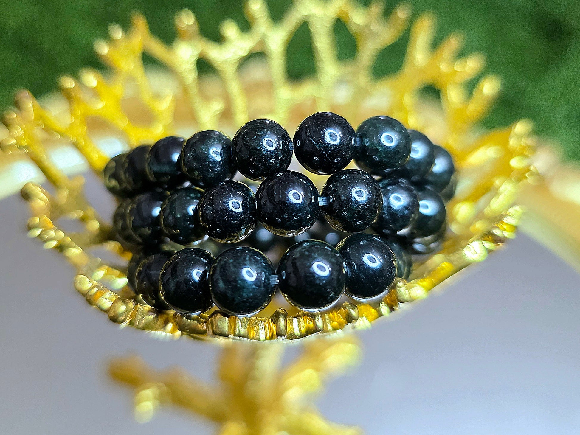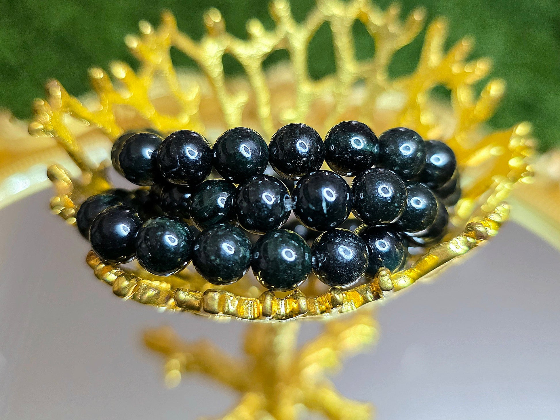 This stretch bracelet features 8mm black jadeite beads set on a stretchy cord.