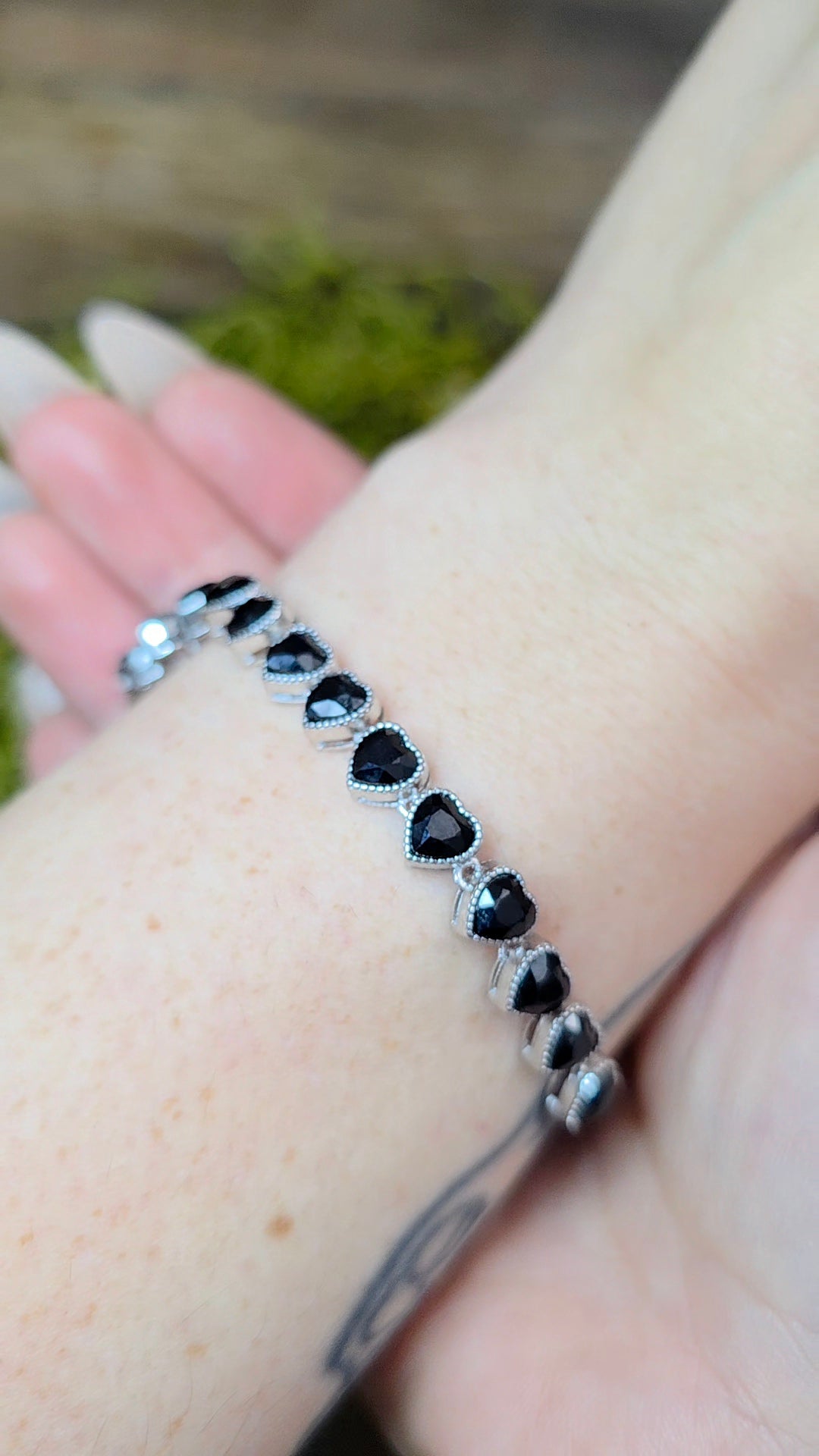 This sterling silver bracelet is adjustable up to 7 - 8 inches and features twenty 6mm heart shaped, faceted, spinel crystals.
