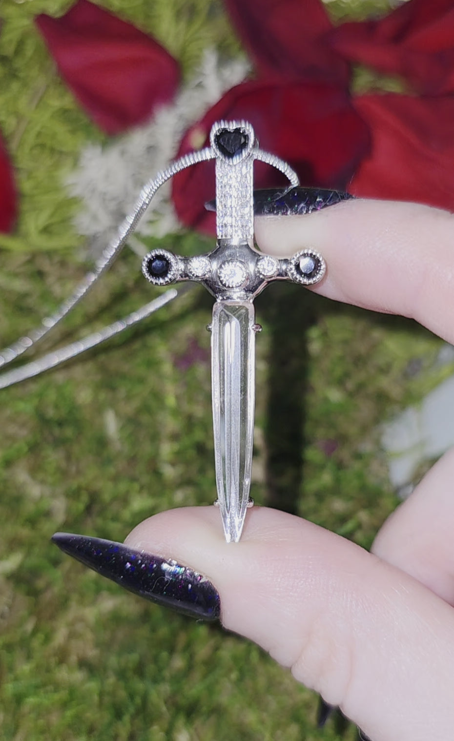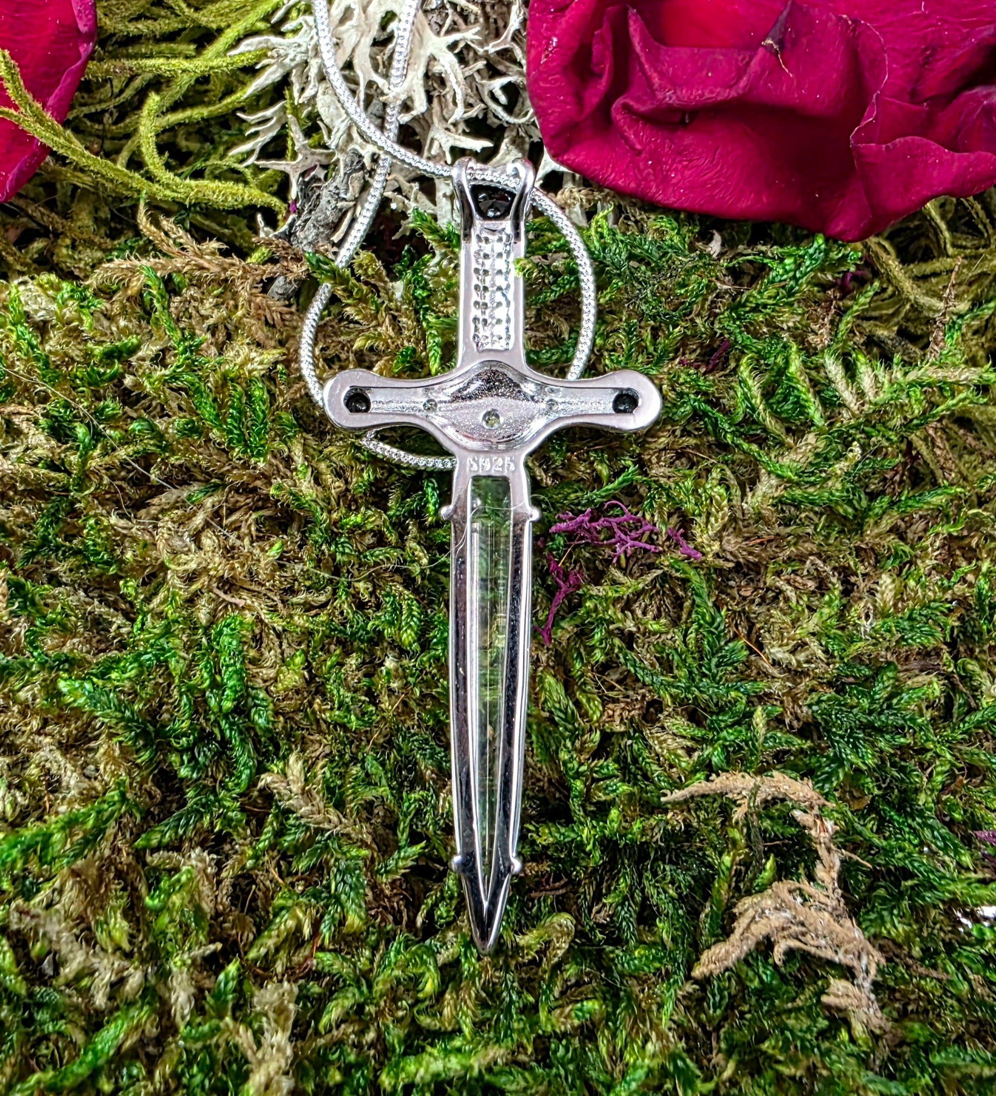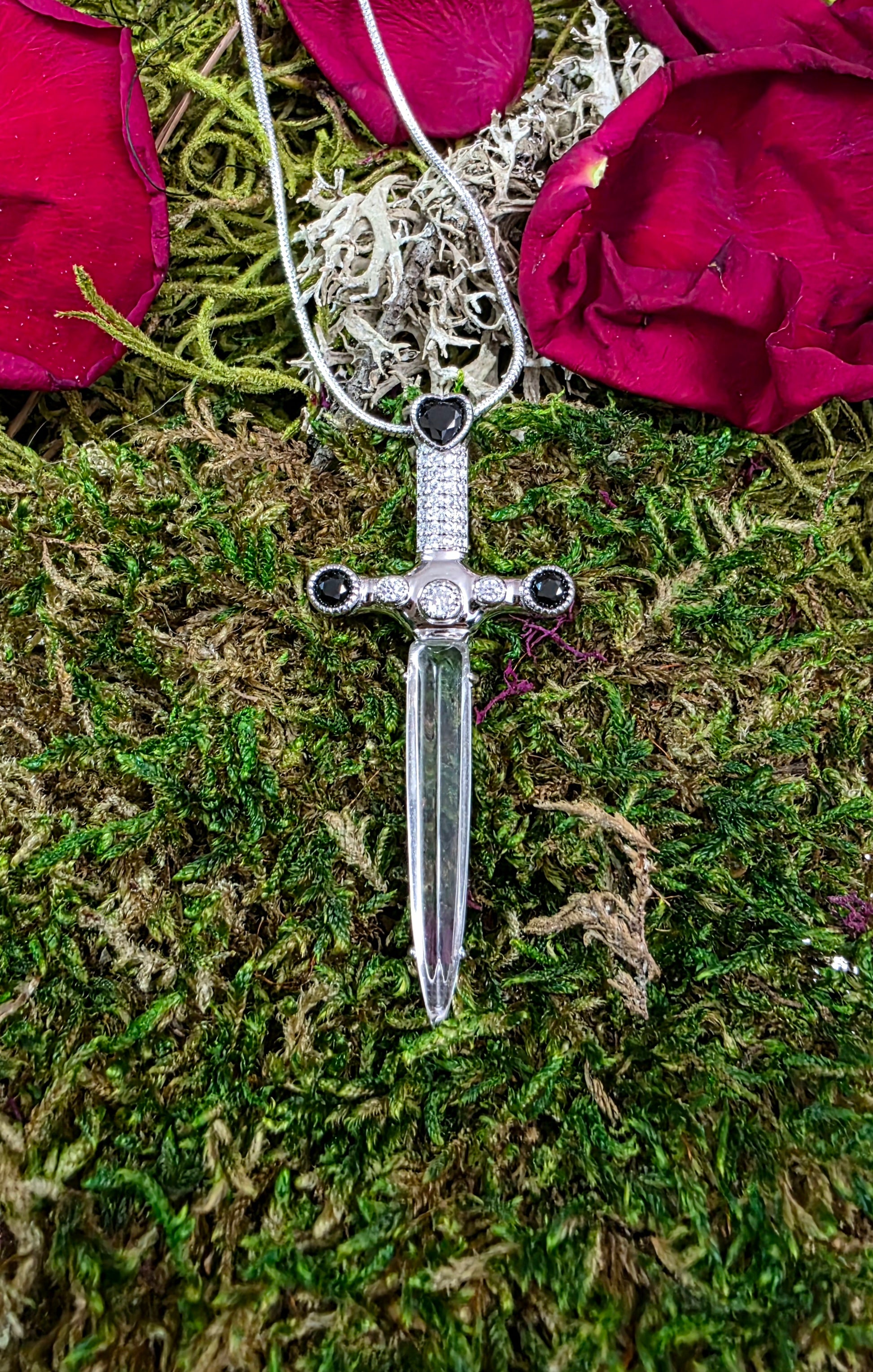 This sword pendant features a clear quartz blade and a sterling silver hilt with zircon and black tourmaline decorations.