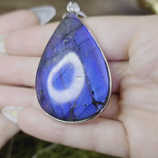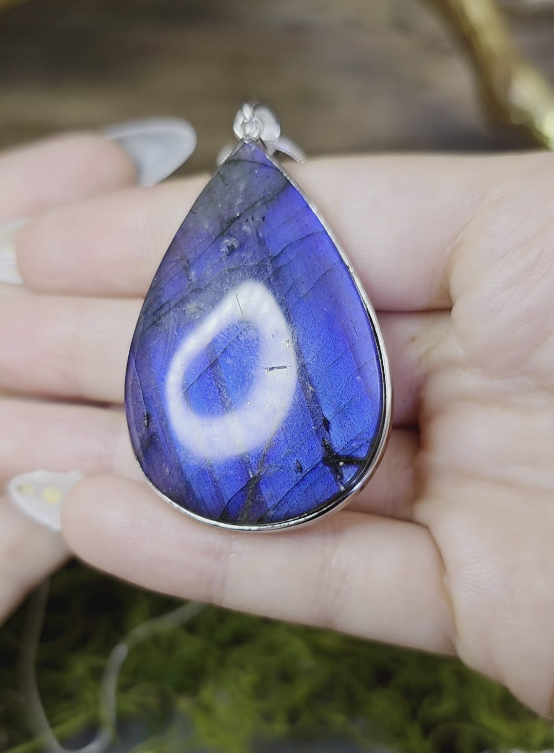 Extremely bright blue labradorite set into a sterling silver pendant bail.