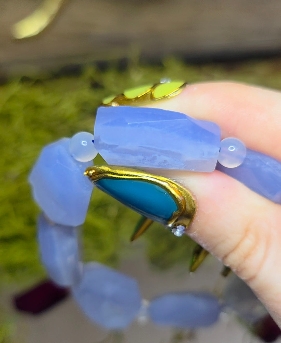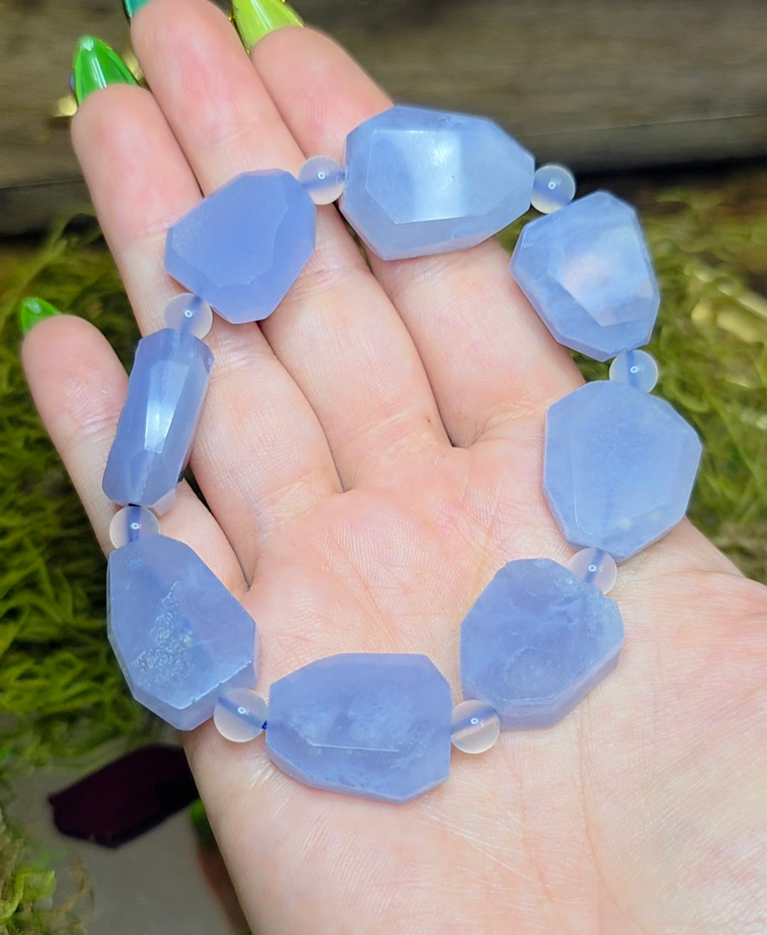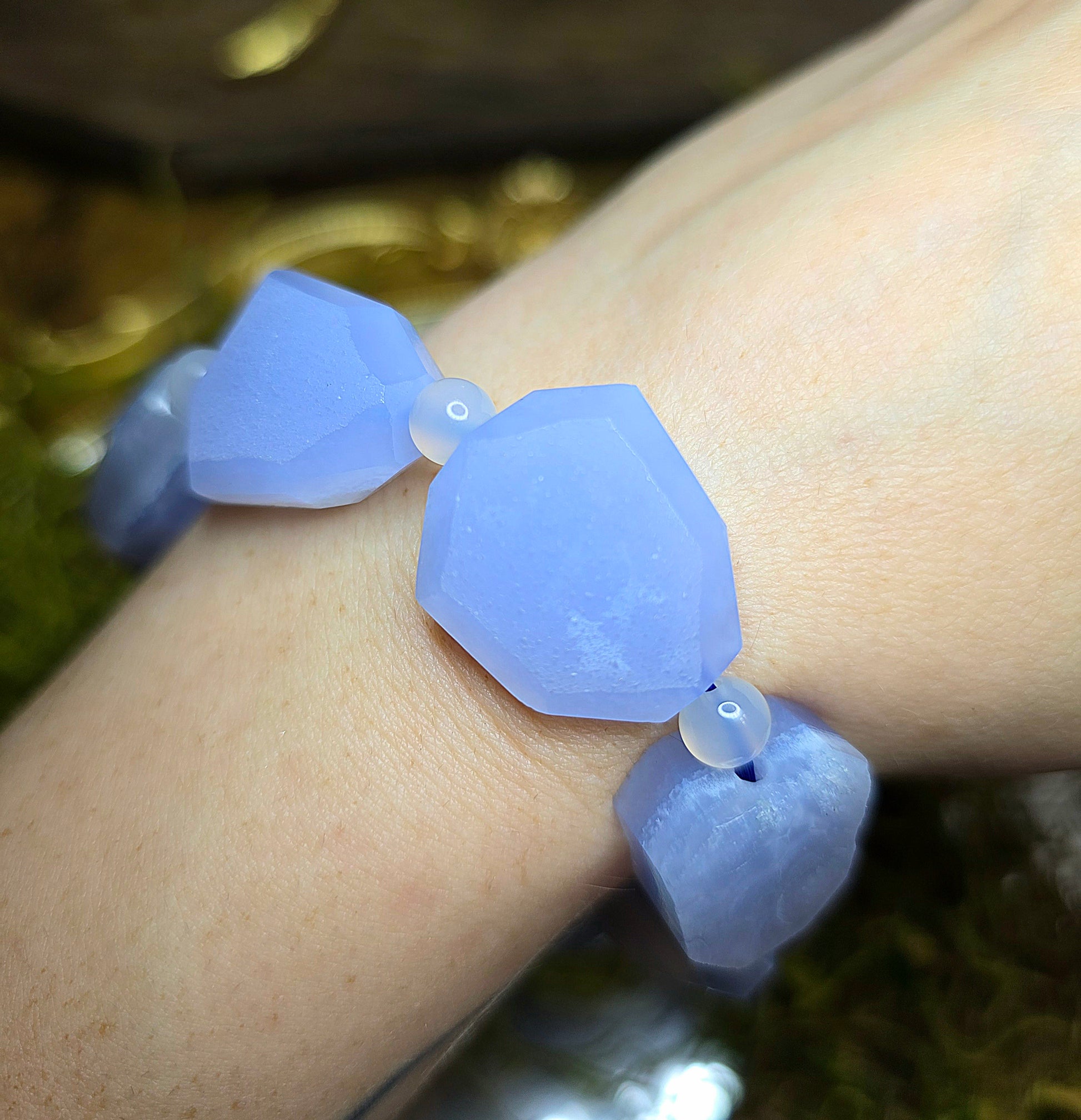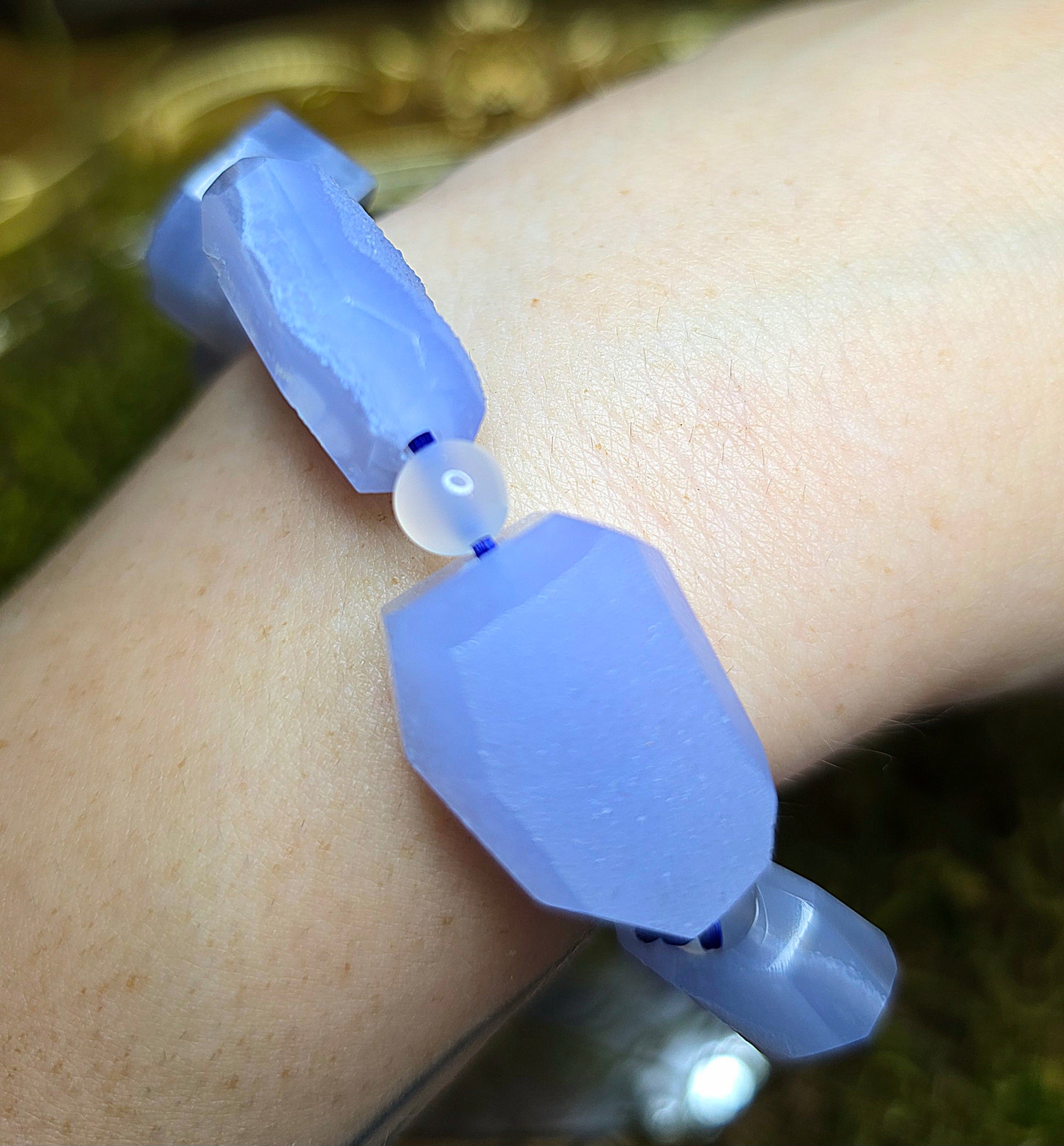 This bracelet features 8 roughly 21x8mm blue lace agate freeform beads separated by 6mm milky chalcedony beads.