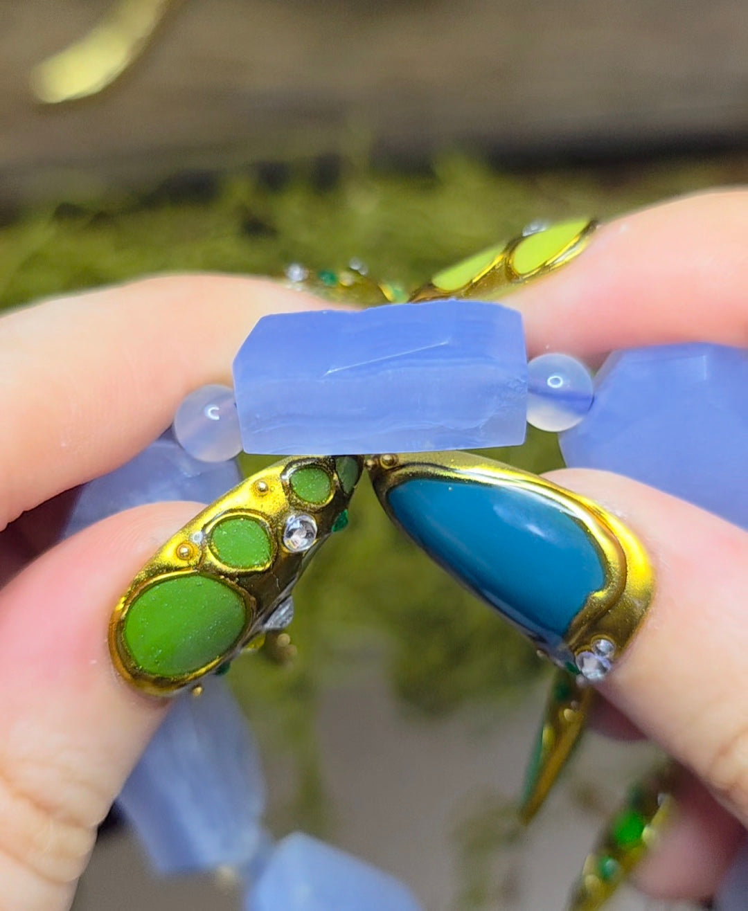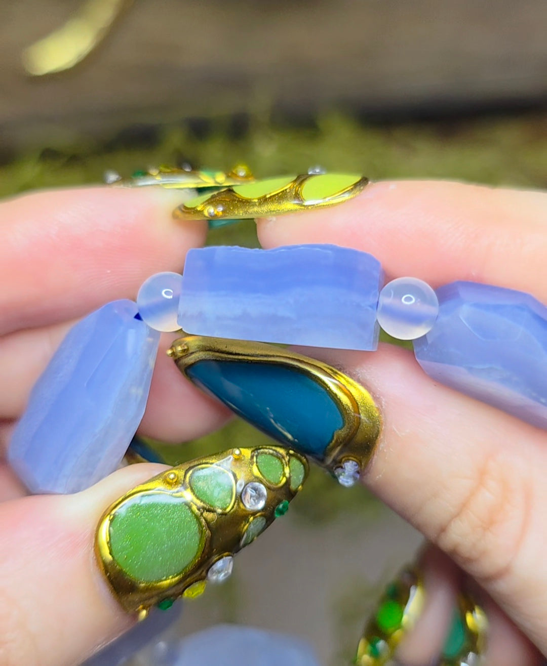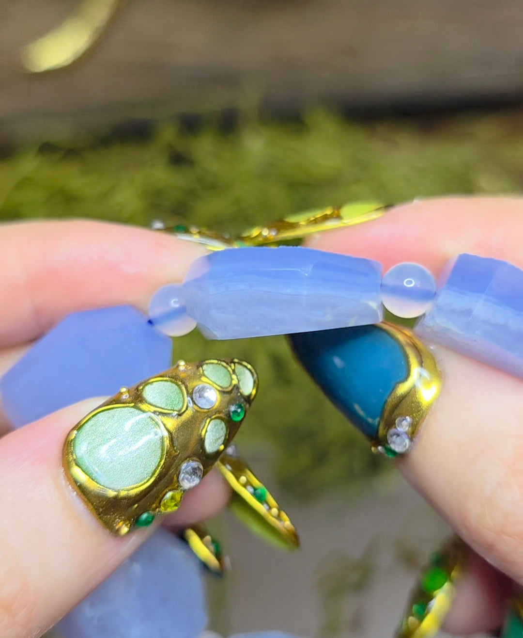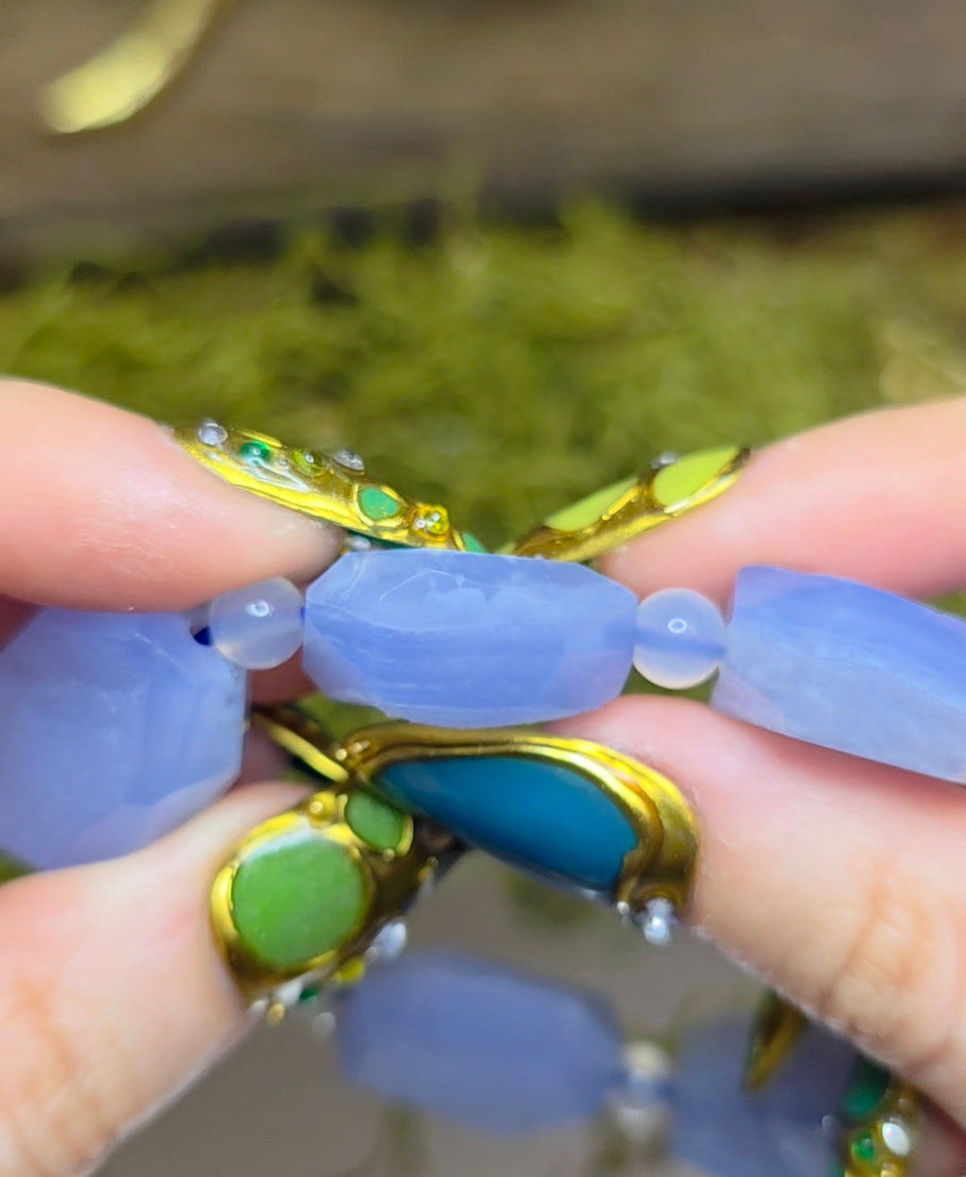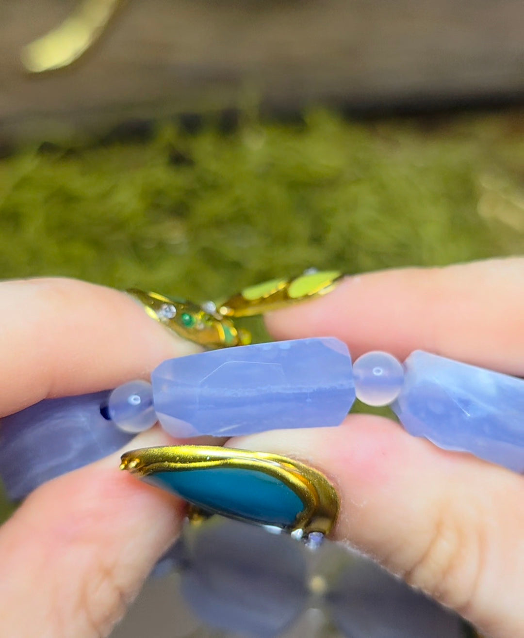 This bracelet features 8 roughly 21x8mm blue lace agate freeform beads separated by 6mm milky chalcedony beads.