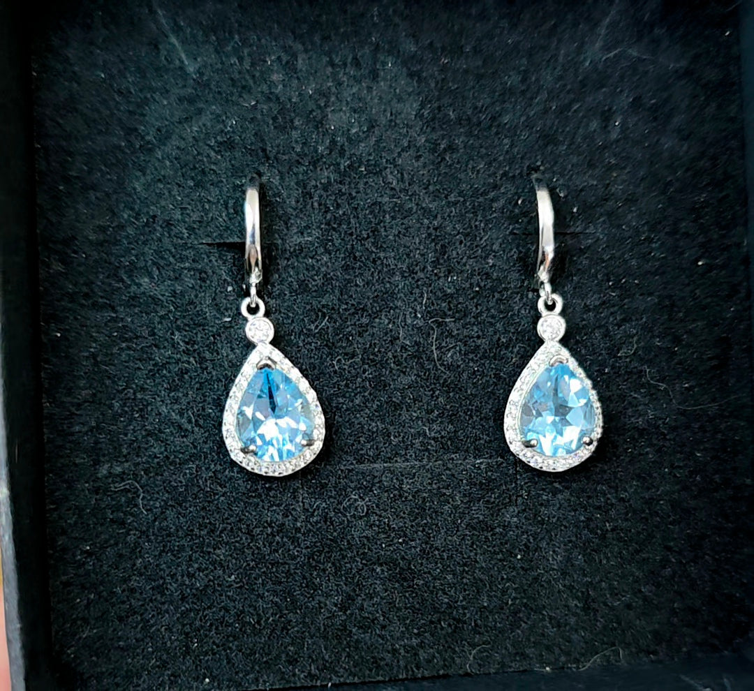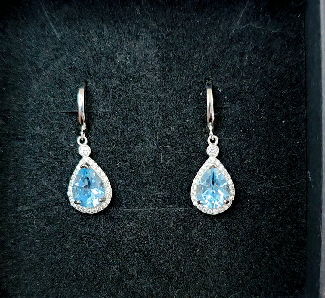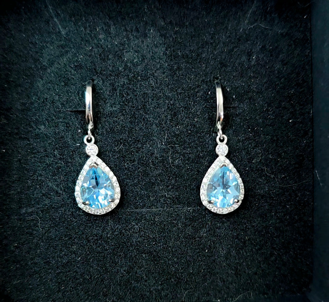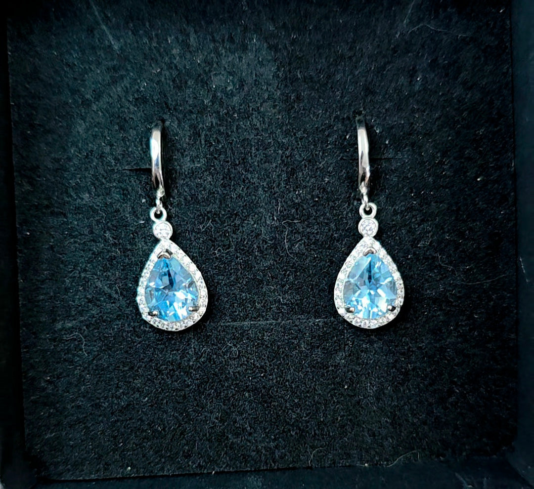 9x7mm faceted light blue topaz crystals set into sterling silver dangling hoop earrings and decorated with many zircon stones. The earrings are approximately .6 inches long.