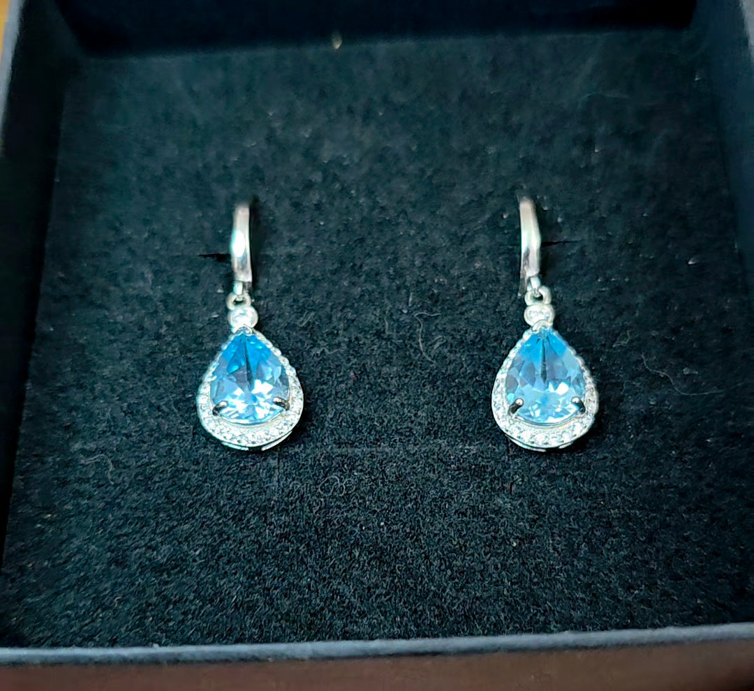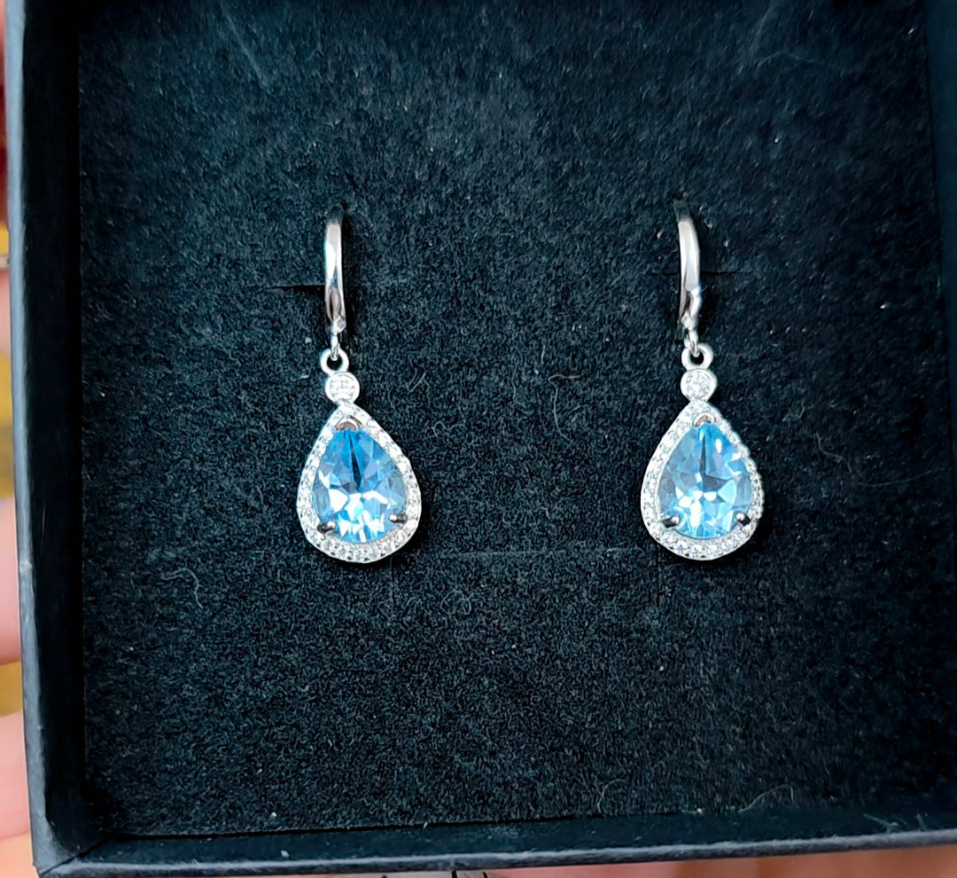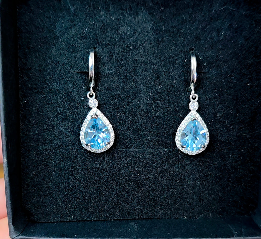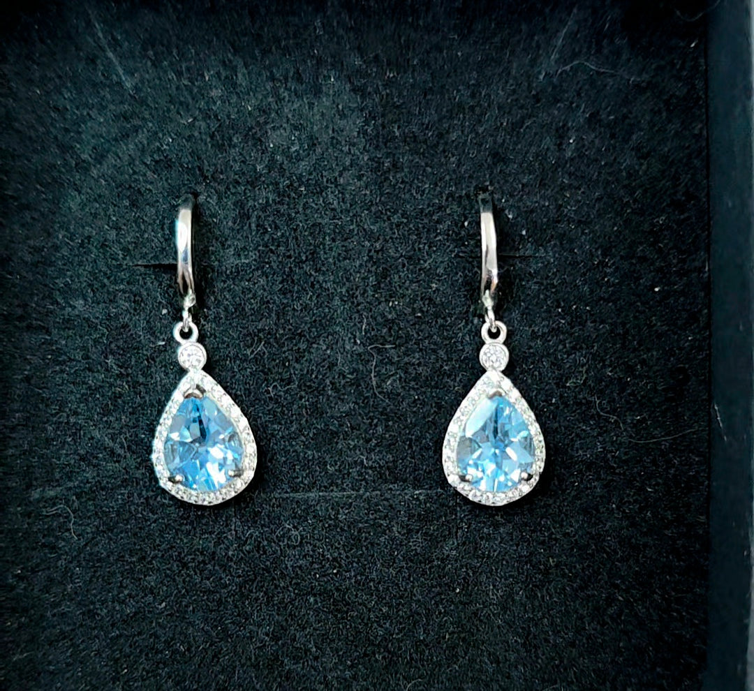 9x7mm faceted light blue topaz crystals set into sterling silver dangling hoop earrings and decorated with many zircon stones. The earrings are approximately .6 inches long.
