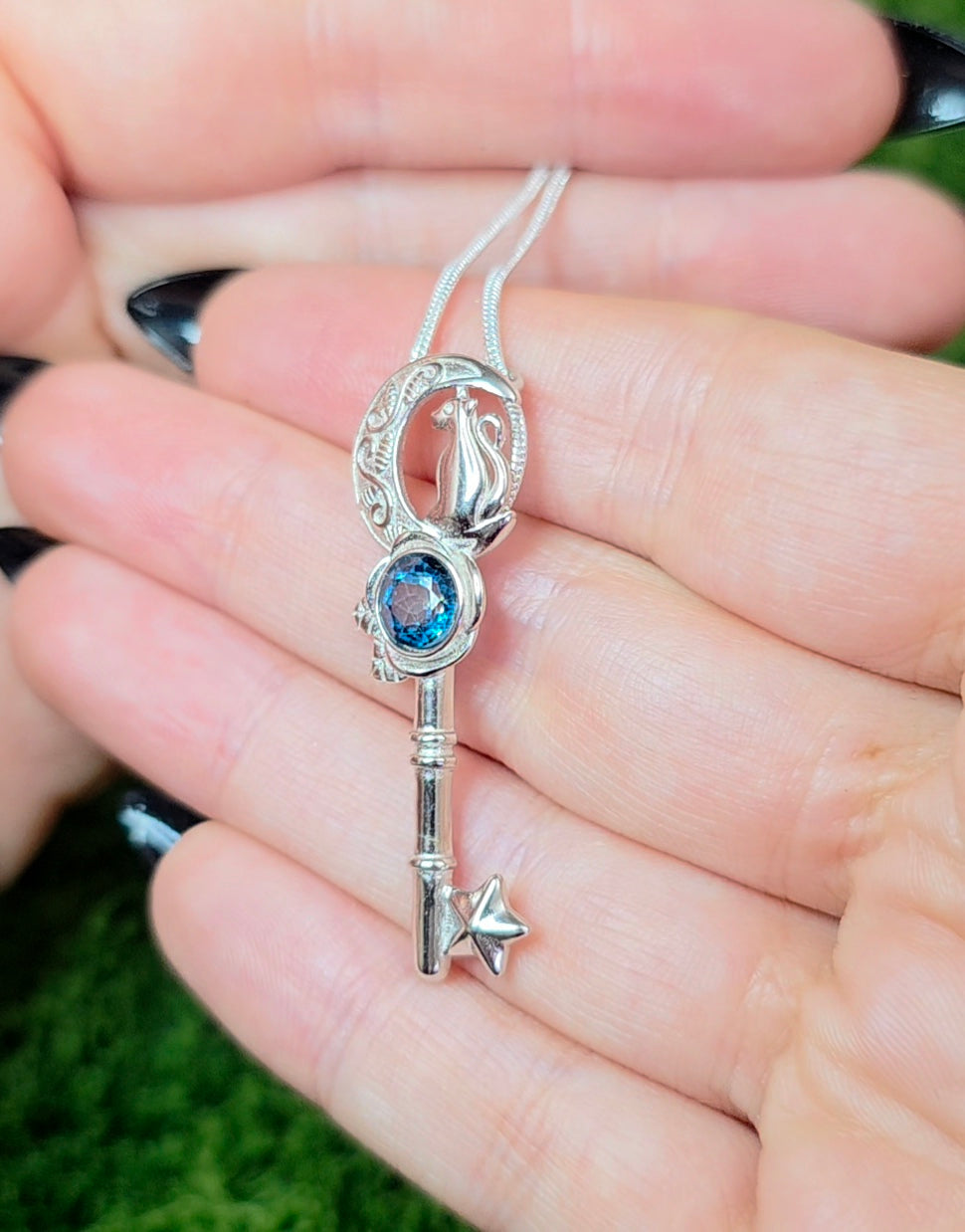 This stone has been irradiated to get its color and is approximately 7mm in size. It's set in a 1.6 inch long sterling silver key-shaped pendant with moon, star, and cat details. It comes with a base metal chain.