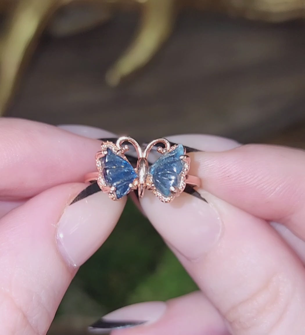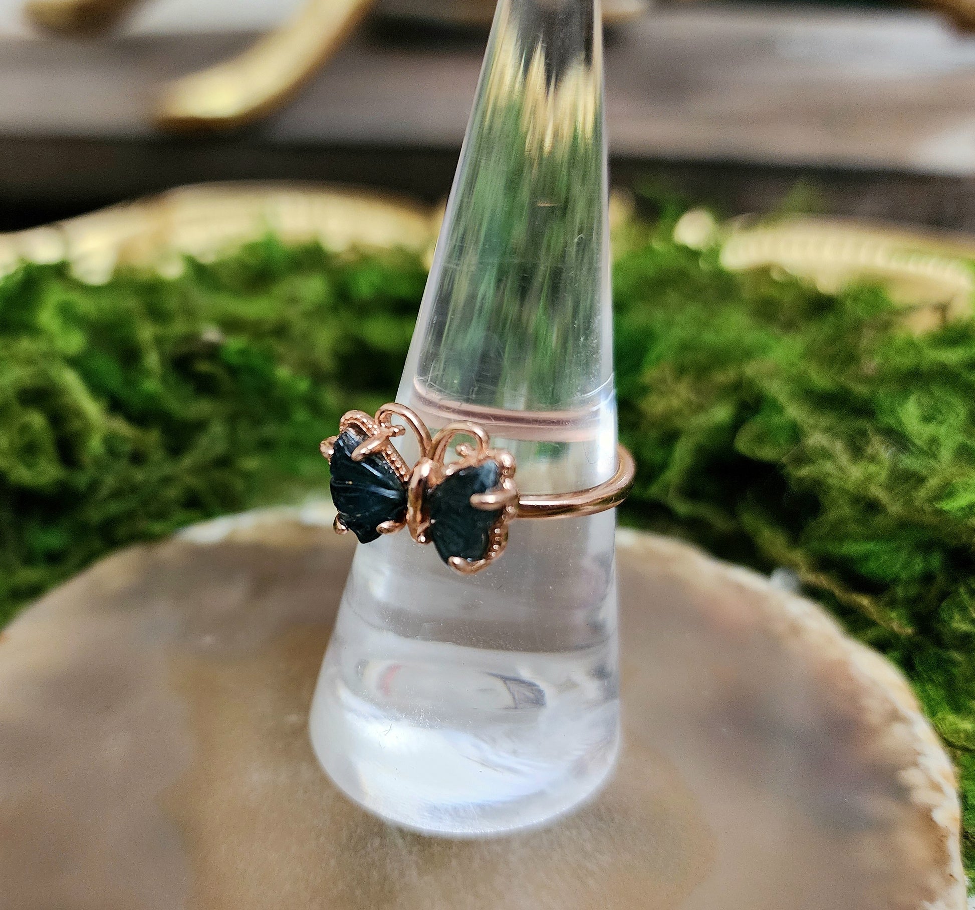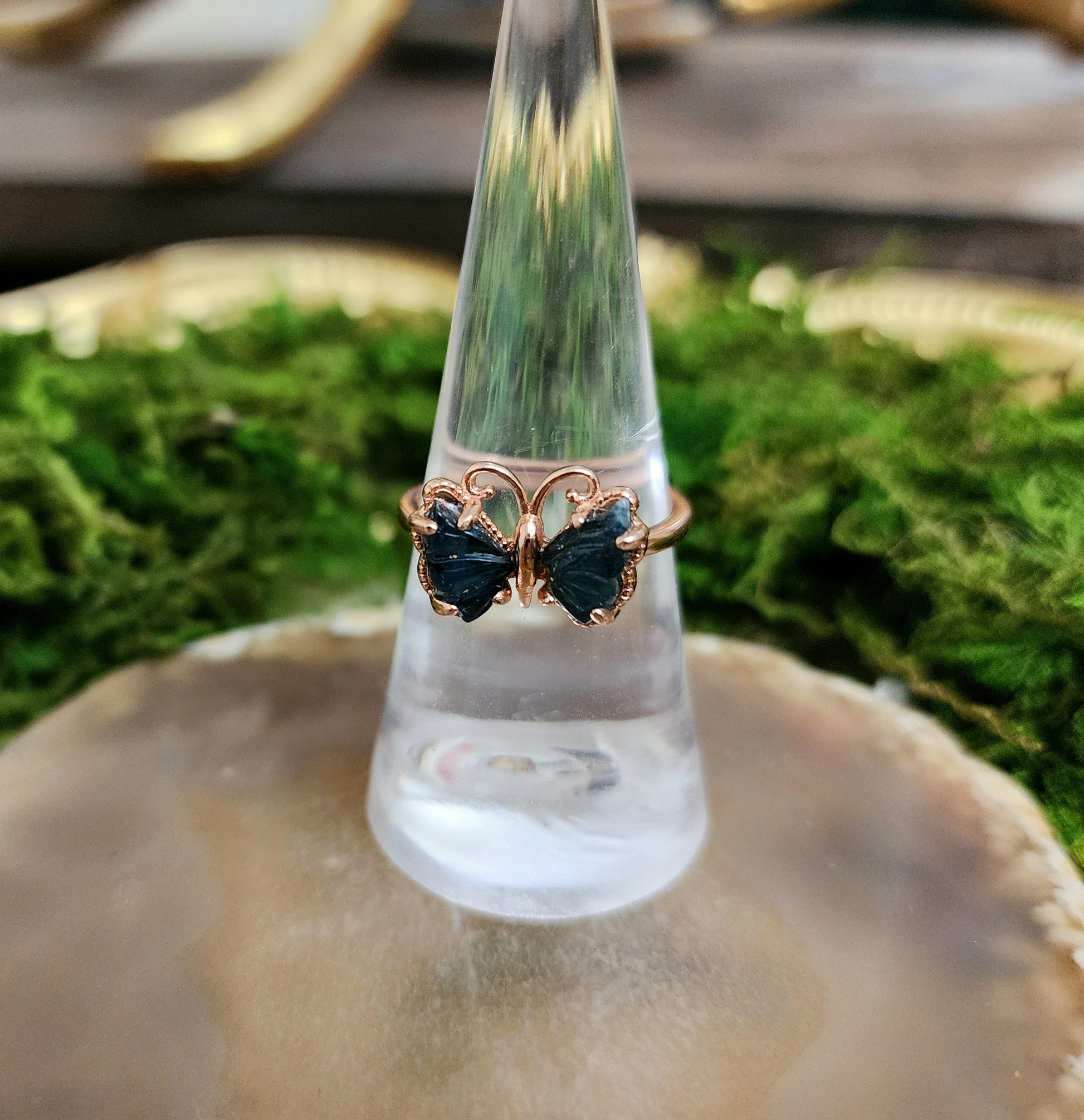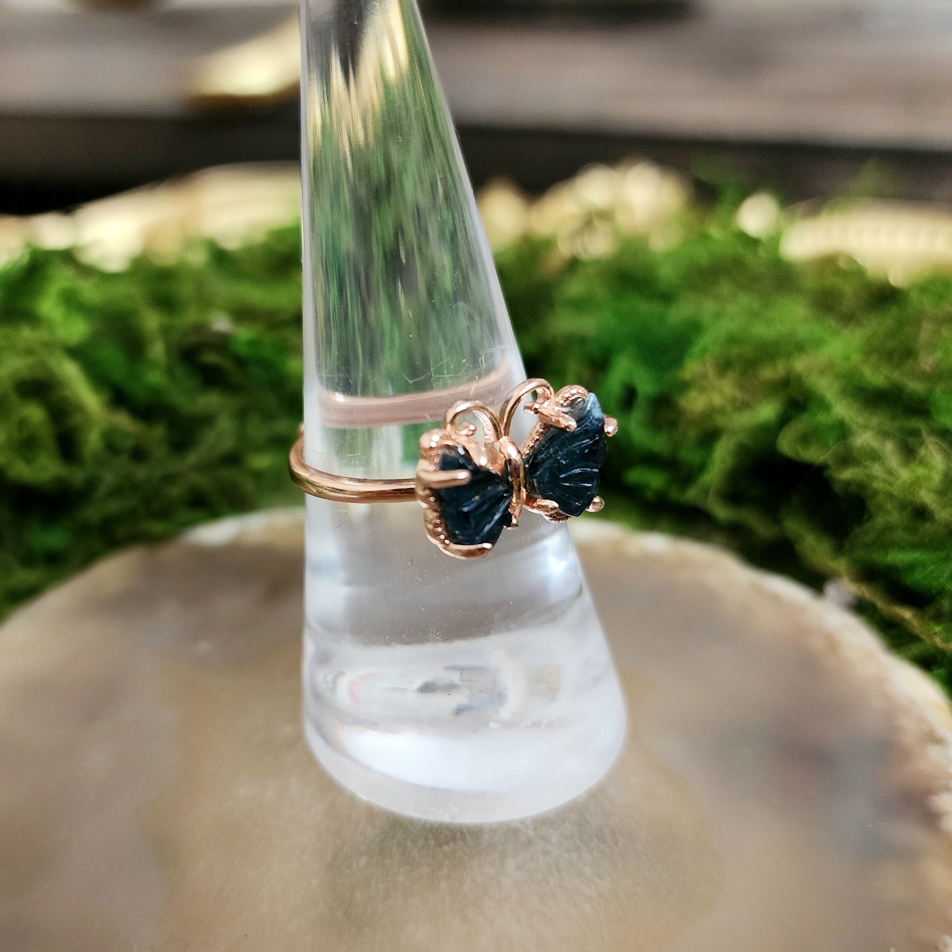 Deep blue color tourmaline carved into butterfly wings and set into a rose gold plated adjustable sterling silver ring.