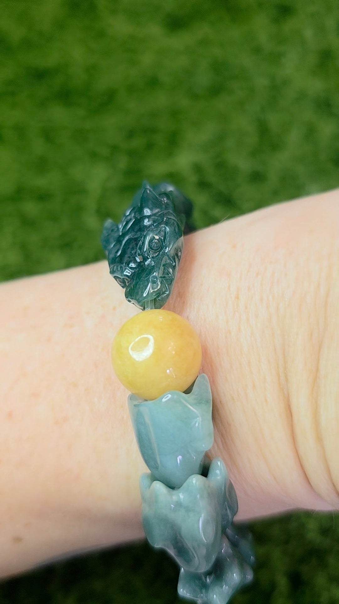 This heavy bracelet features blue water jadeite beads and one yellow jadeite bead on a stretchy cord.