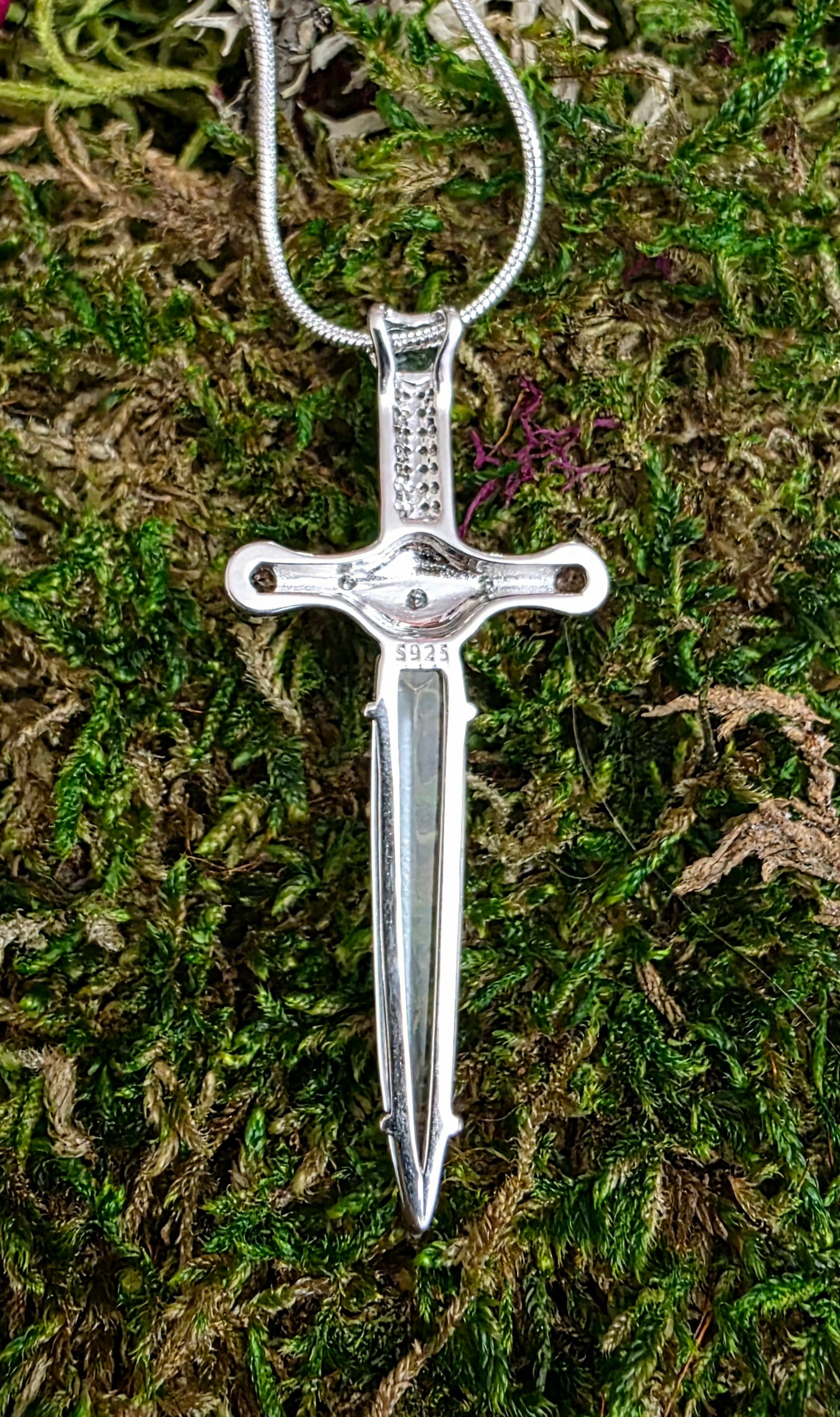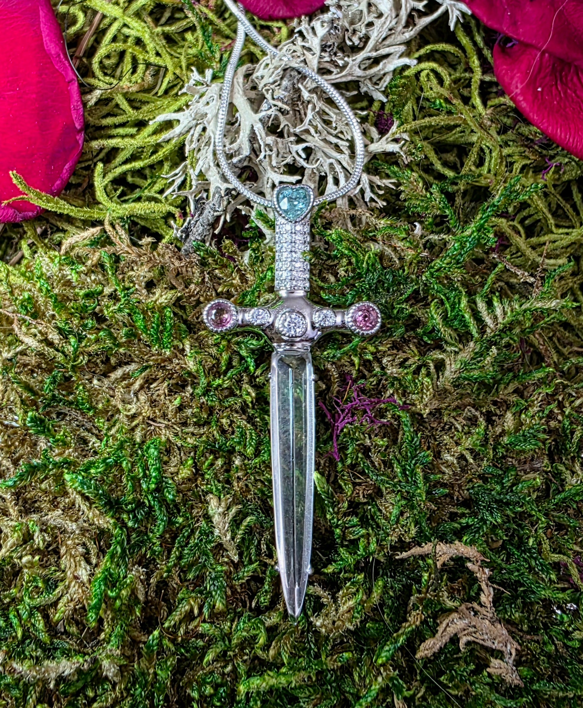 This sword pendant features a clear quartz blade and a sterling silver hilt with zircon and pink and blue tourmaline decorations.