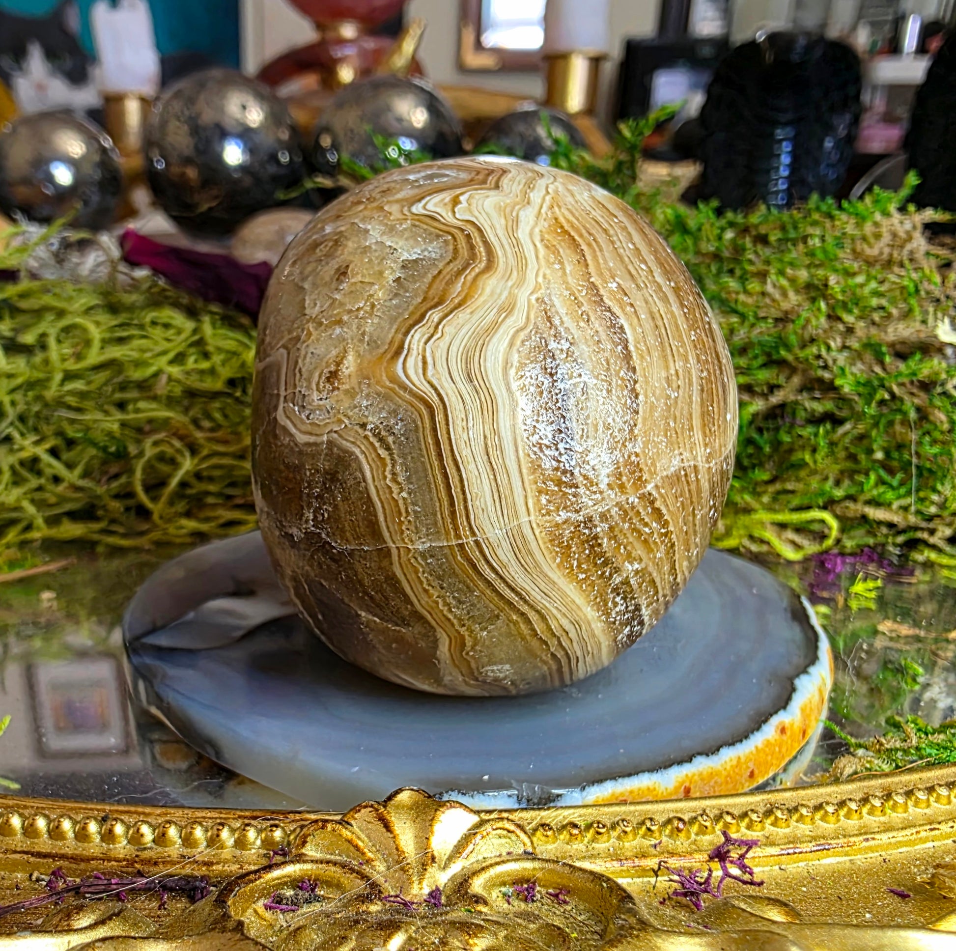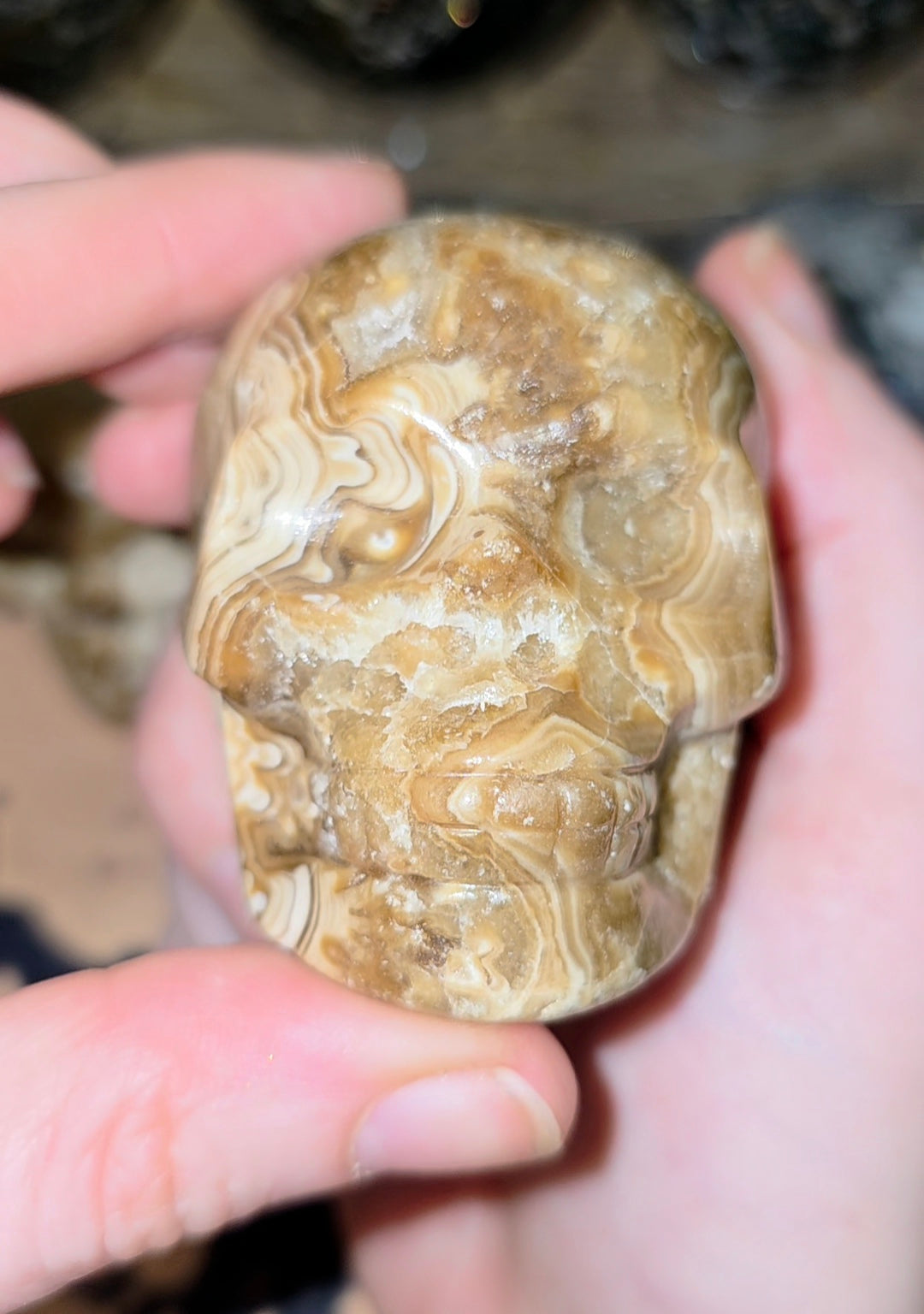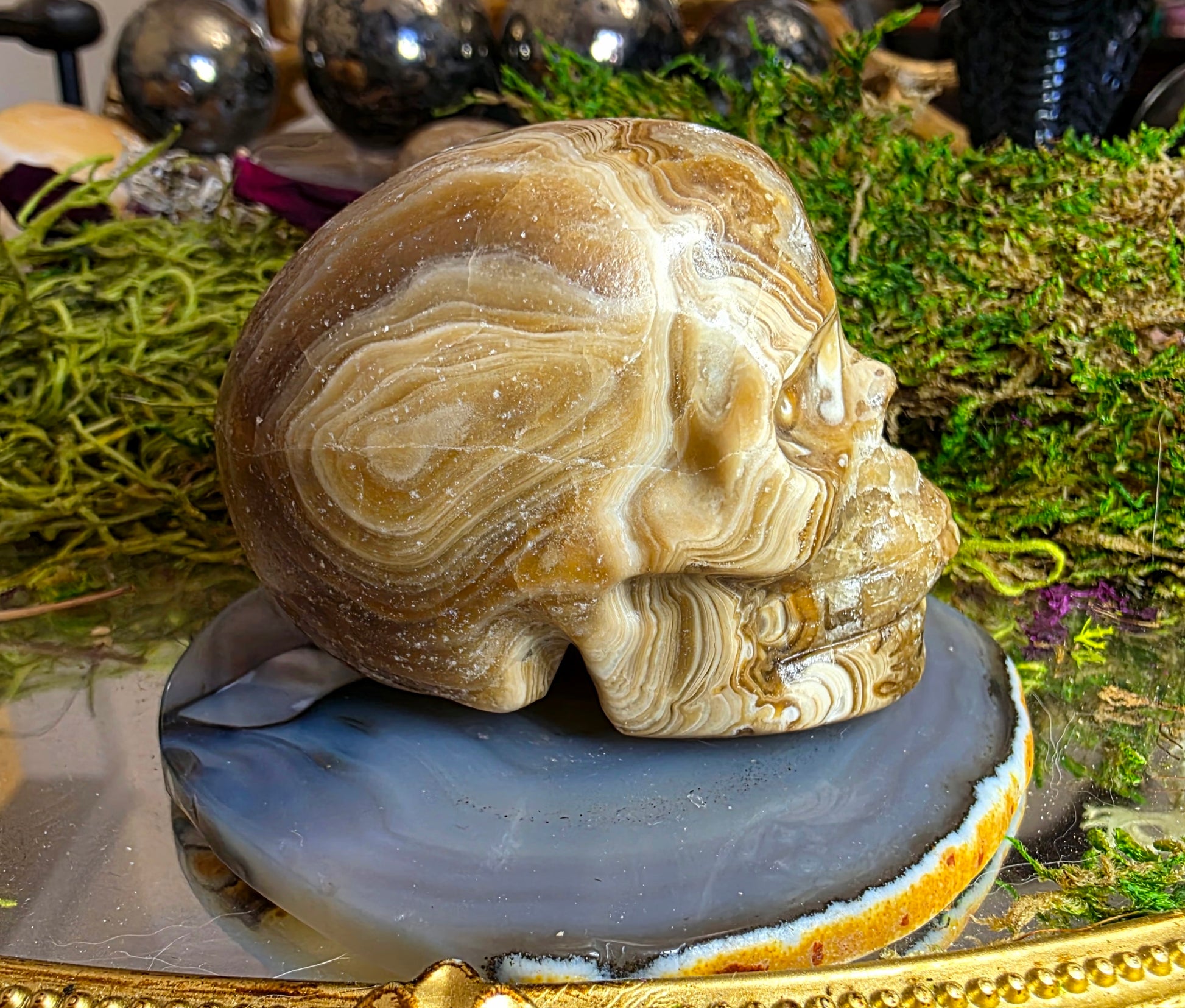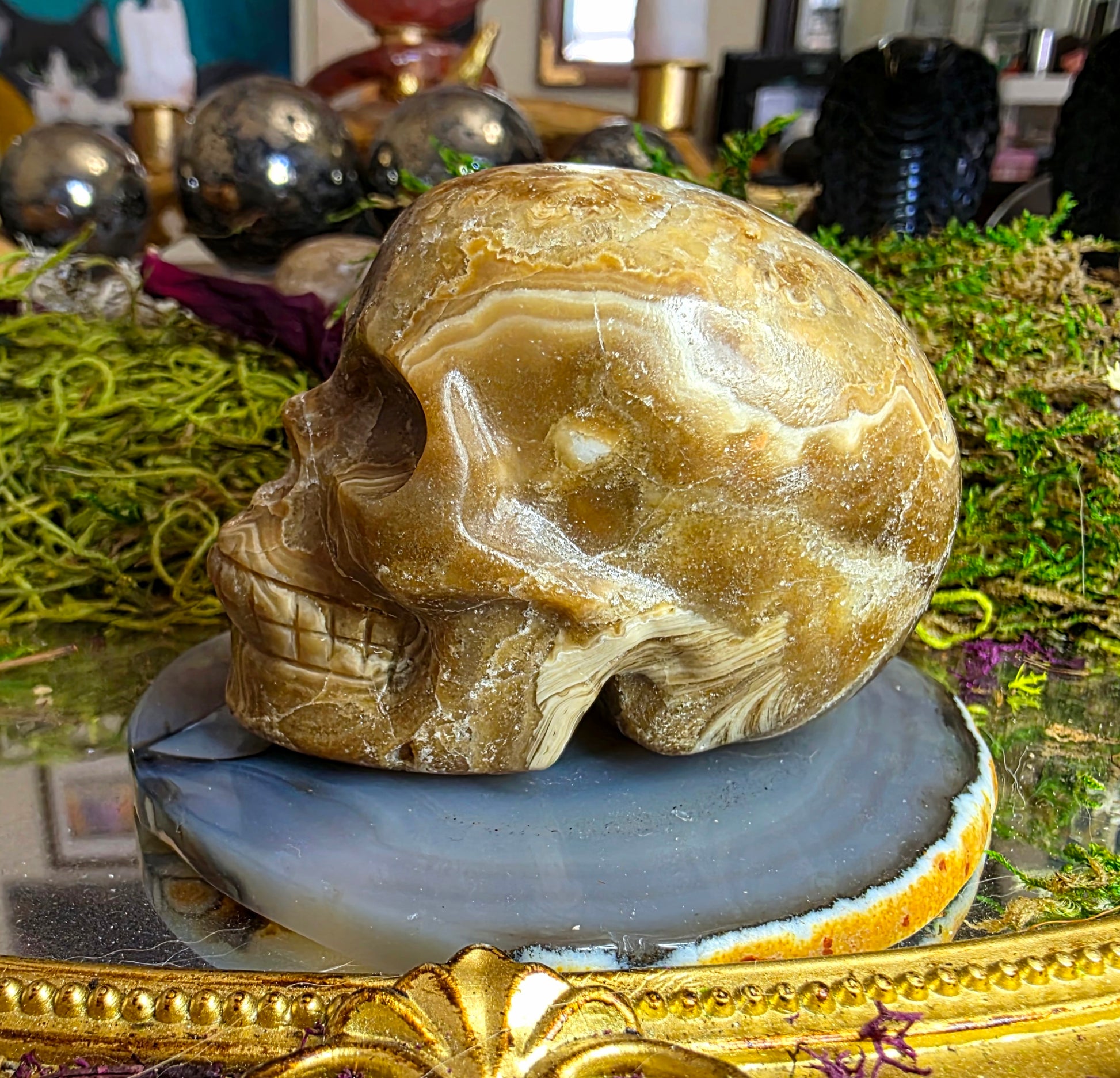 Beautifully banded chocolate calcite that has been carved into a human skull.