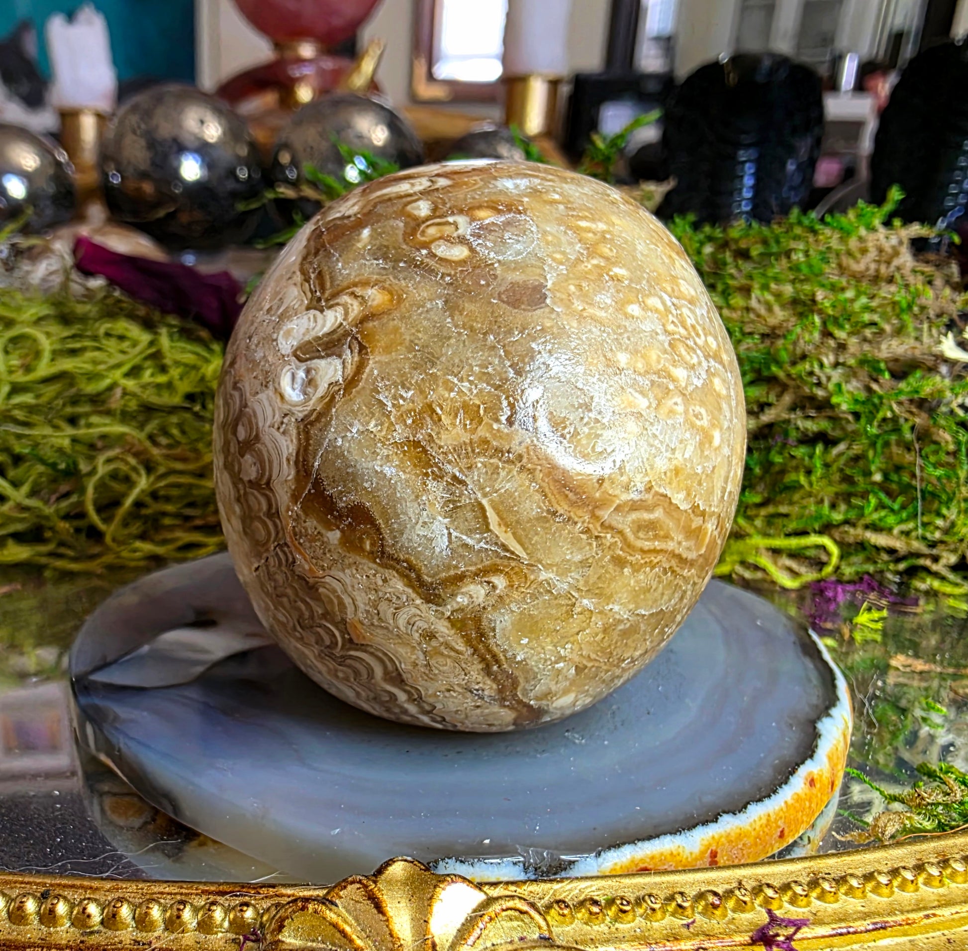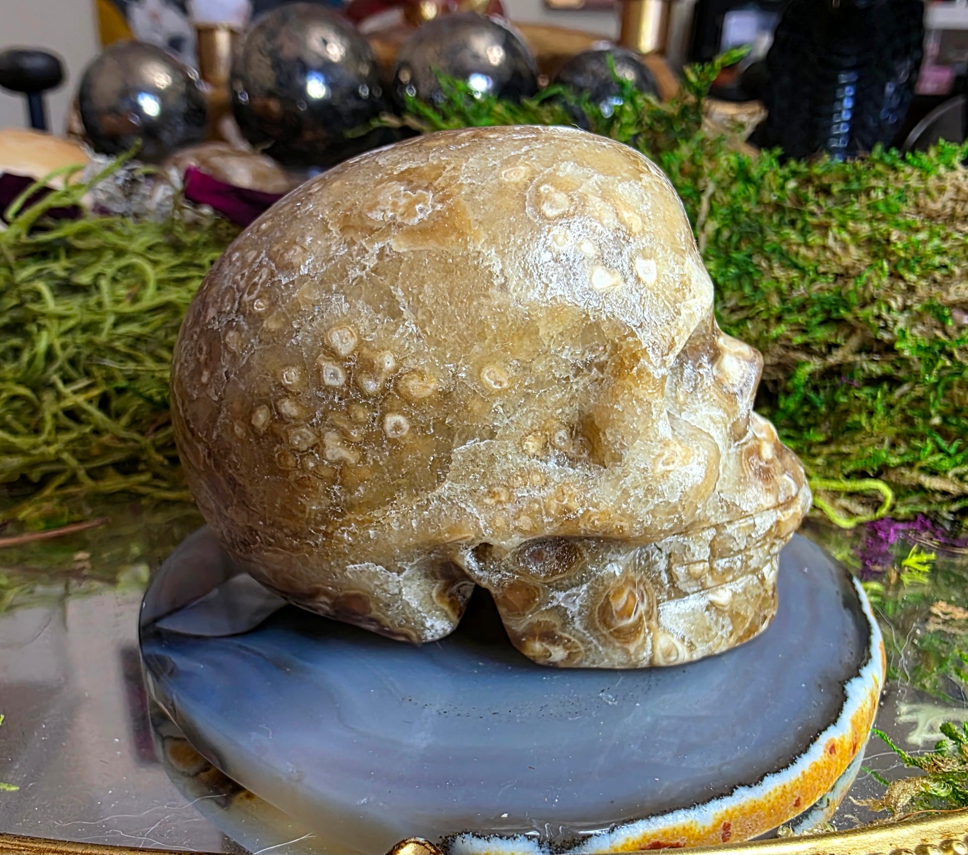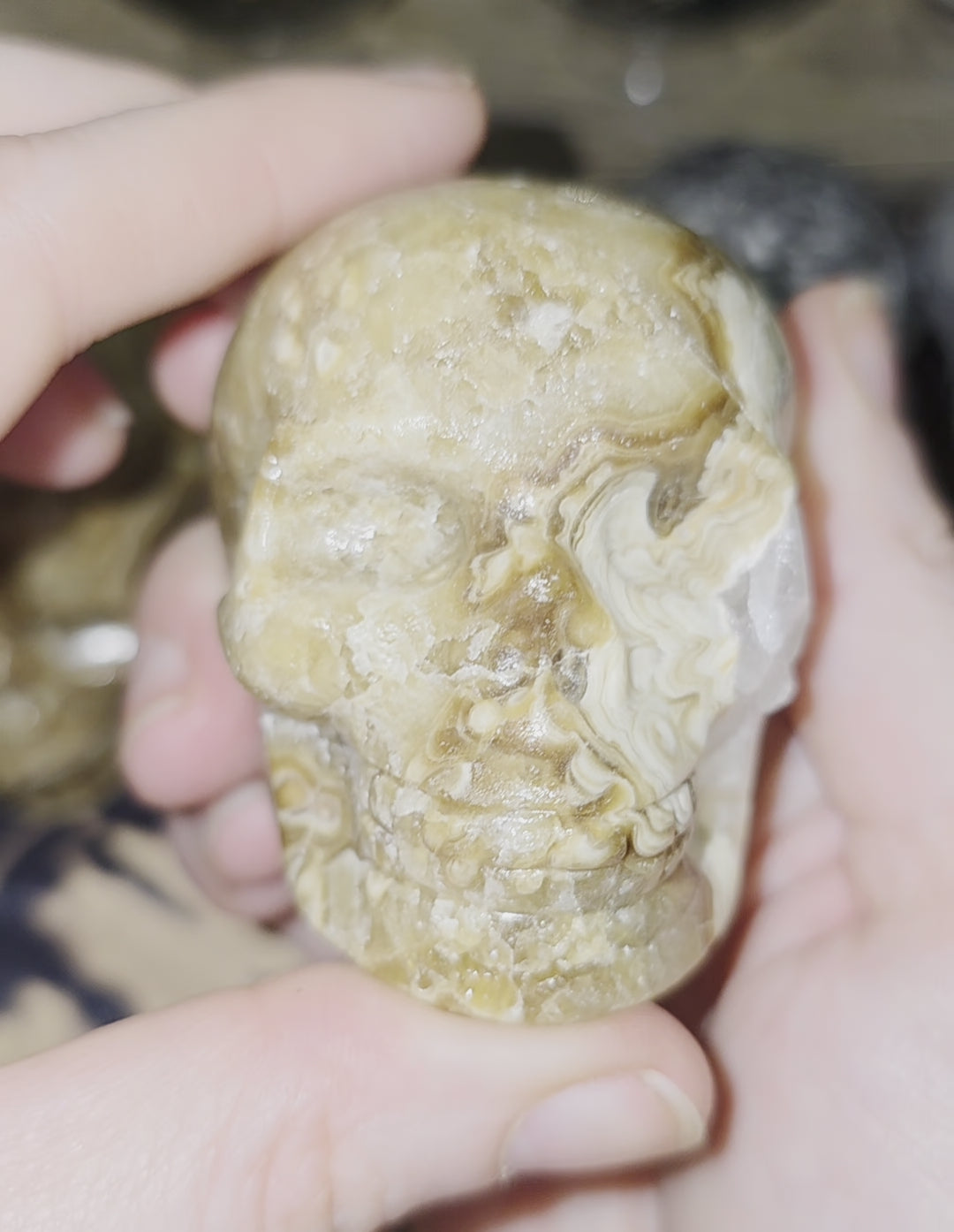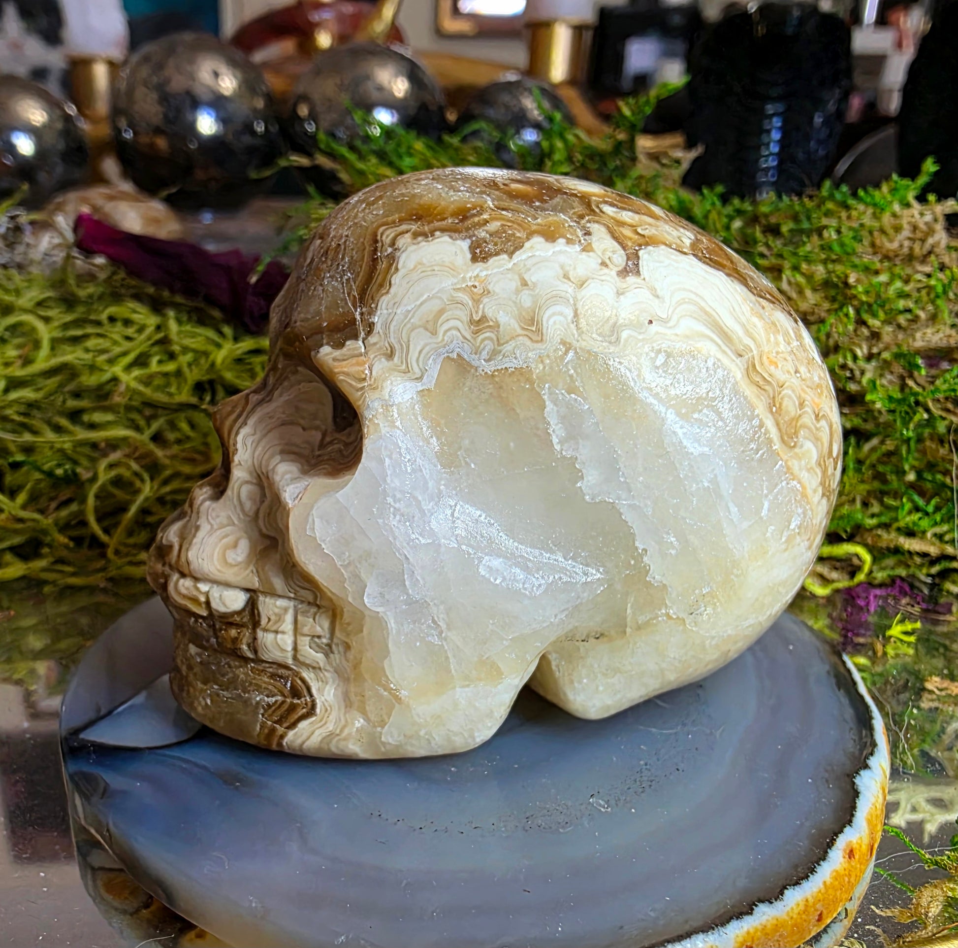 Beautifully banded chocolate calcite that has been carved into a human skull.