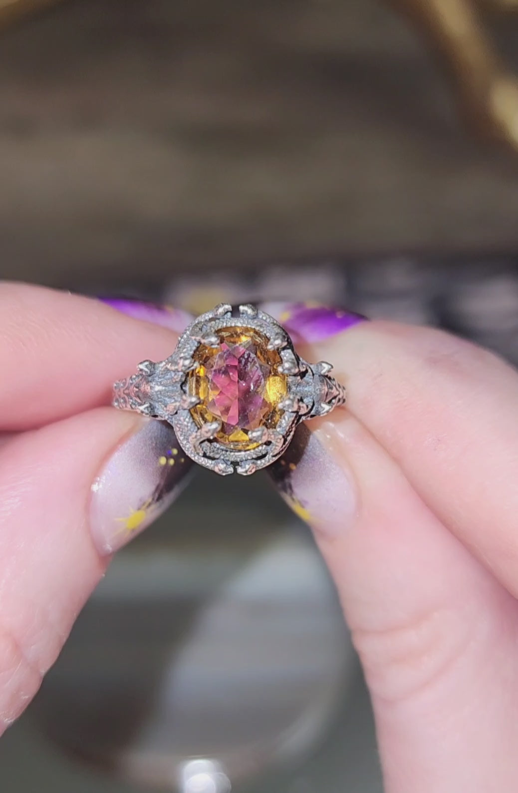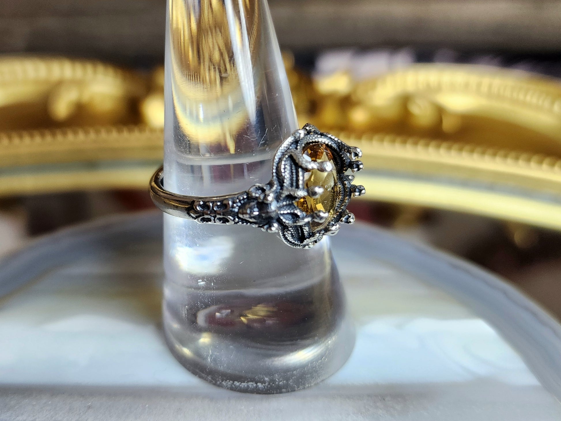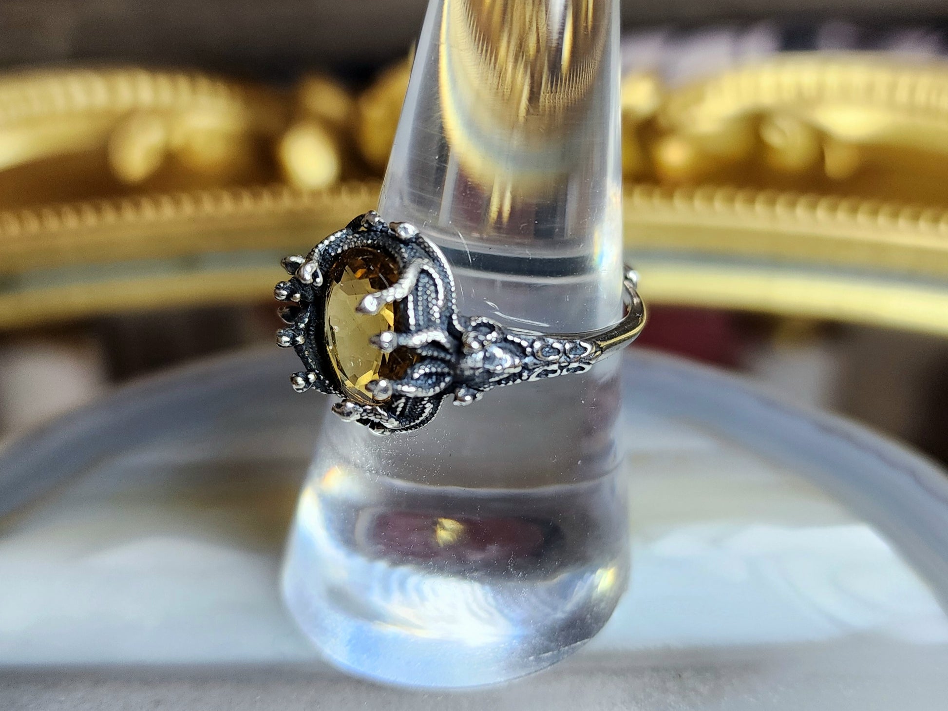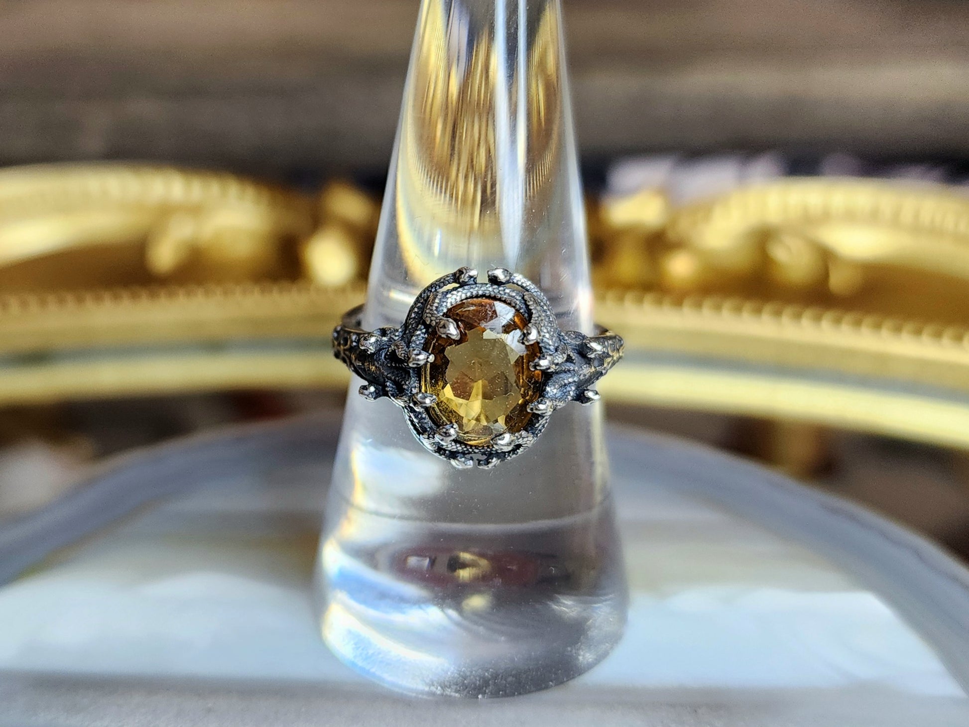 Faceted citrine set into an adjustable sterling silver ring with a Medusa design.