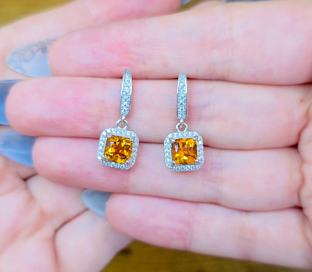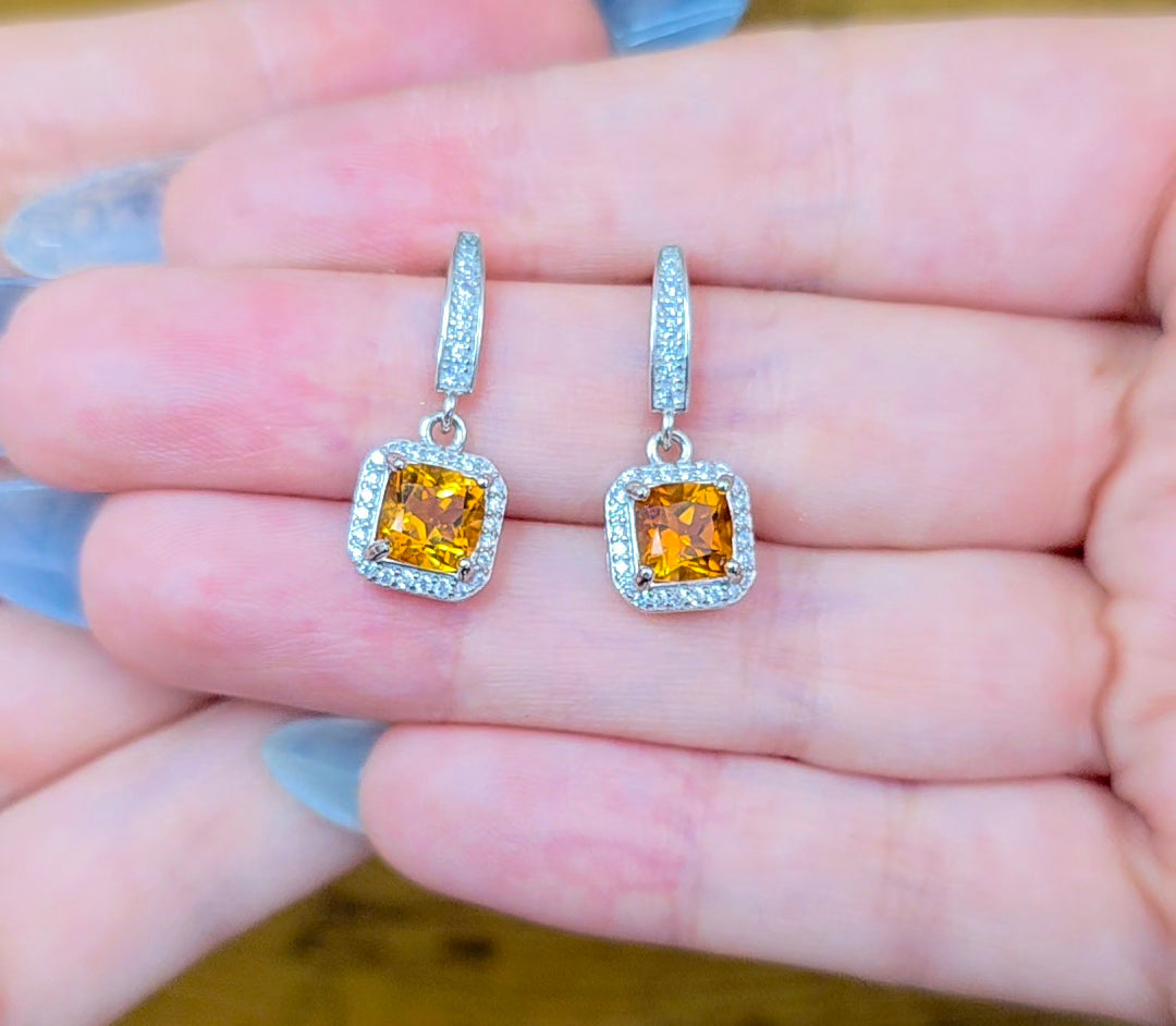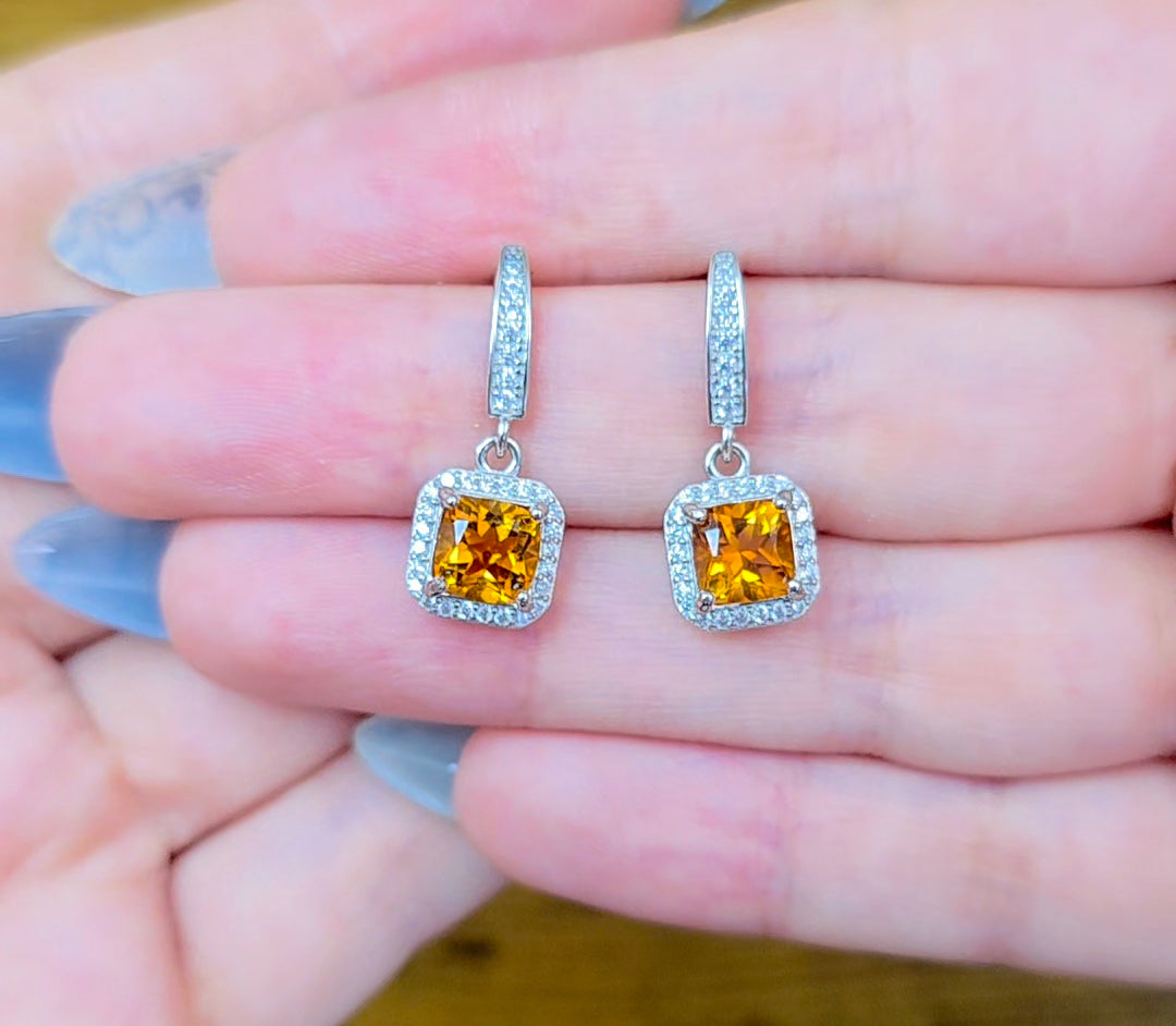 These sterling silver post earrings feature 6mm faceted, square cut, citrine crystals and zircon accent stones. They are approximately .9 inches long.