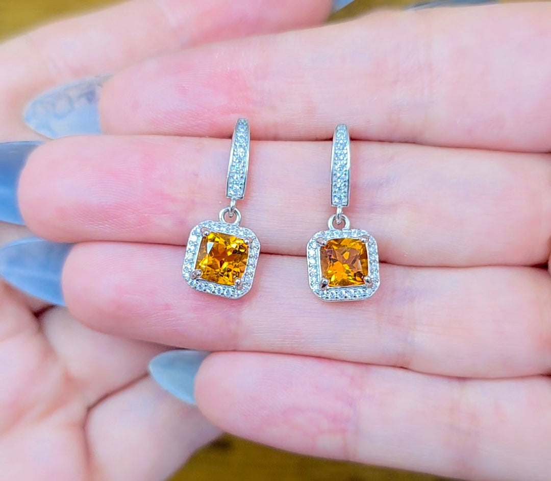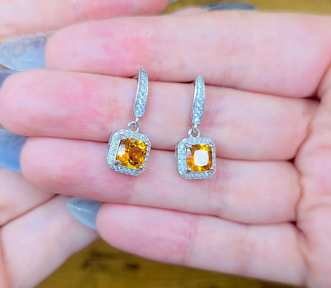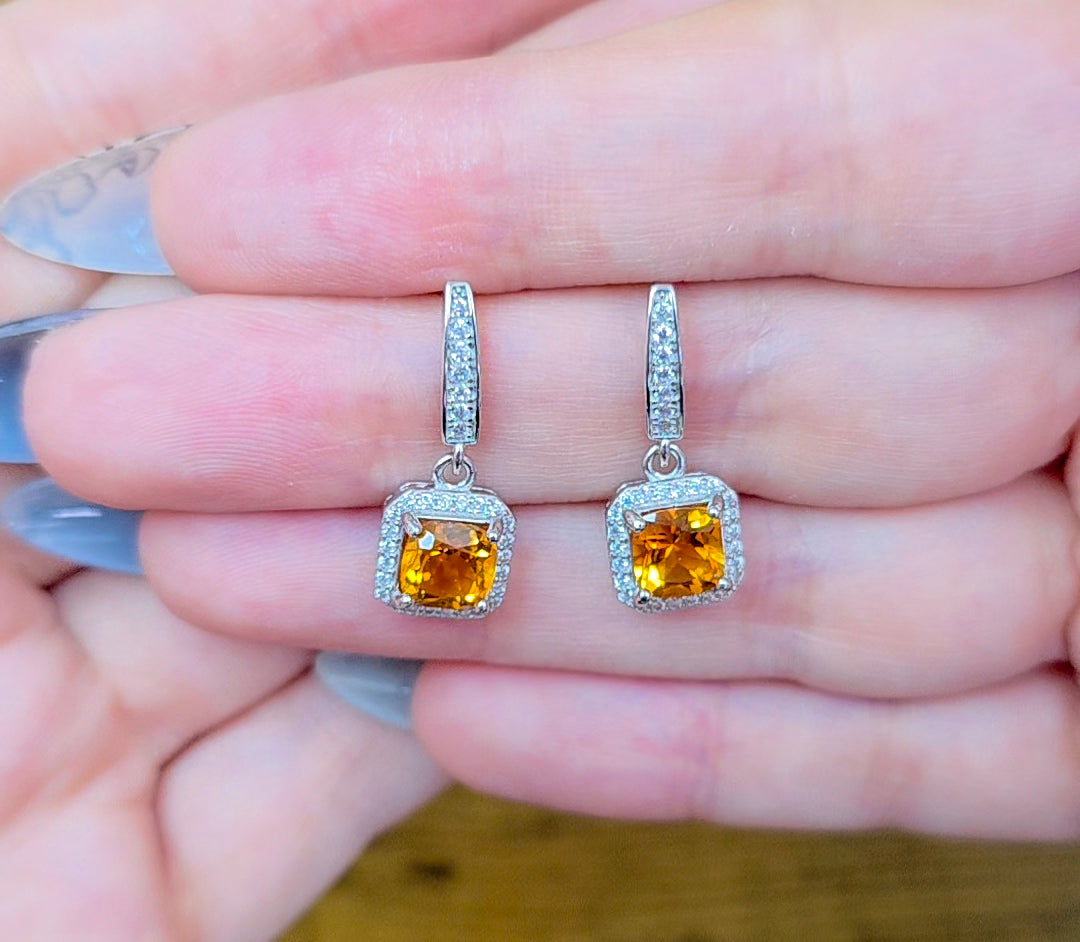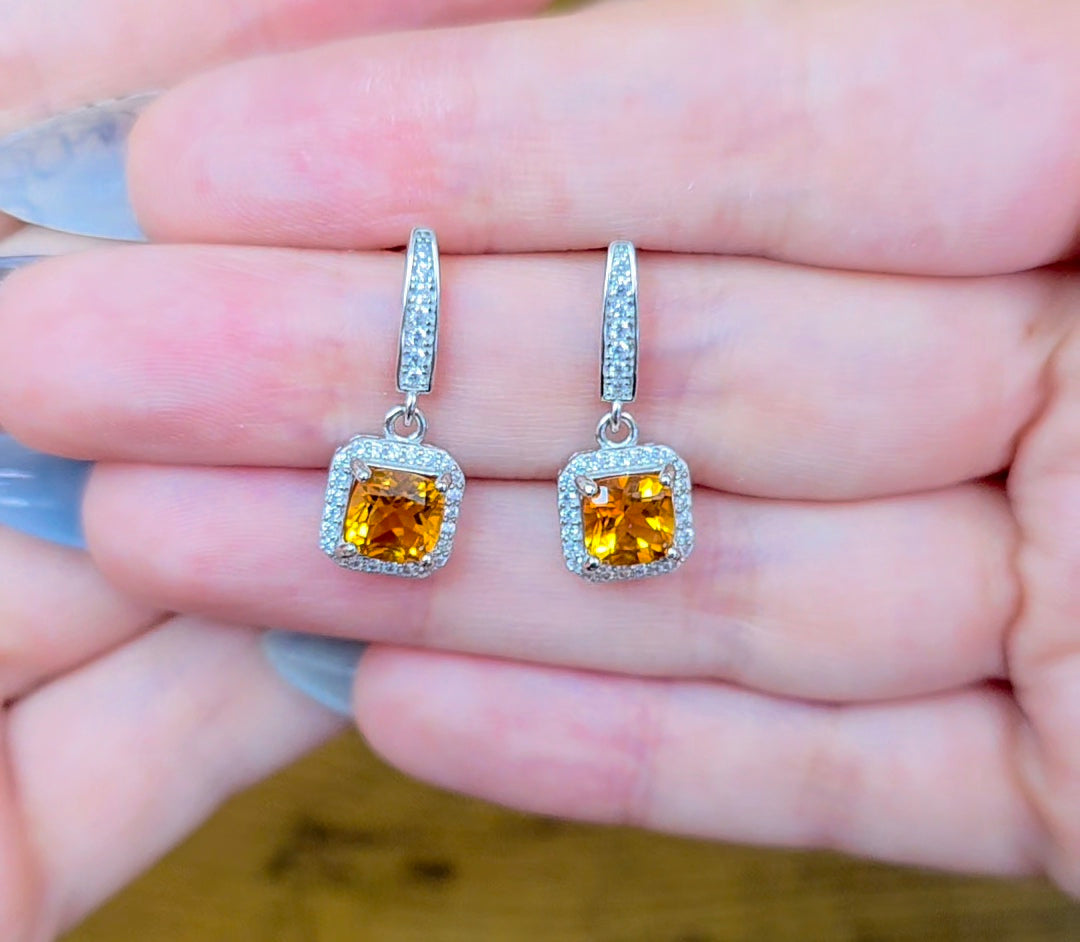 These sterling silver post earrings feature 6mm faceted, square cut, citrine crystals and zircon accent stones. They are approximately .9 inches long.