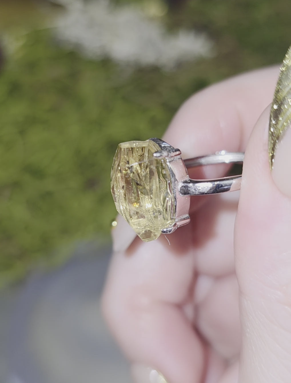 Faceted citrine freeform with black hollandite inclusions set into an adjustable sterling silver ring.