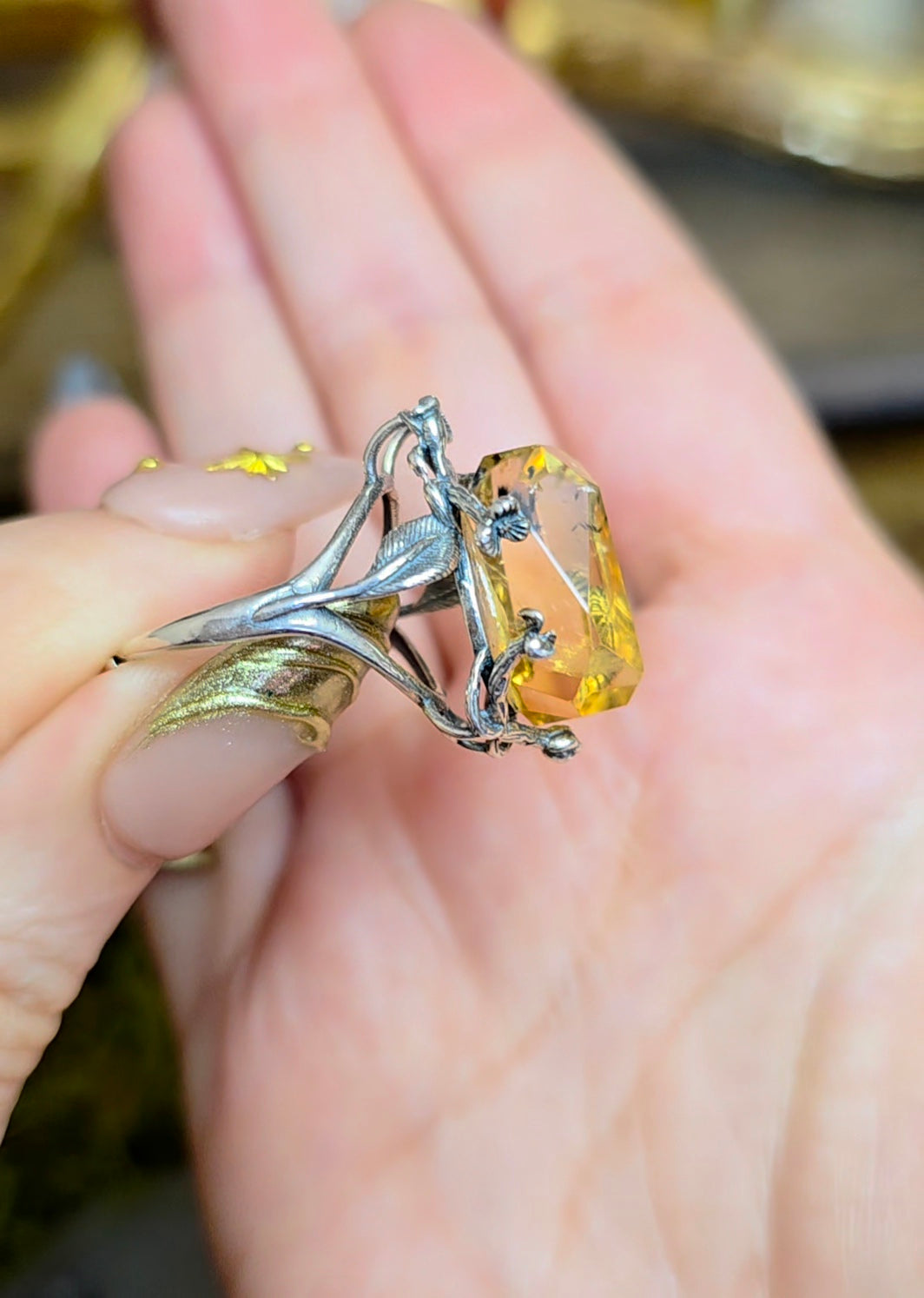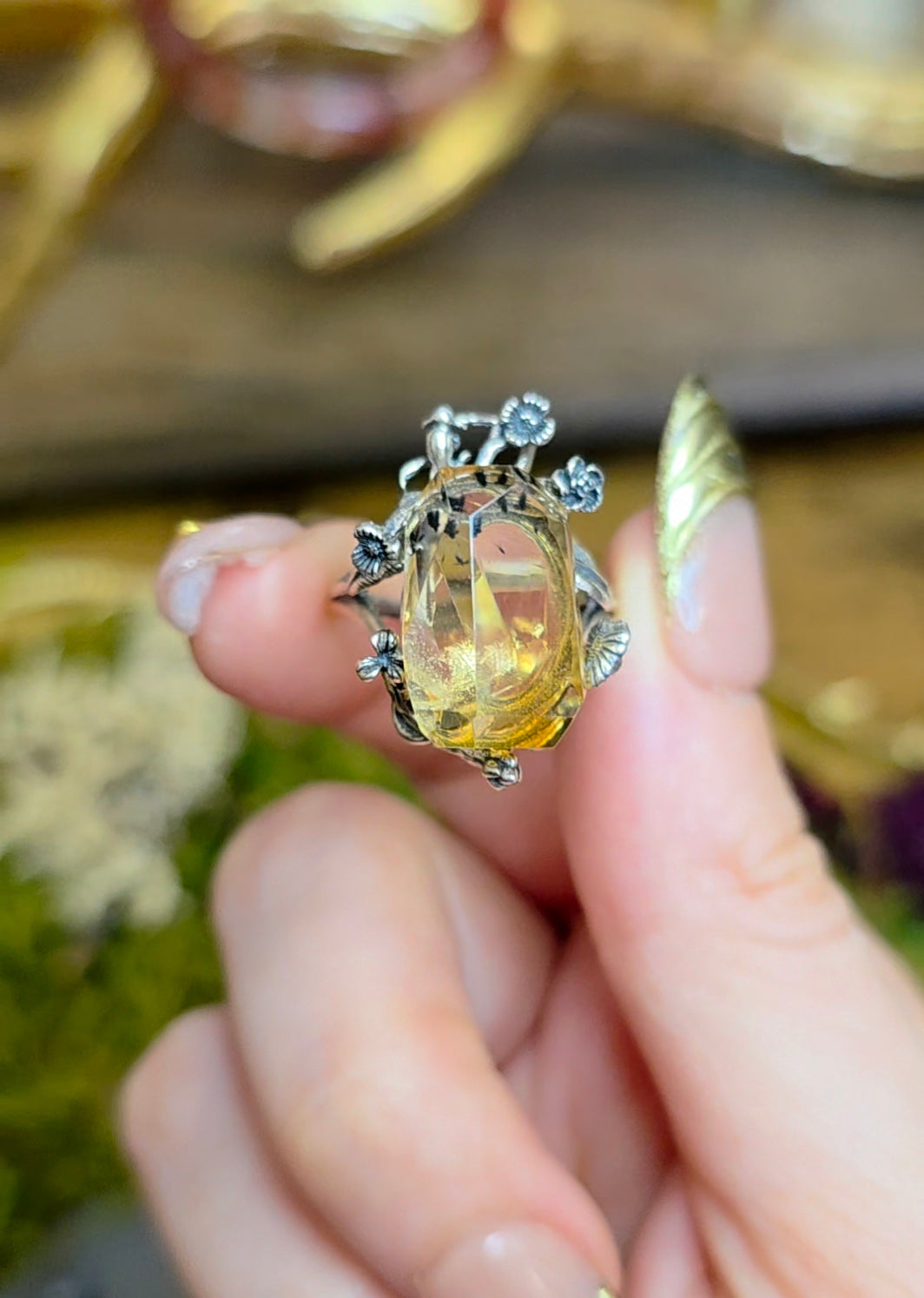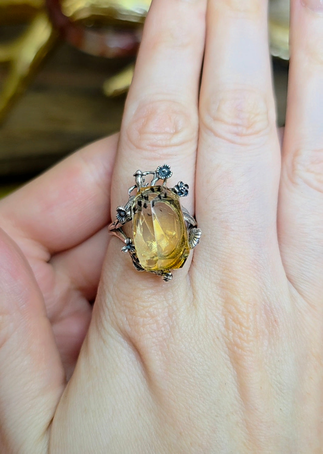 17 x 11mm faceted citrine freeform with black hollandite inclusions set into an adjustable sterling silver ring with a floral design.