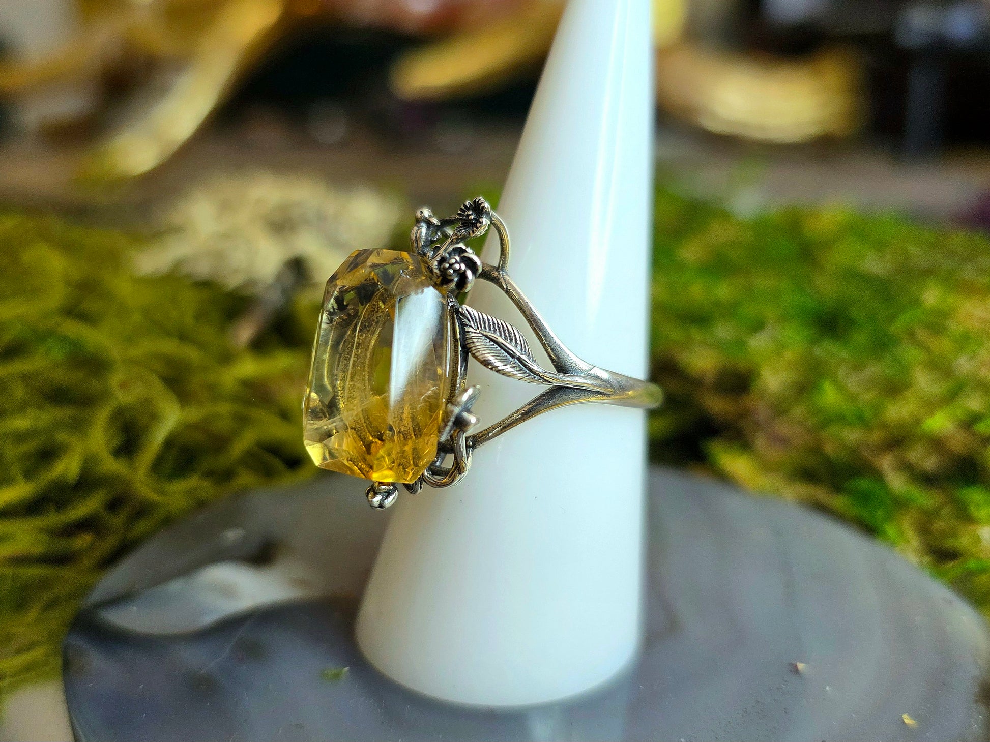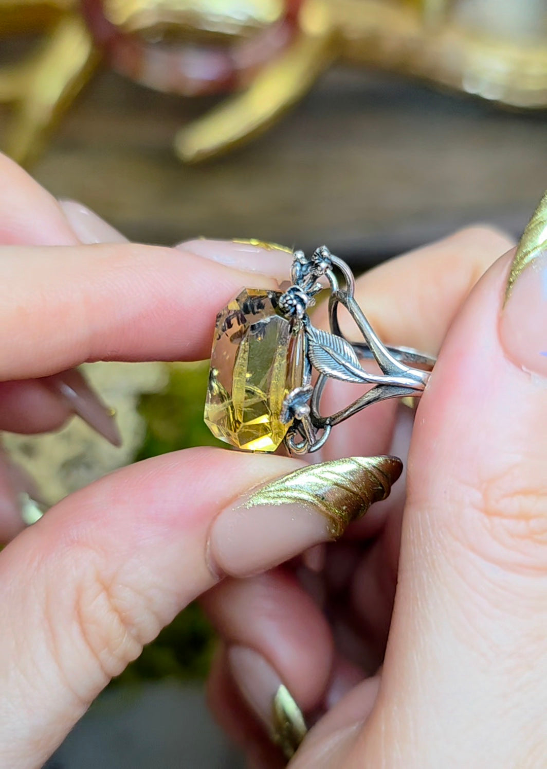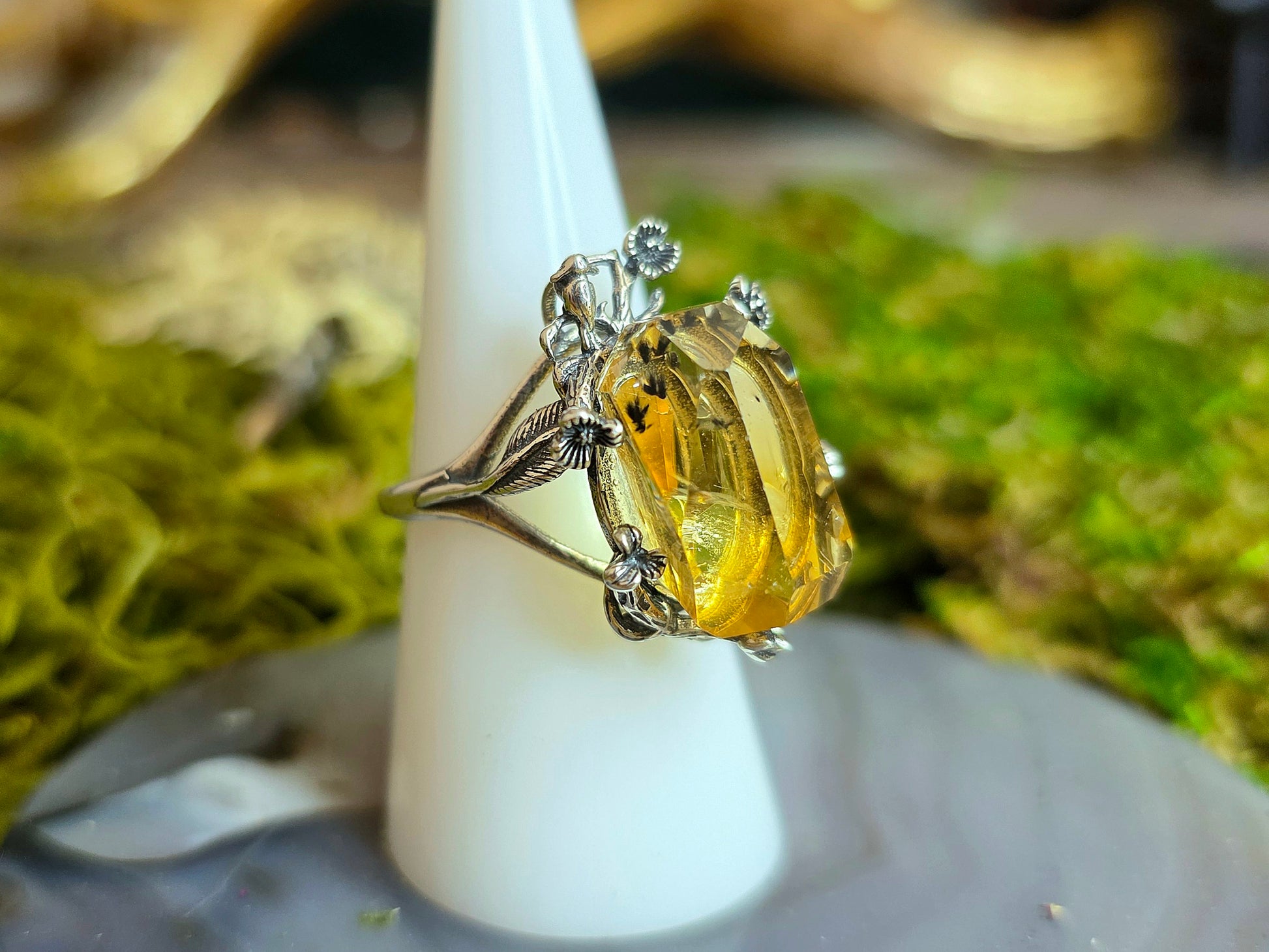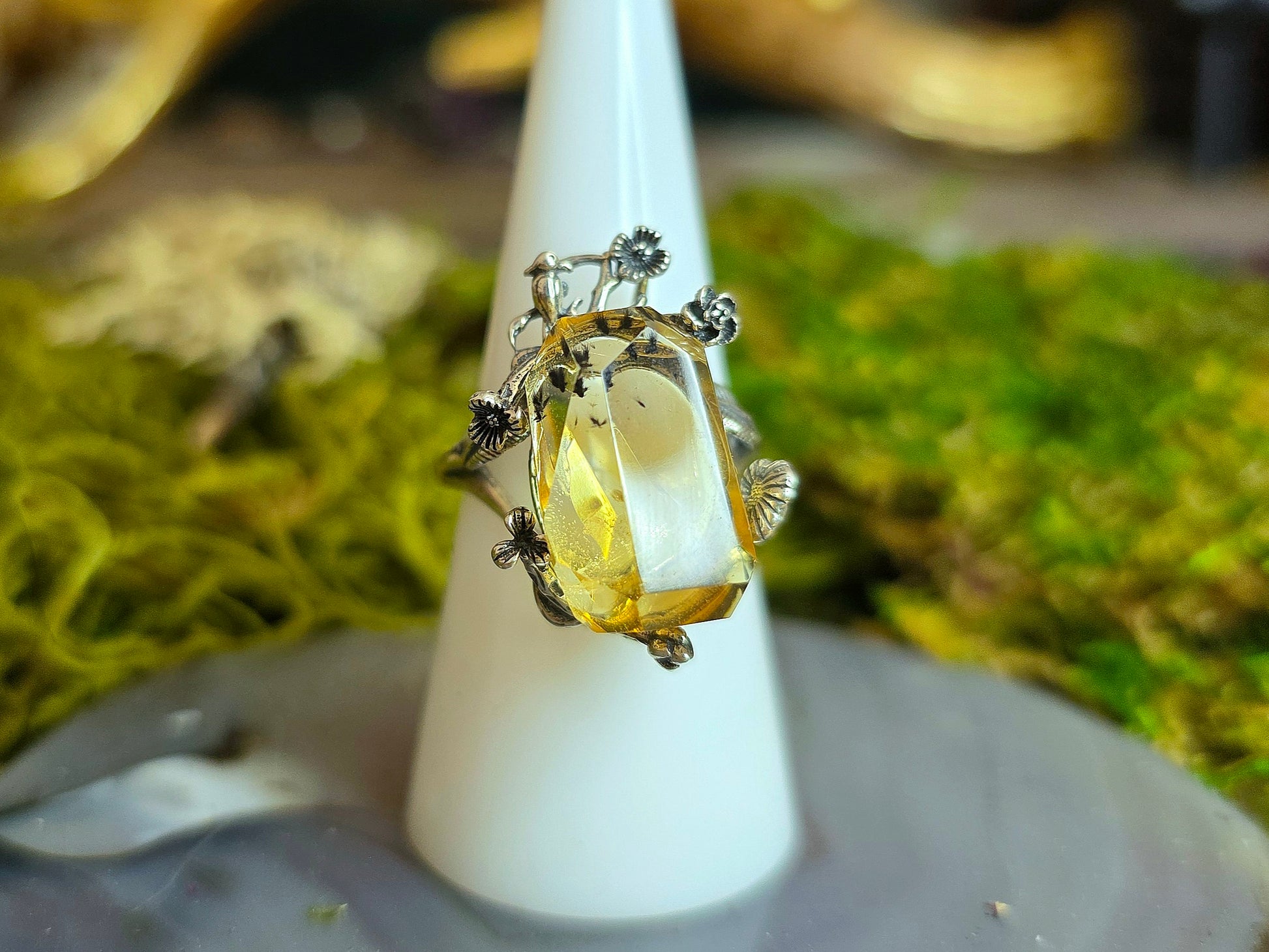 17 x 11mm faceted citrine freeform with black hollandite inclusions set into an adjustable sterling silver ring with a floral design.