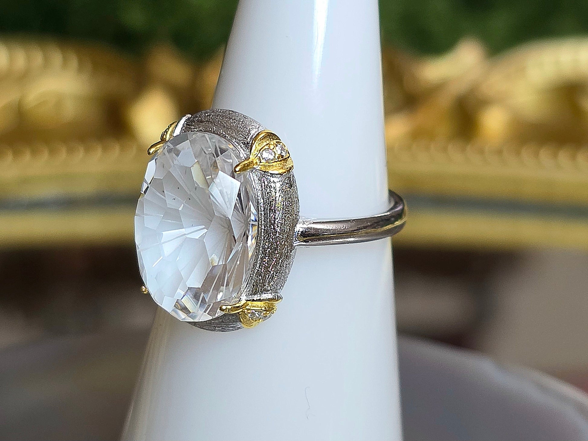 14x10mm faceted clear quartz with an under cutting of a sari flare set on an adjustable brushed sterling silver ring with some gold plating.