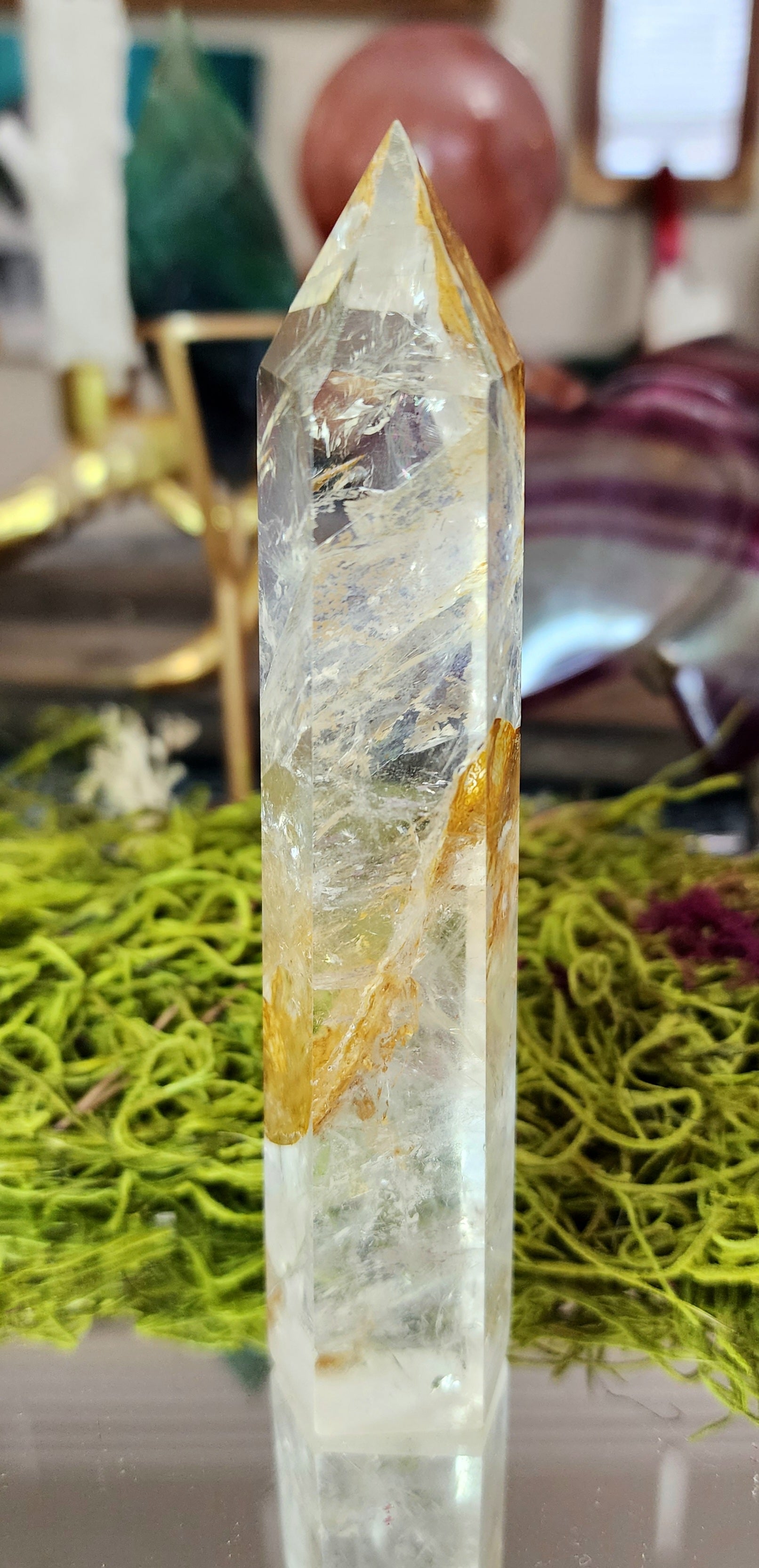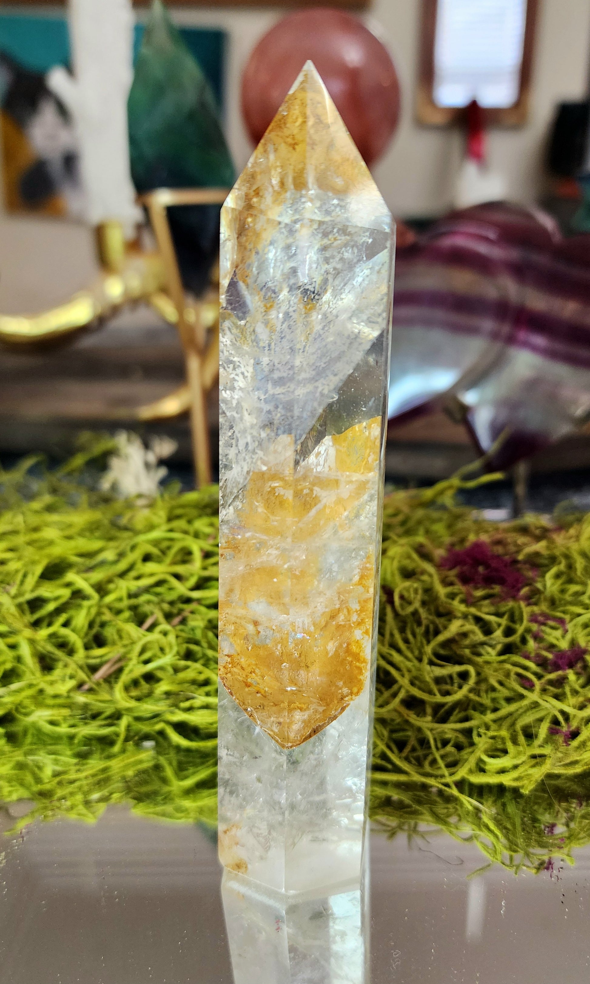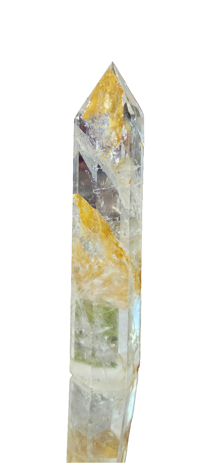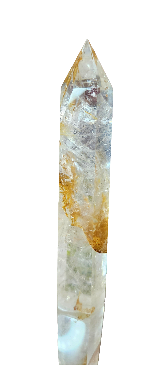 6 sided clear quartz tower with rainbows and iron inclusions
