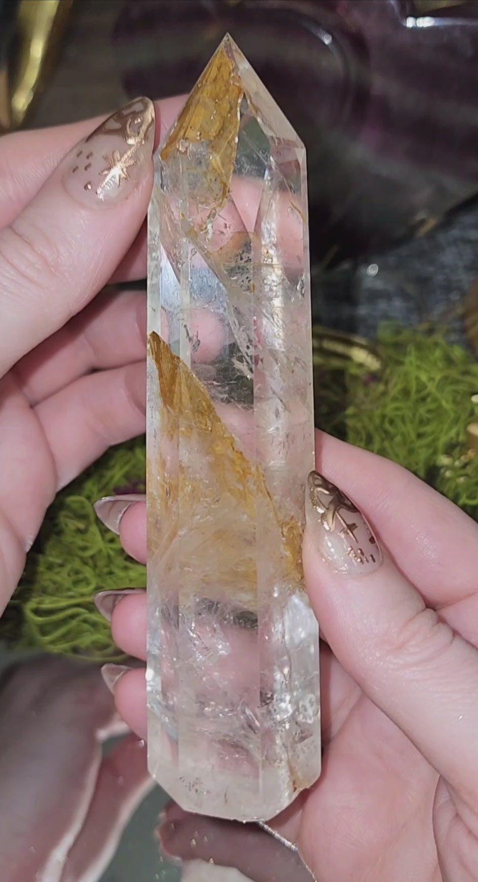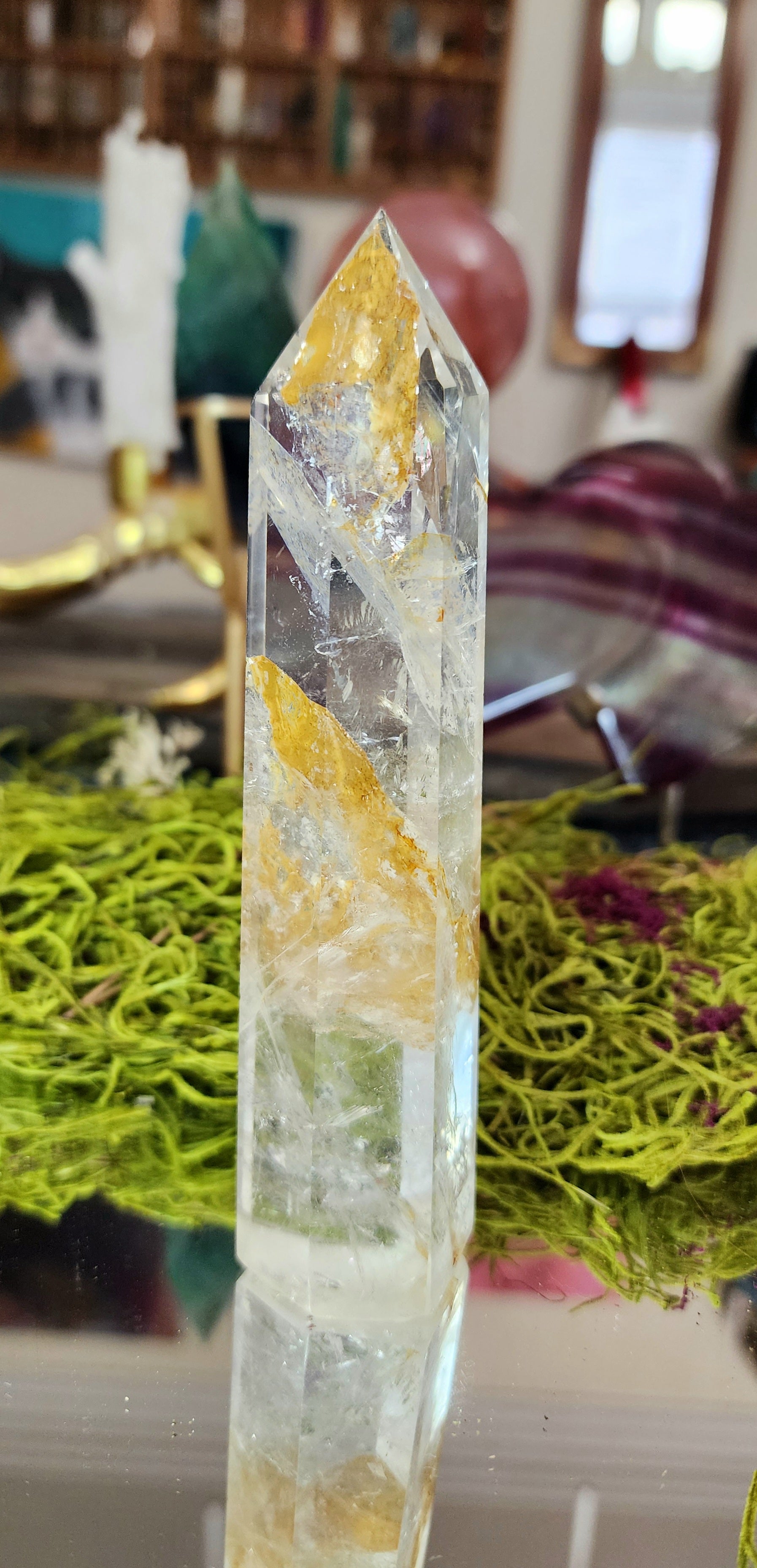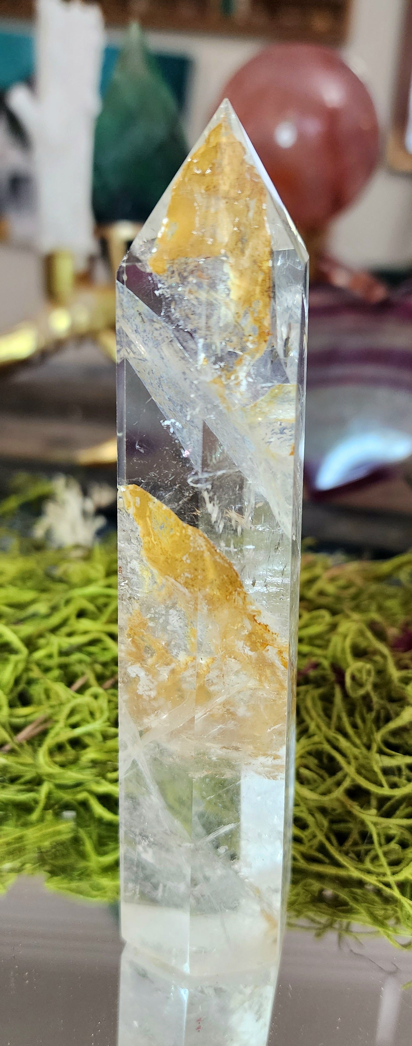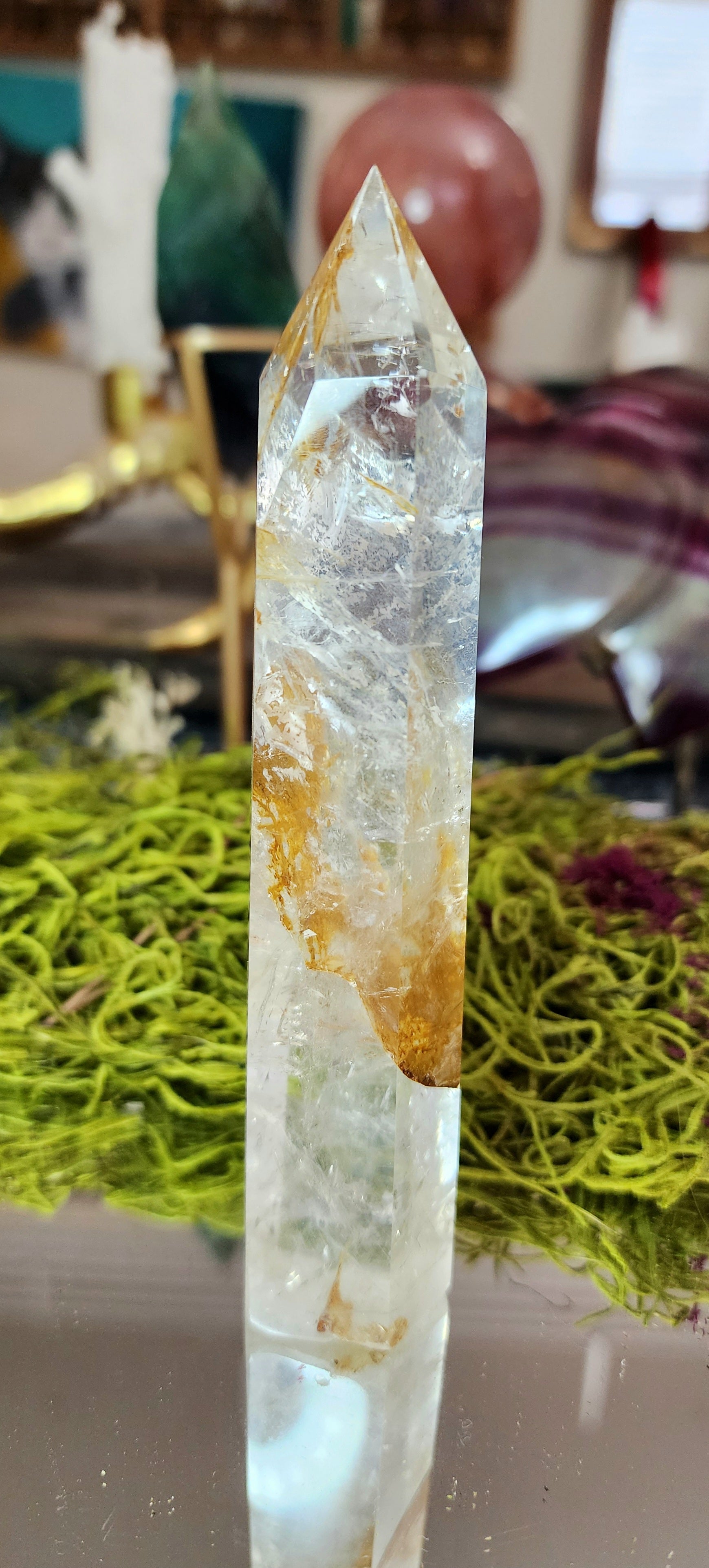 6 sided clear quartz tower with rainbows and iron inclusions
