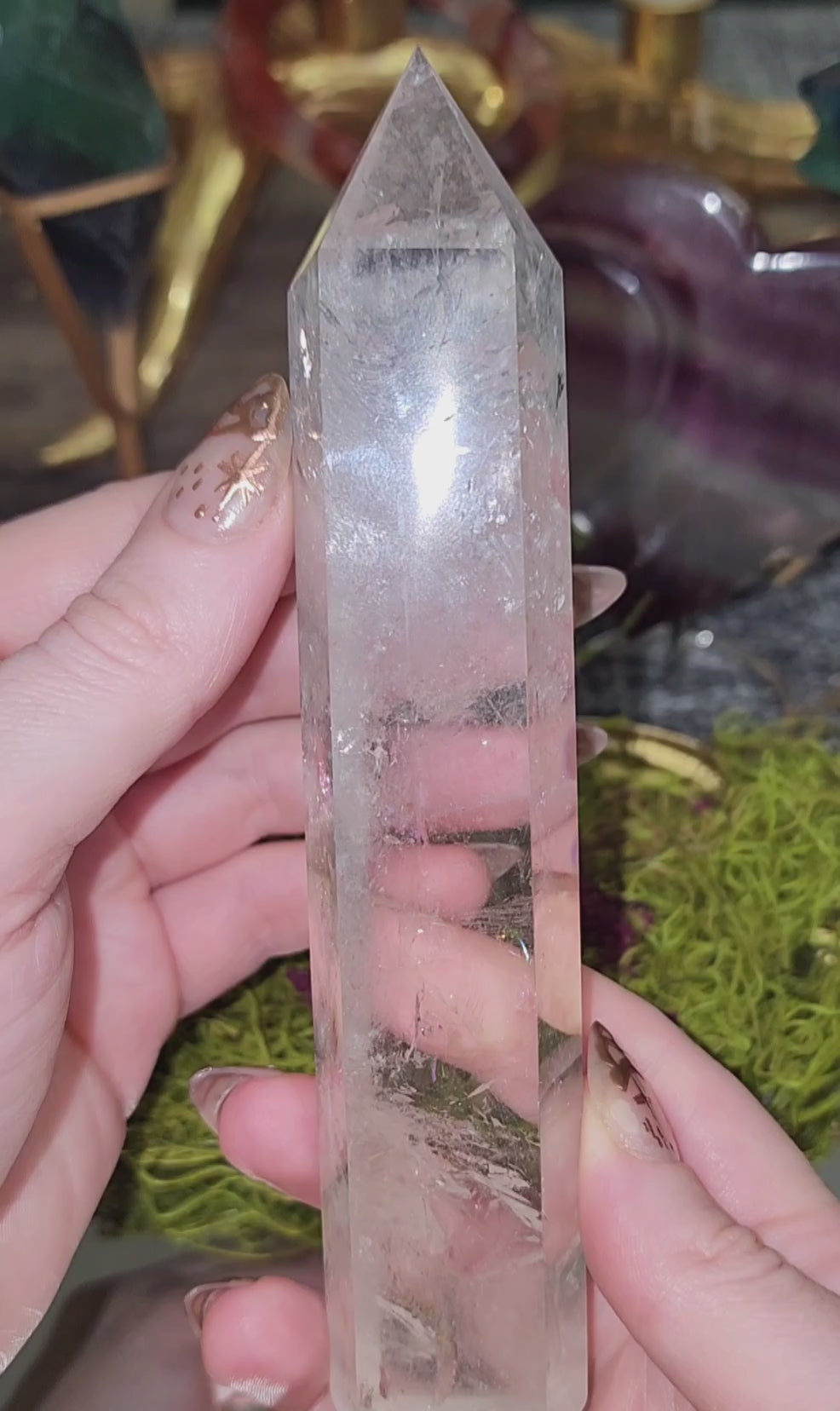 6 sided clear quartz tower with rainbows and iron inclusions