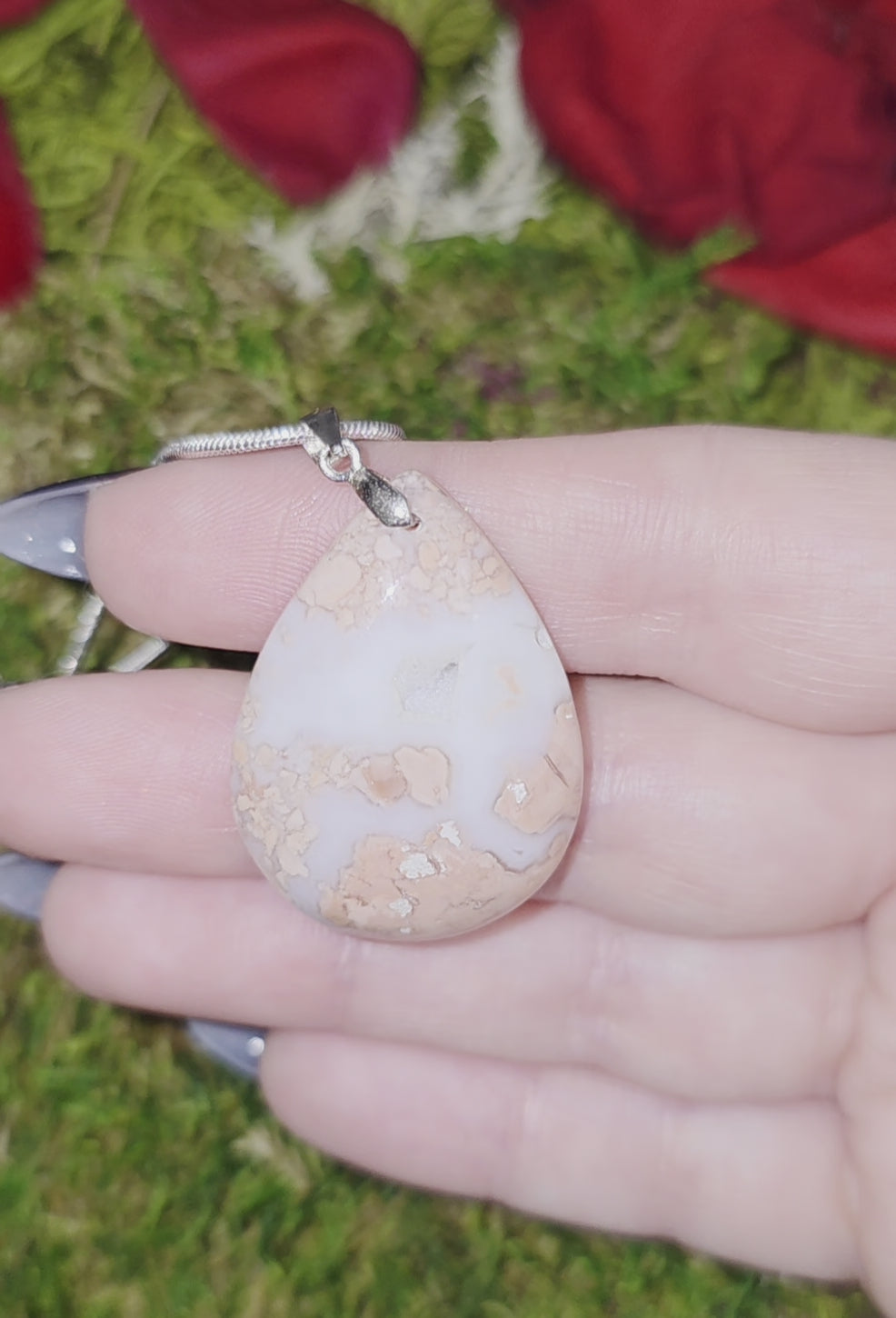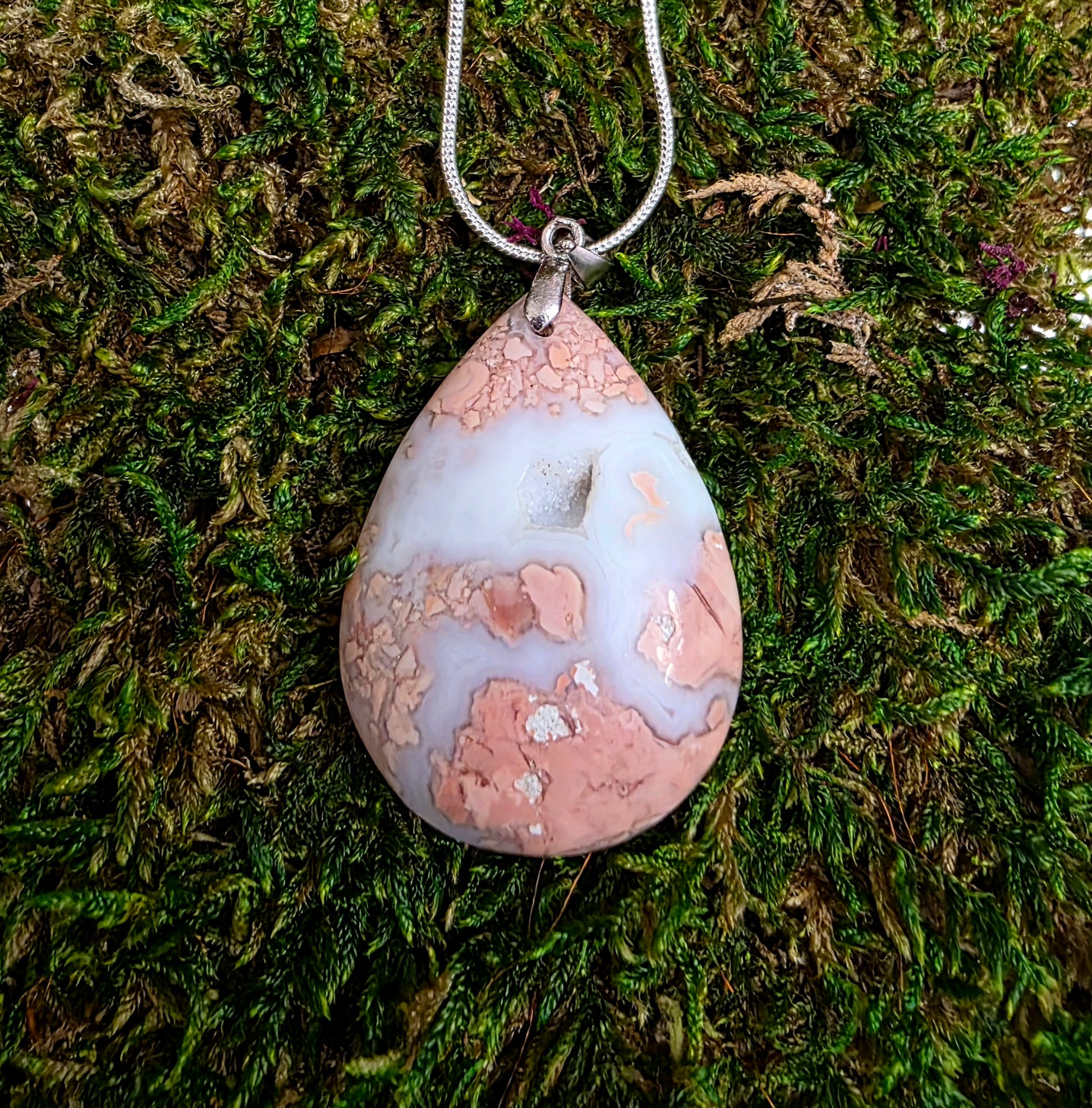 This piece features a druzy pockets and beautiful Pink and white banding. The pendant is about 1.5 inches long, has a sterling silver pendant bail, and comes with an 18 inch silver plated steel chain.